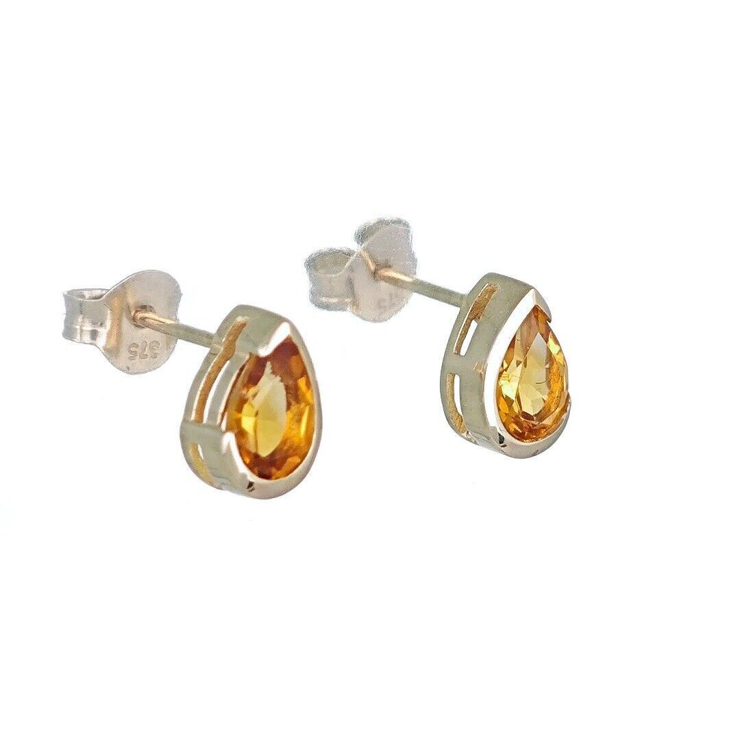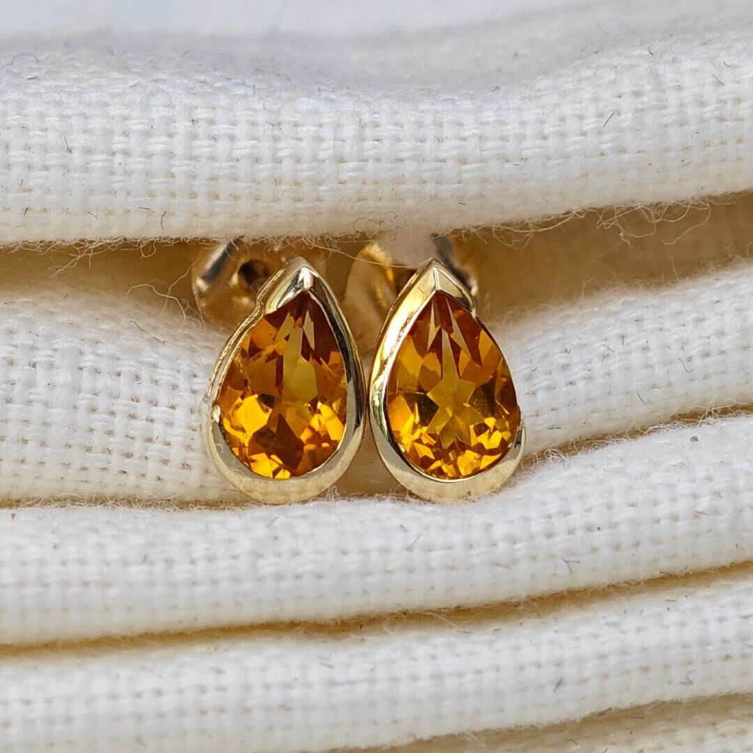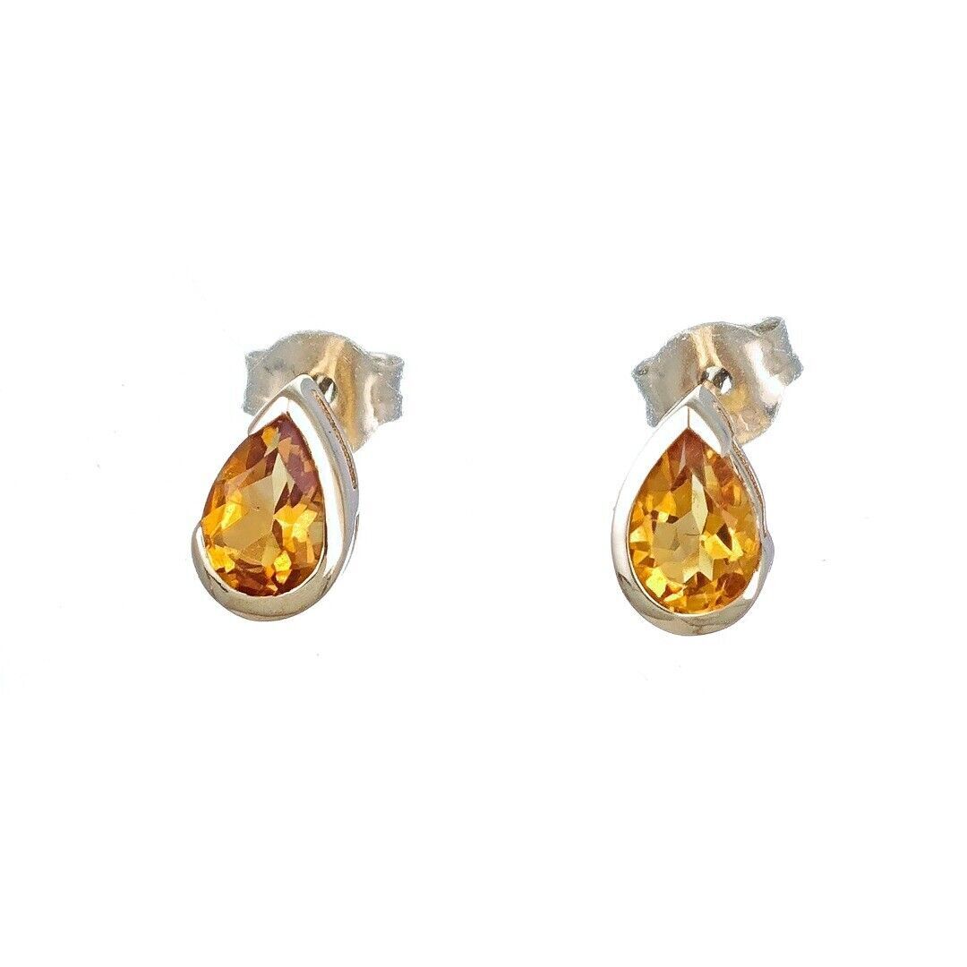 These elegant citrine pear stud earrings are designed in the UK and feature natural citrine gemstones. The stones are set in a raised rubover setting made of 9ct Yellow Gold to allow light to the back of the stone and show off its natural sparkle. The stones measure 6x4mm.