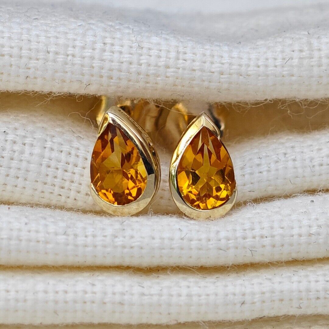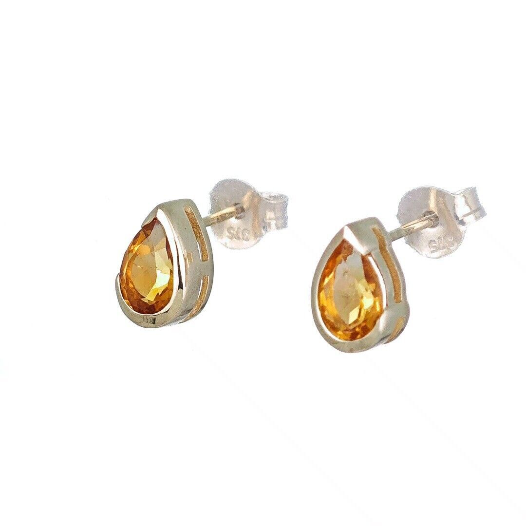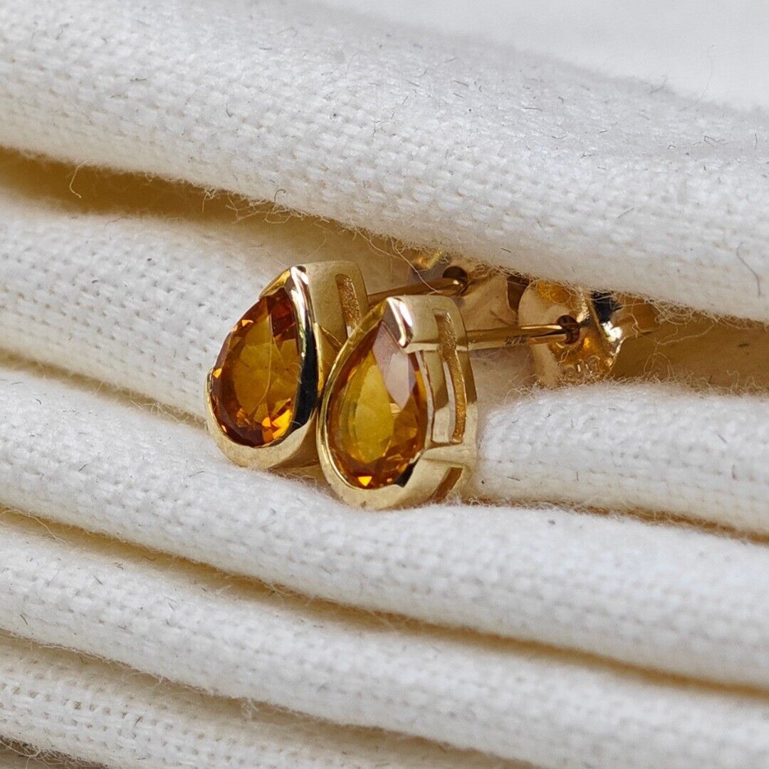 These elegant citrine pear stud earrings are designed in the UK and feature natural citrine gemstones. The stones are set in a raised rubover setting made of 9ct Yellow Gold to allow light to the back of the stone and show off its natural sparkle. The stones measure 6x4mm.