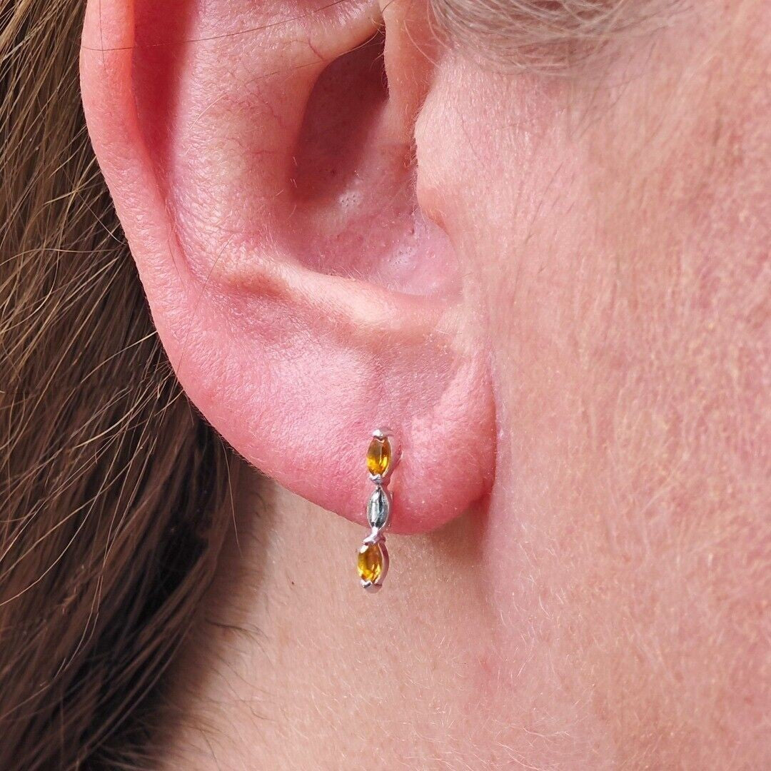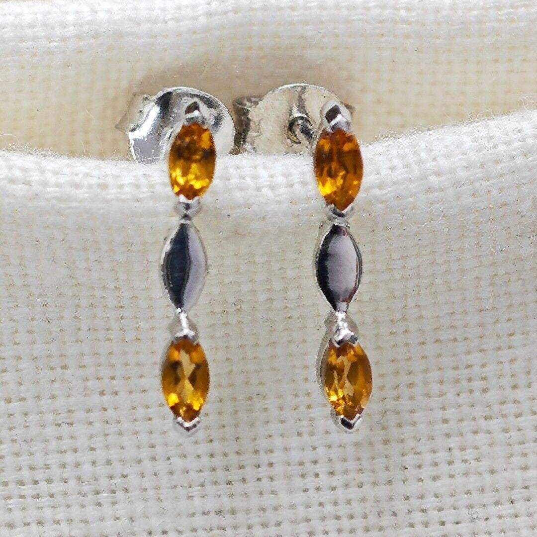 These exquisite earrings from Ojewellery are the perfect gift for any occasion, whether it's for a loved one's birthday, graduation, or engagement. The studs are made of sterling silver and adorned with four natural yellow citirine gemstones in a marquise shape. Citrine are associated with joy and energy. They are the birthstone for November.. The closure of the earrings is butterfly-shaped and the earrings sit comfortably on the ear lobe. The earrings are handmade and signed with the Ojewellery ring logo. They come with a seller warranty and a brief message can be included in the informational card that is attached to the included gift bag. These earrings are a stunning addition to any jewellery collection and are sure to be cherished by the recipient.