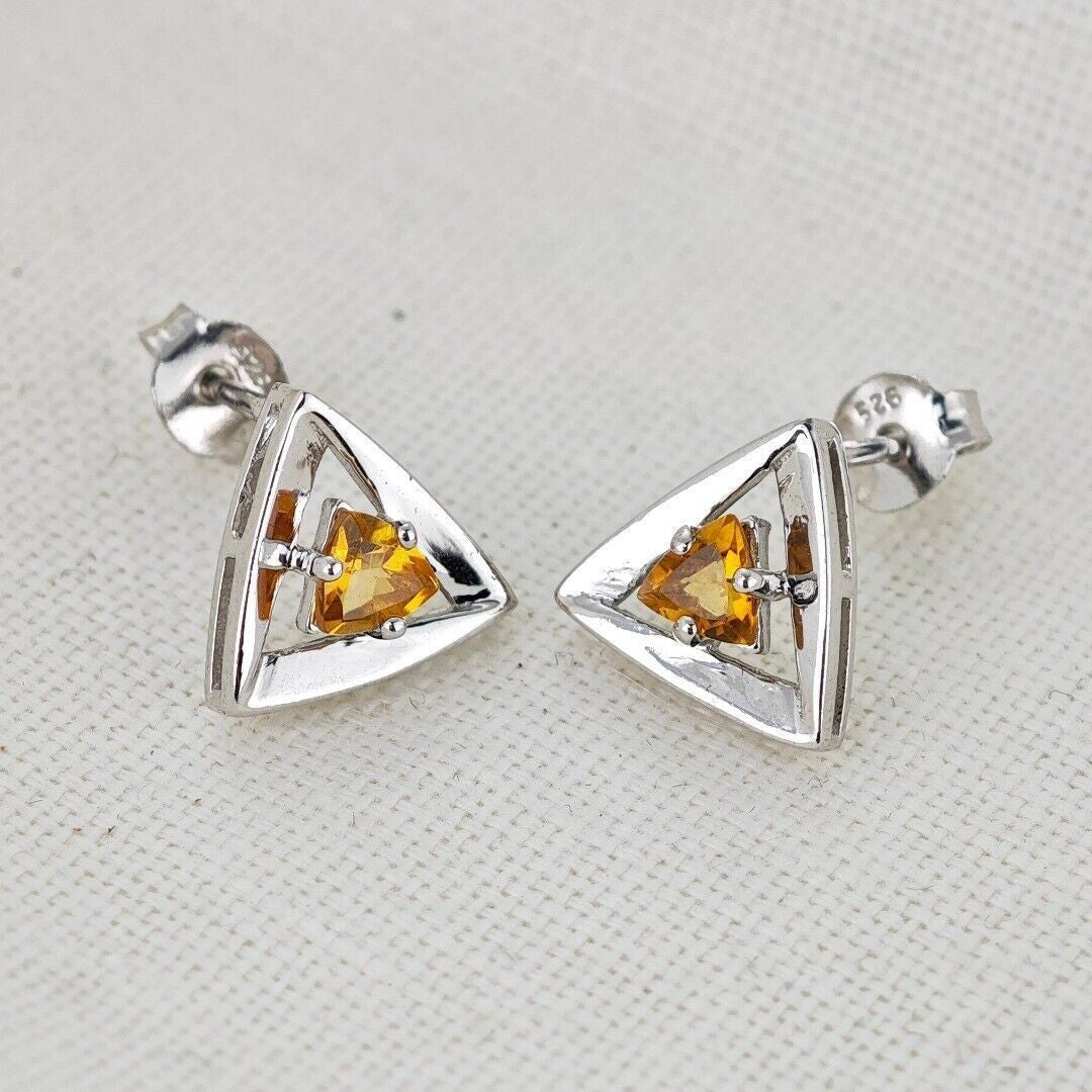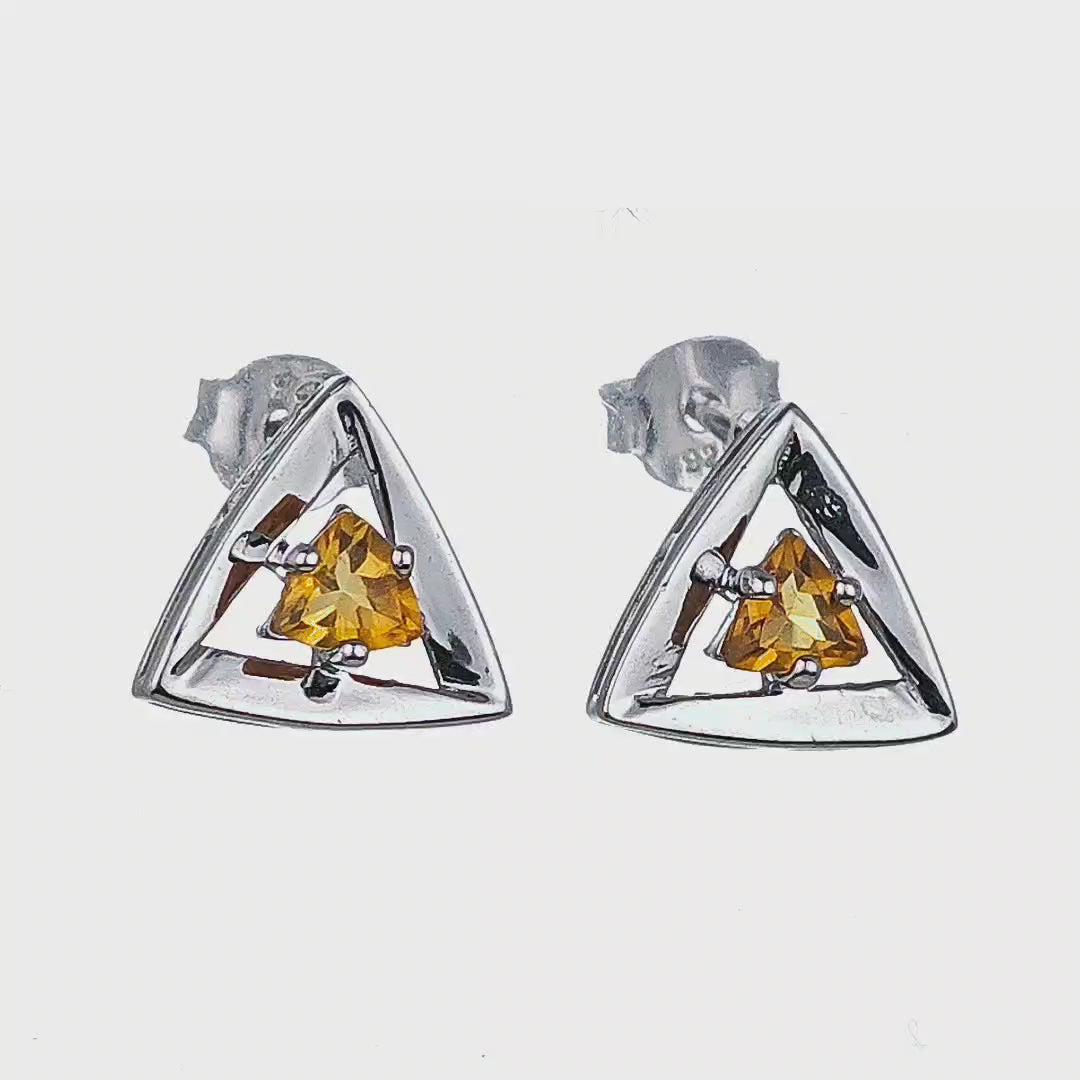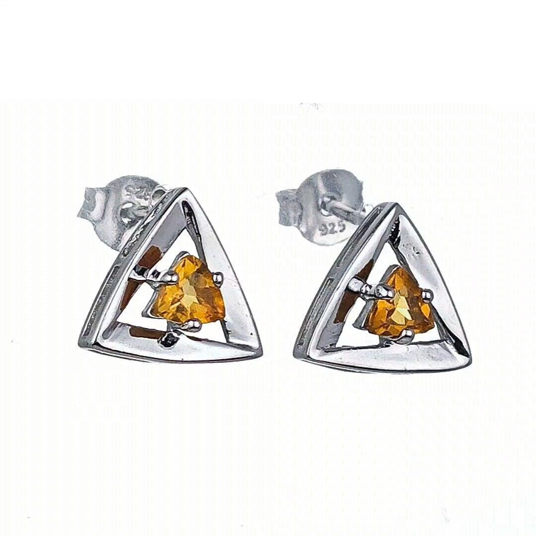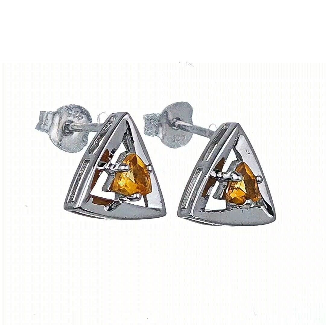Elegant stud earrings of trillion cut citrine set in a triangle made of sterling silver. The natural yellow citrine are from Africa. Each stone measures 4 x 4mm