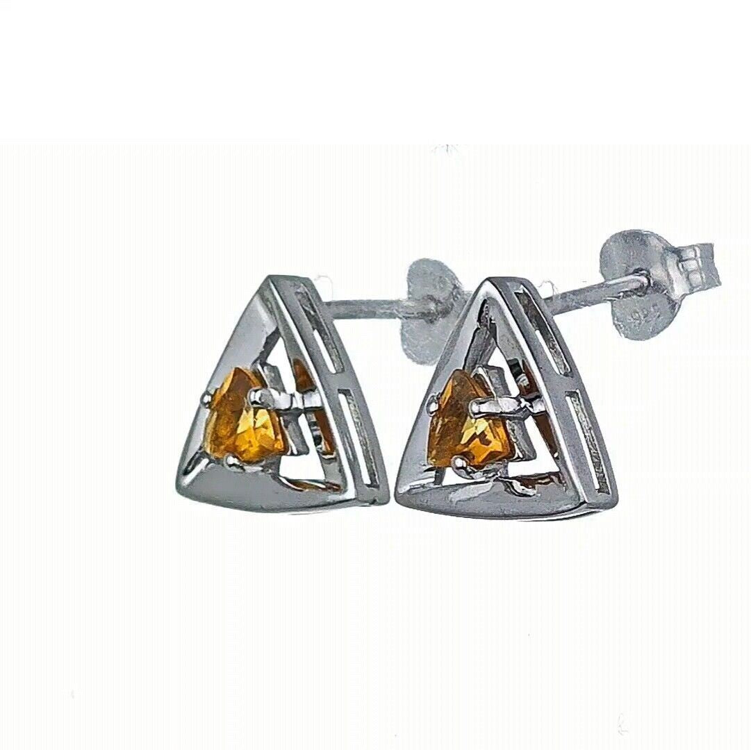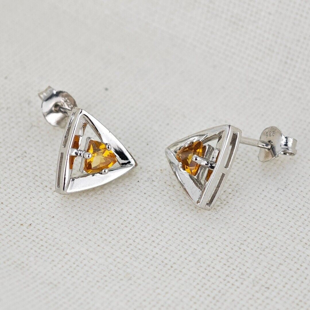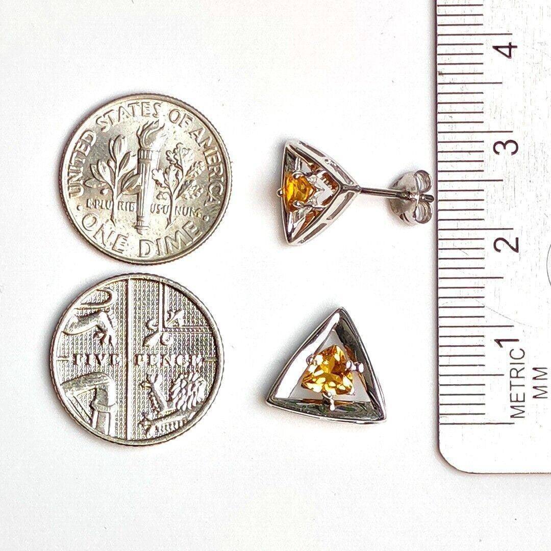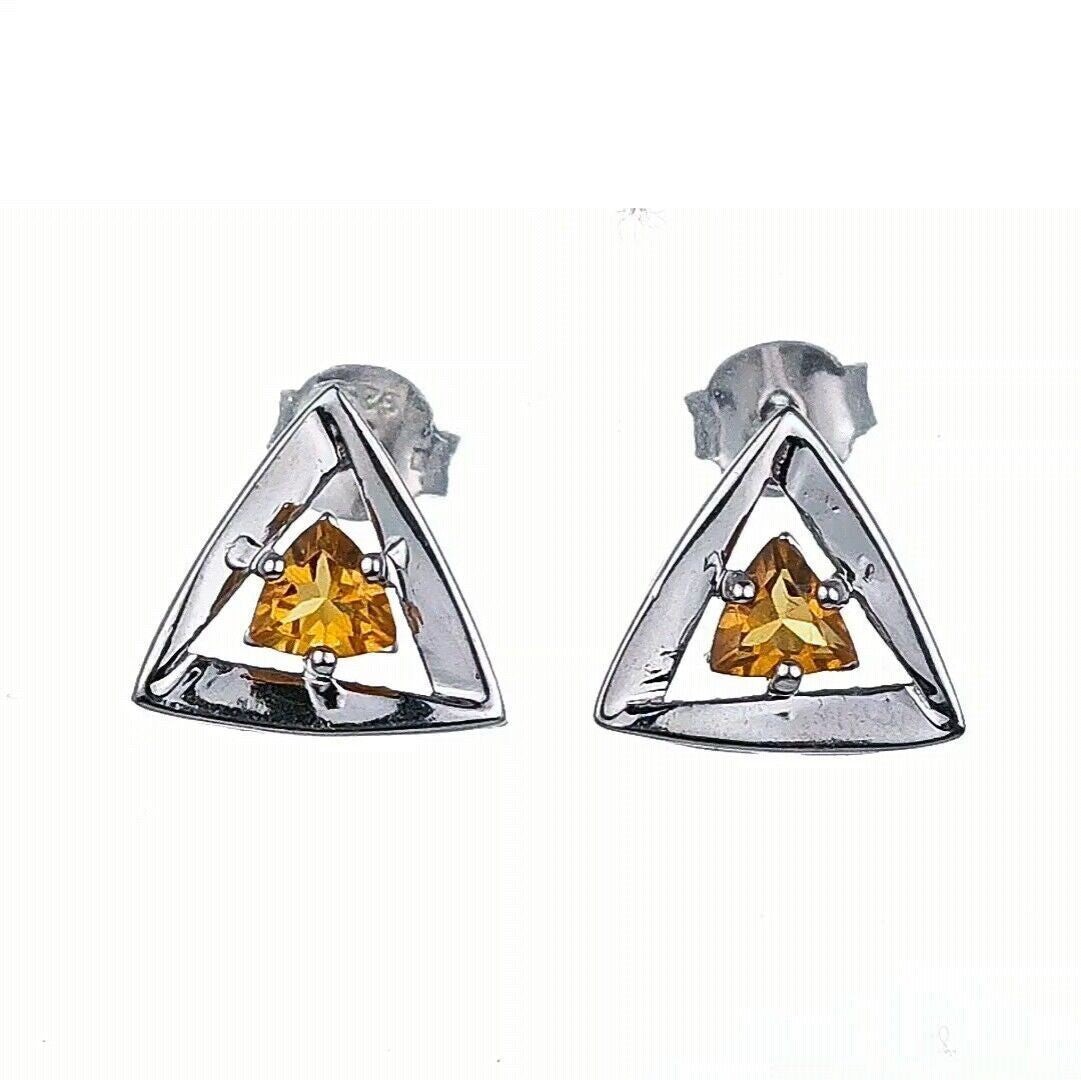 Elegant stud earrings of trillion cut citrine set in a triangle made of sterling silver. The natural yellow citrine are from Africa. Each stone measures 4 x 4mm