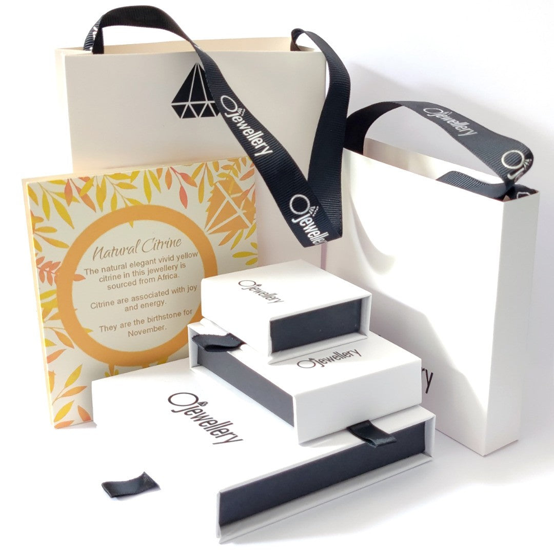 Supplied in an Ojewellery presentation box, within a ribbon handled gift bag, complete with product information authenticity card with space for a gift message and a jewellery cleaning cloth to keep your jewellery in ready to wear condition.