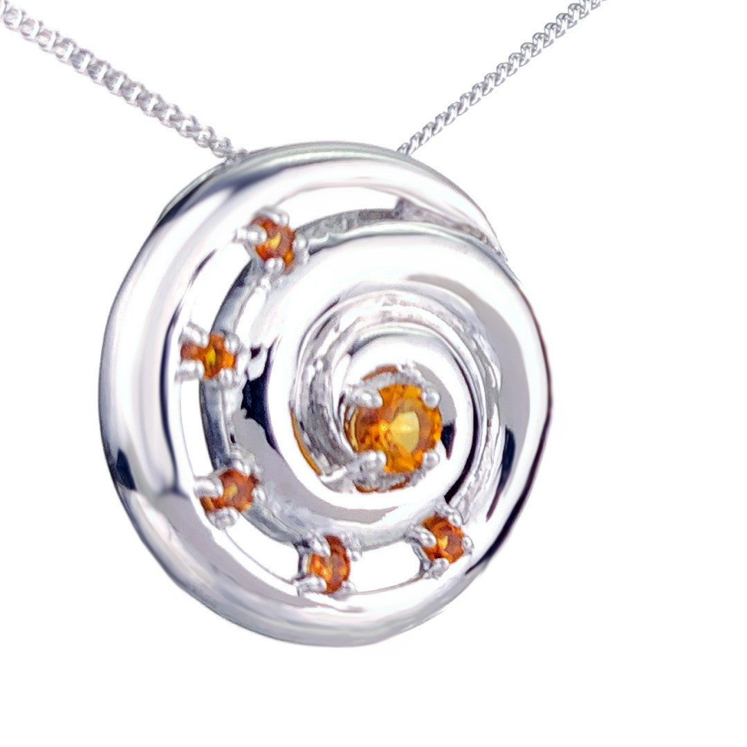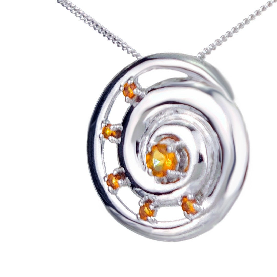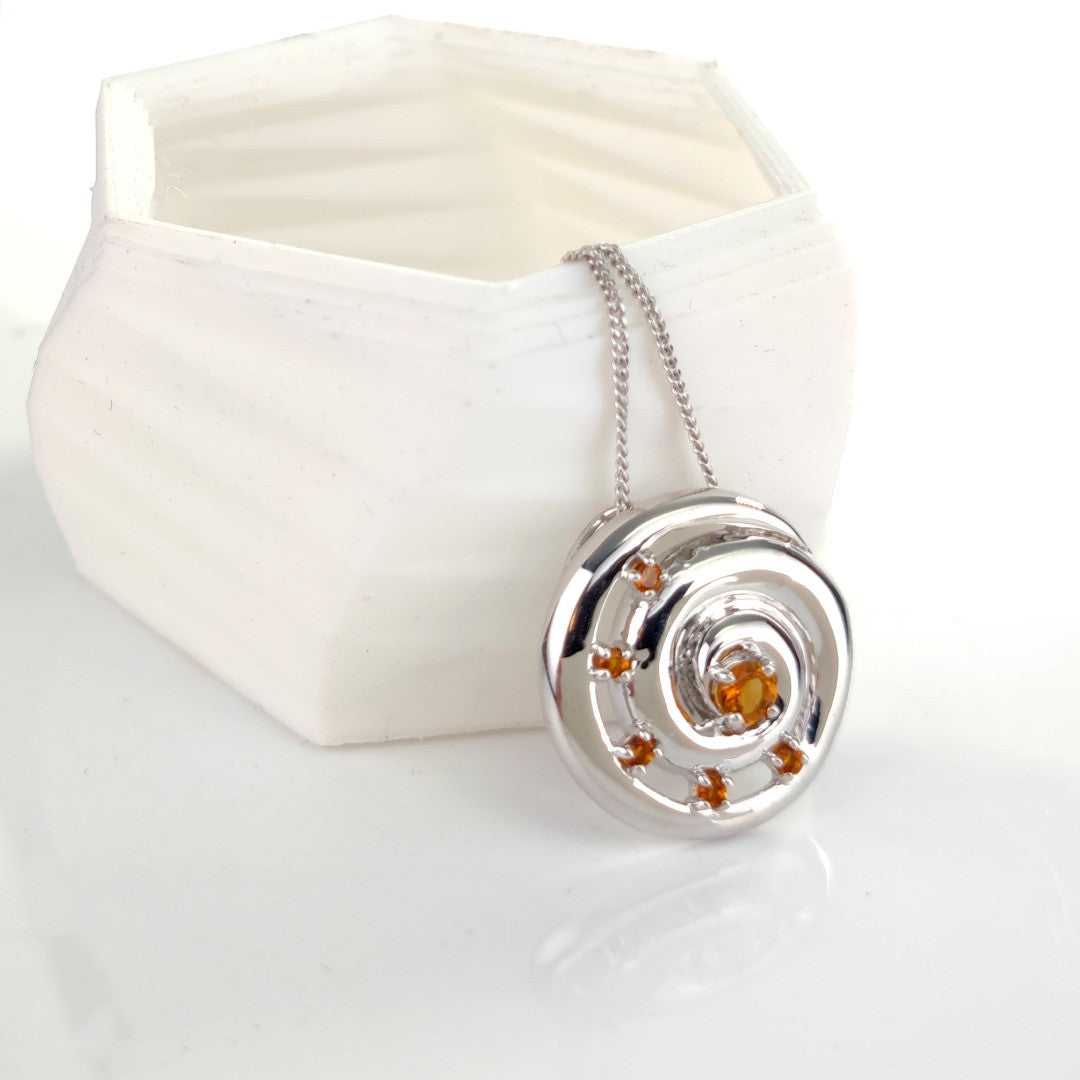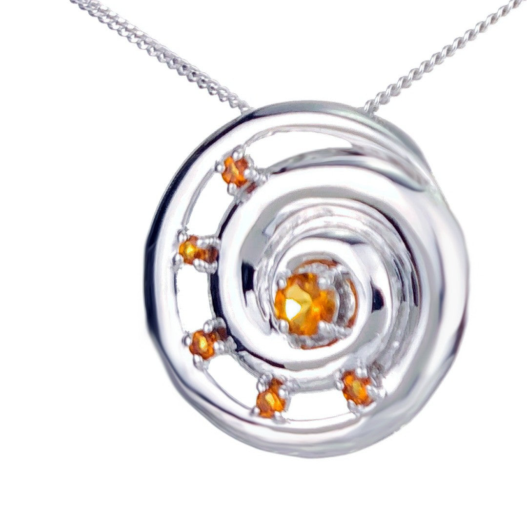 Elegant ammonite statement pendant set with six natural African yellow citrine. The central citrine is 4mm and surrounding stones each 2mm diameter giving a total carat weight of 0.4ct.