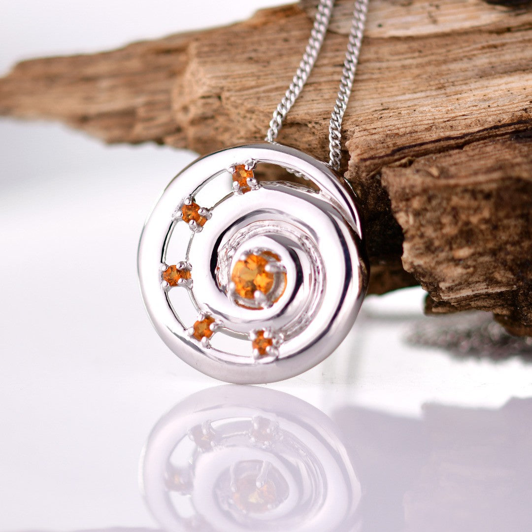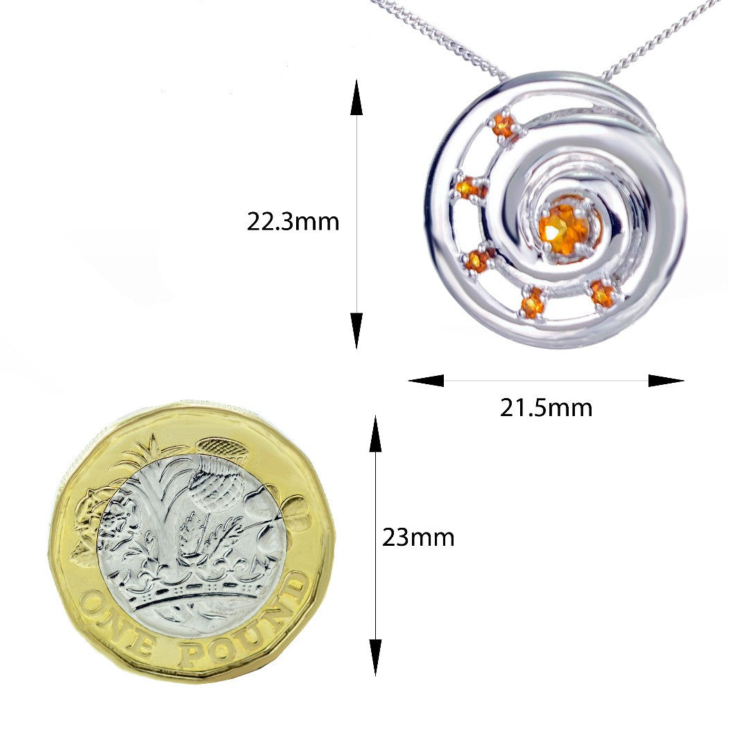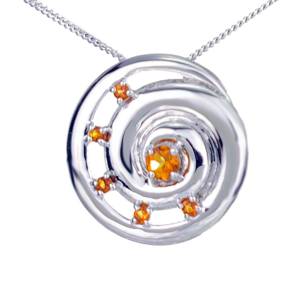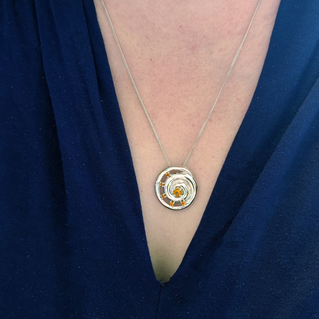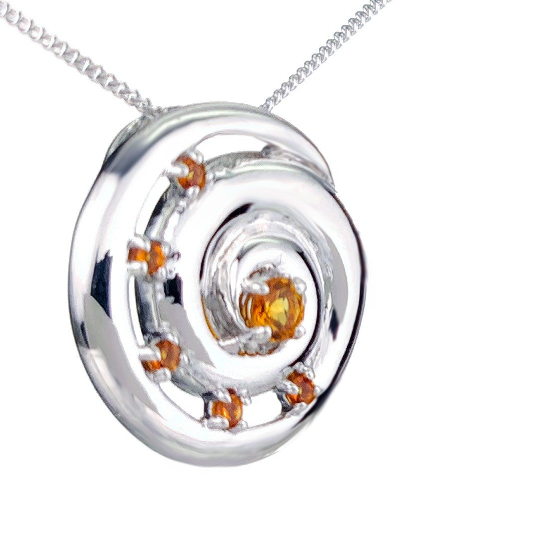 Elegant ammonite statement pendant set with six natural African yellow citrine. The central citrine is 4mm and surrounding stones each 2mm diameter giving a total carat weight of 0.4ct.