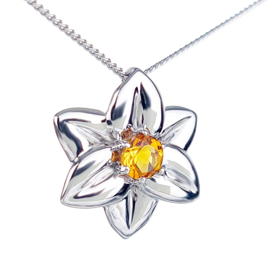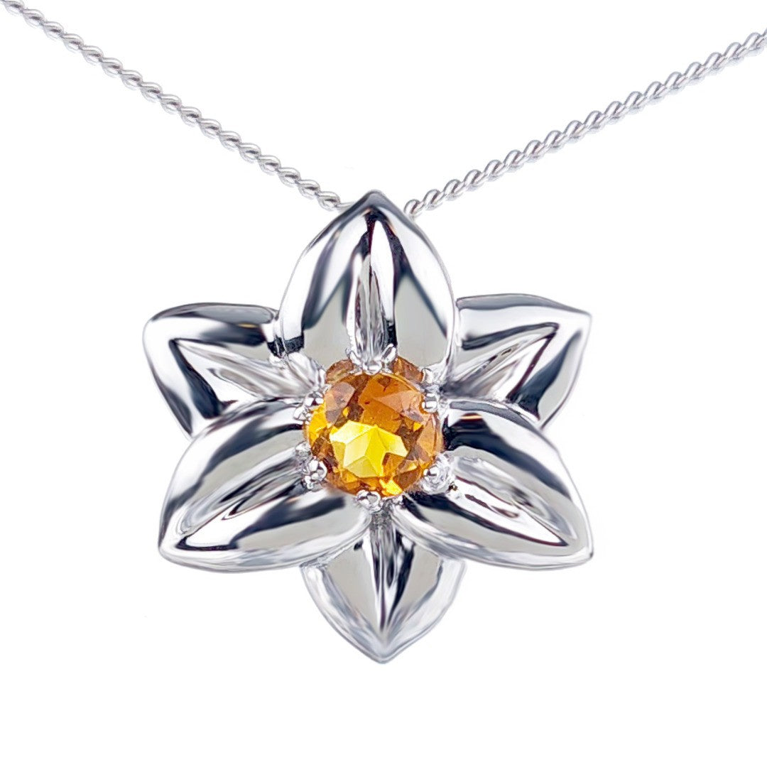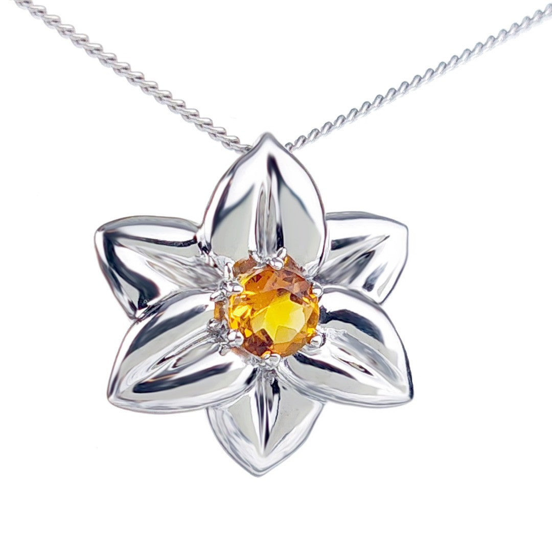 Radiant daffodil flower statement pendant set with a round natural yellow citrine. The citrine is 5mm diameter giving a total carat weight of 0.4ct.