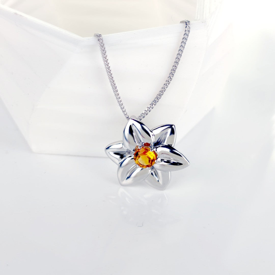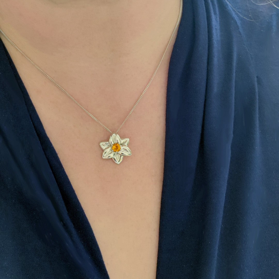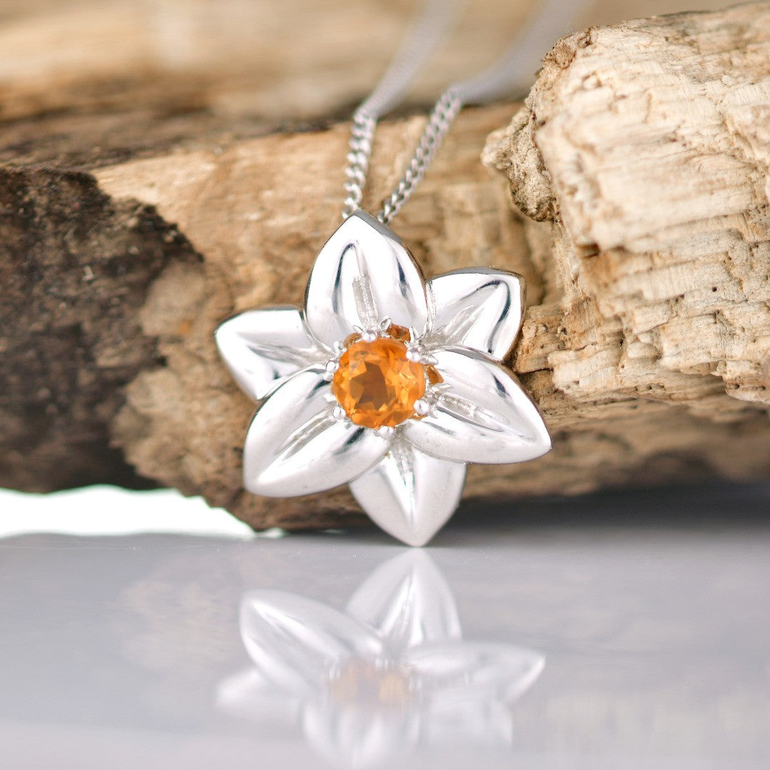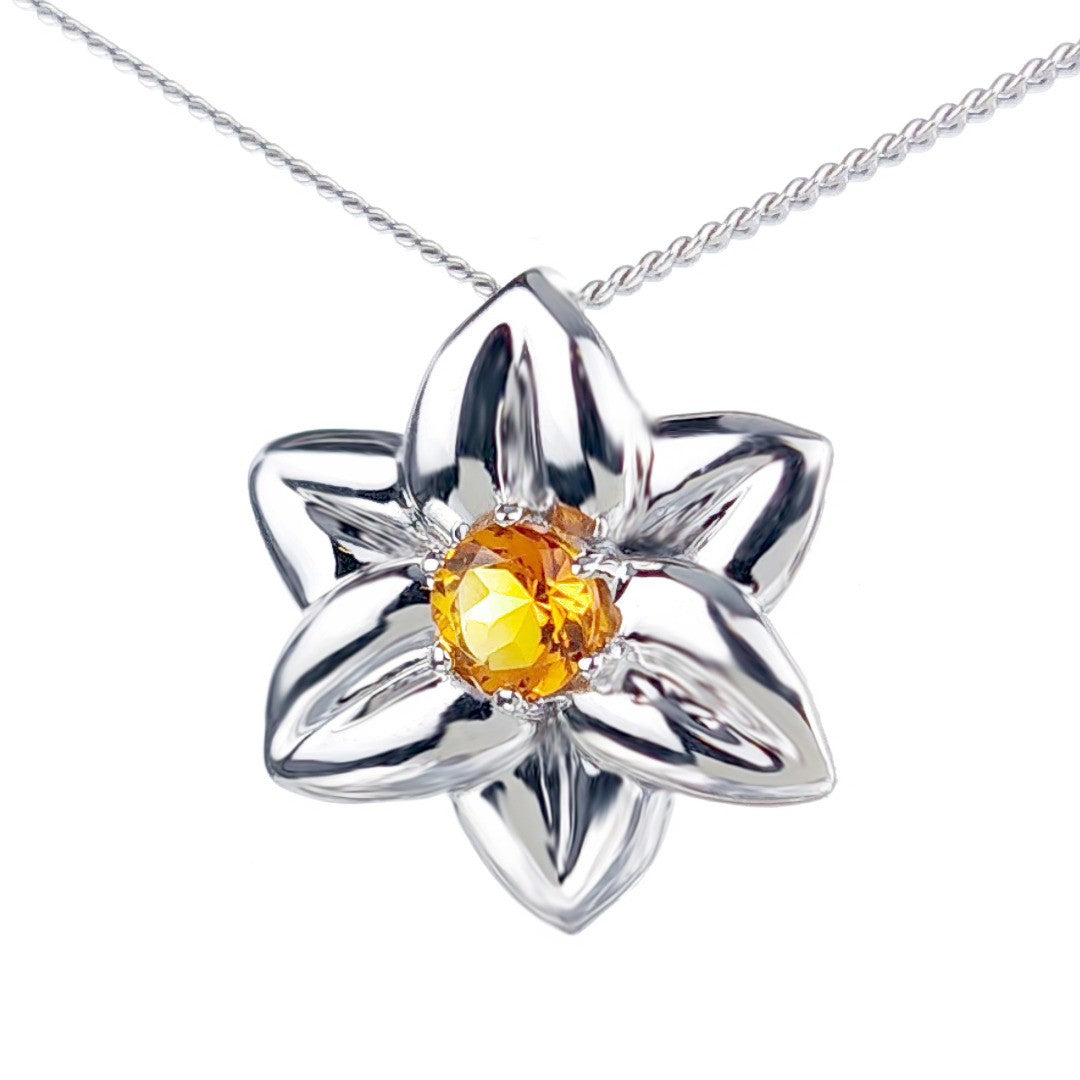 Radiant daffodil flower statement pendant set with a round natural yellow citrine. The citrine is 5mm diameter giving a total carat weight of 0.4ct.