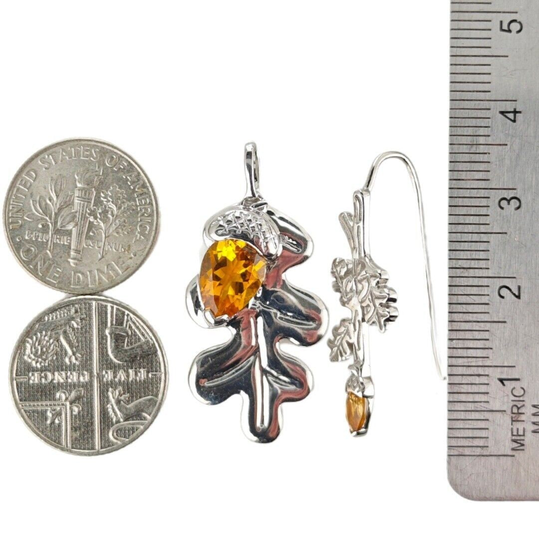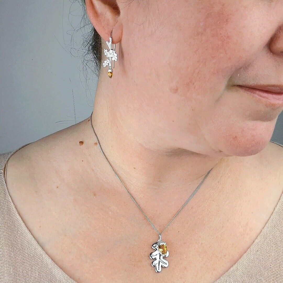 This set features a detailed oak leaf pendant paired with a sparkly, pear-shaped citrine gemstone cut to look like a precious little acorn. It's about 1.6 carats of sunshine and good vibes close to your heart! and another 0.36 ct of citrine set in coordinating dangle earrings on your ear lobes
