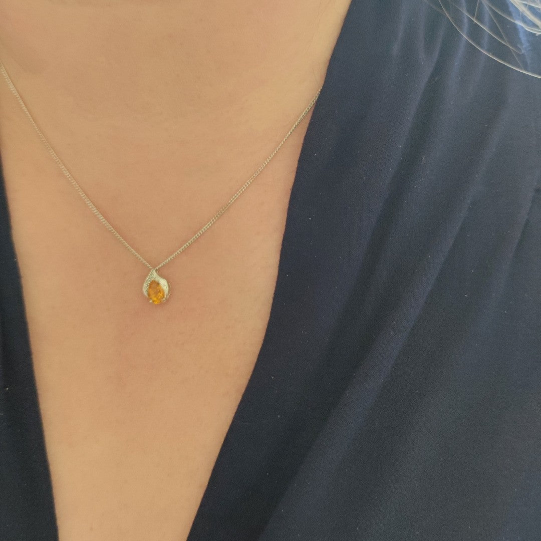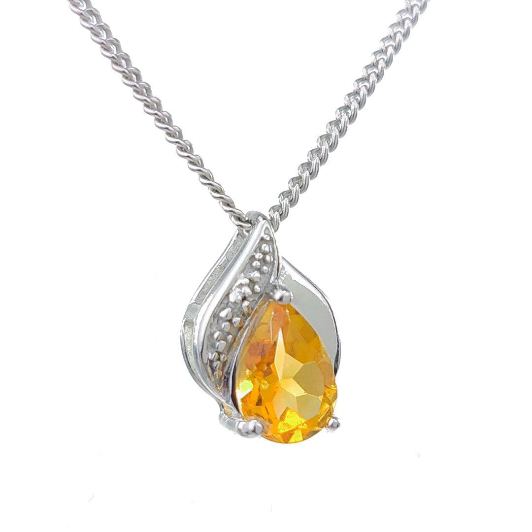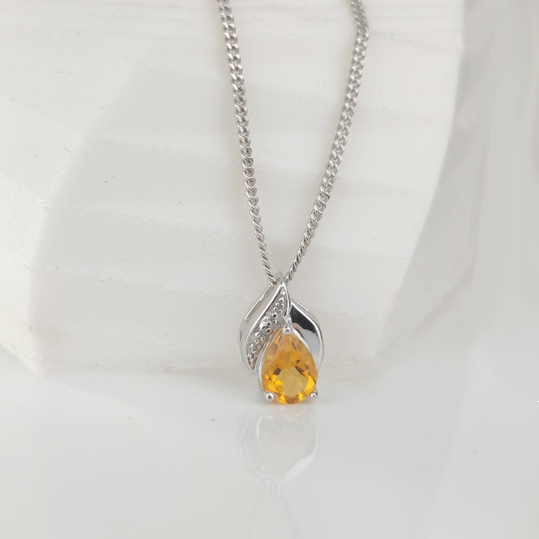 Elegant sterling silver pendant finished with a rhodium plate to give a bright shine. Set with natural African yellow citrine and natural near colourless diamonds.