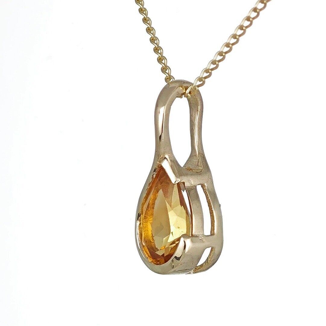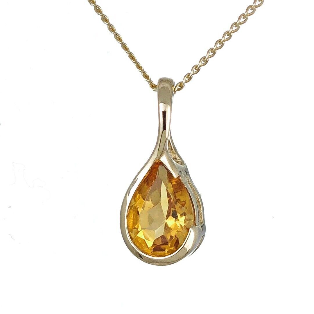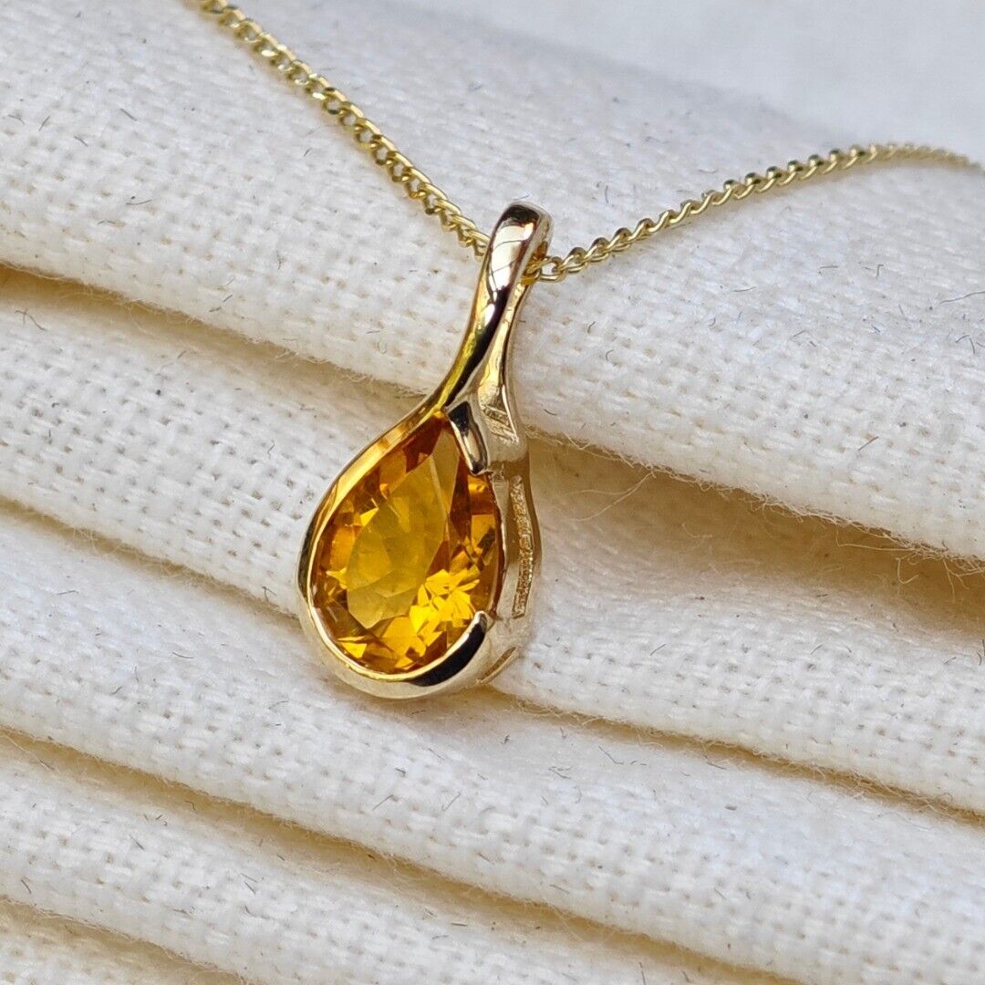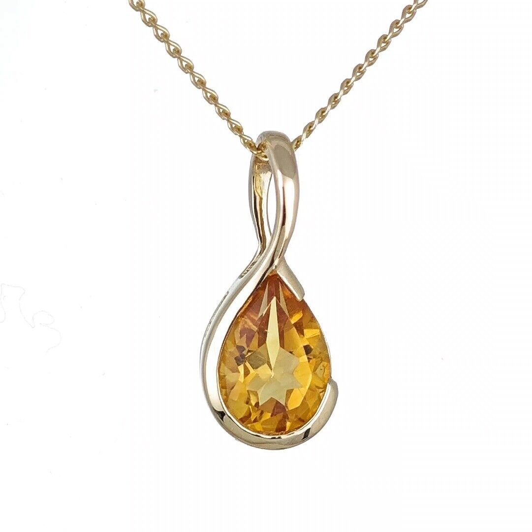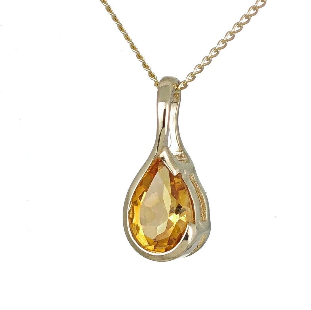 Handmade, UK Designed citrine pear pendant. Set in a raised rub over setting made of 9ct yellow gold to allow light to the back of the stone and show off its natural sparkle.