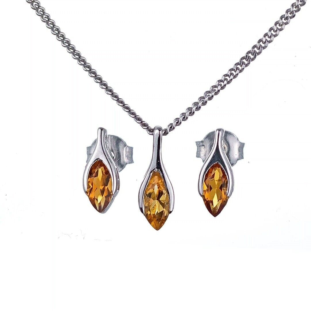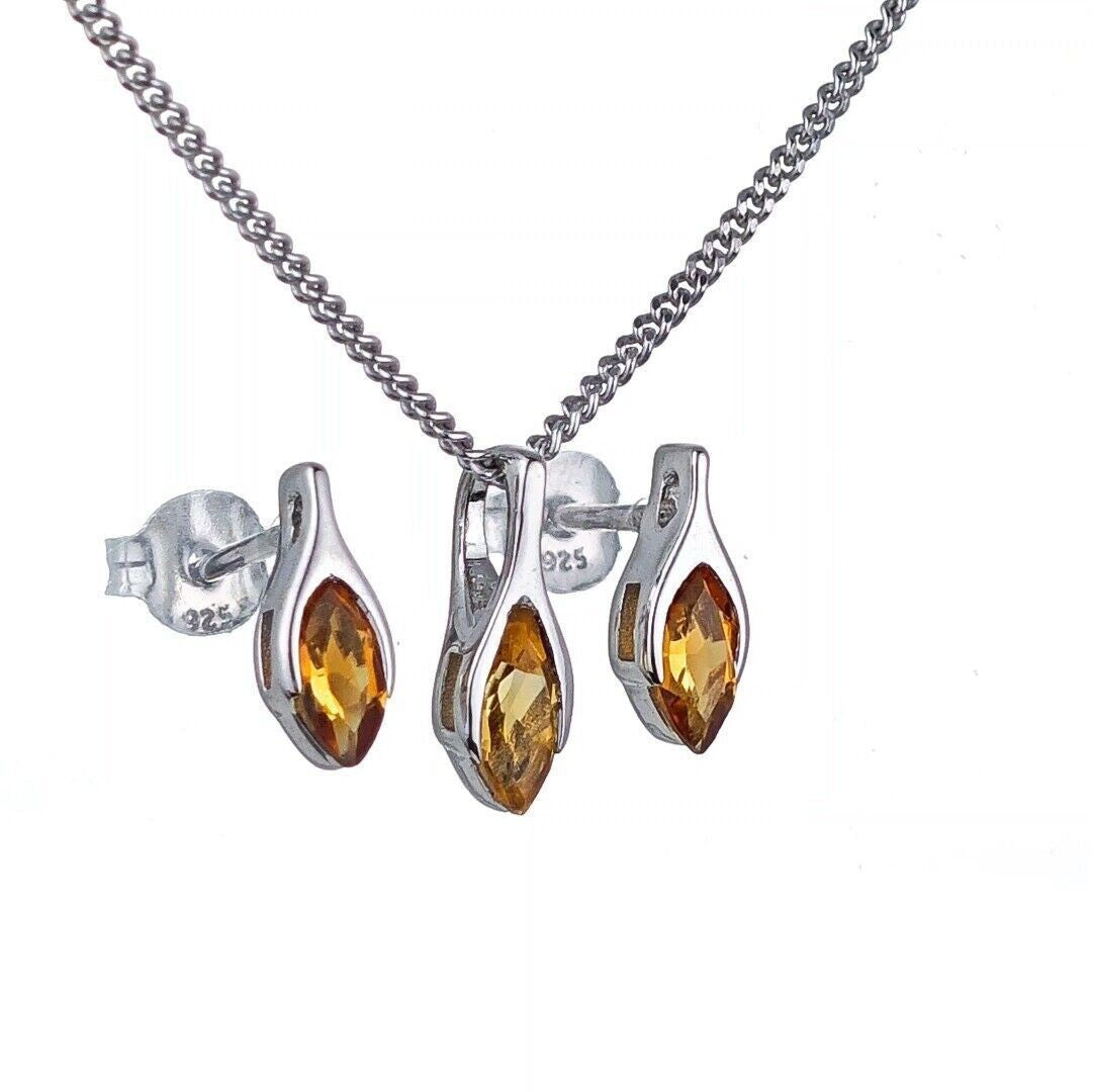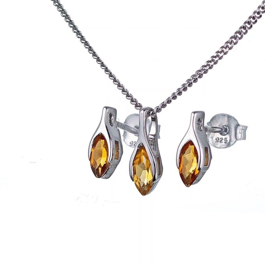 Citrine Set Necklace Earrings Sterling Silver Studs Minimalist Marquise