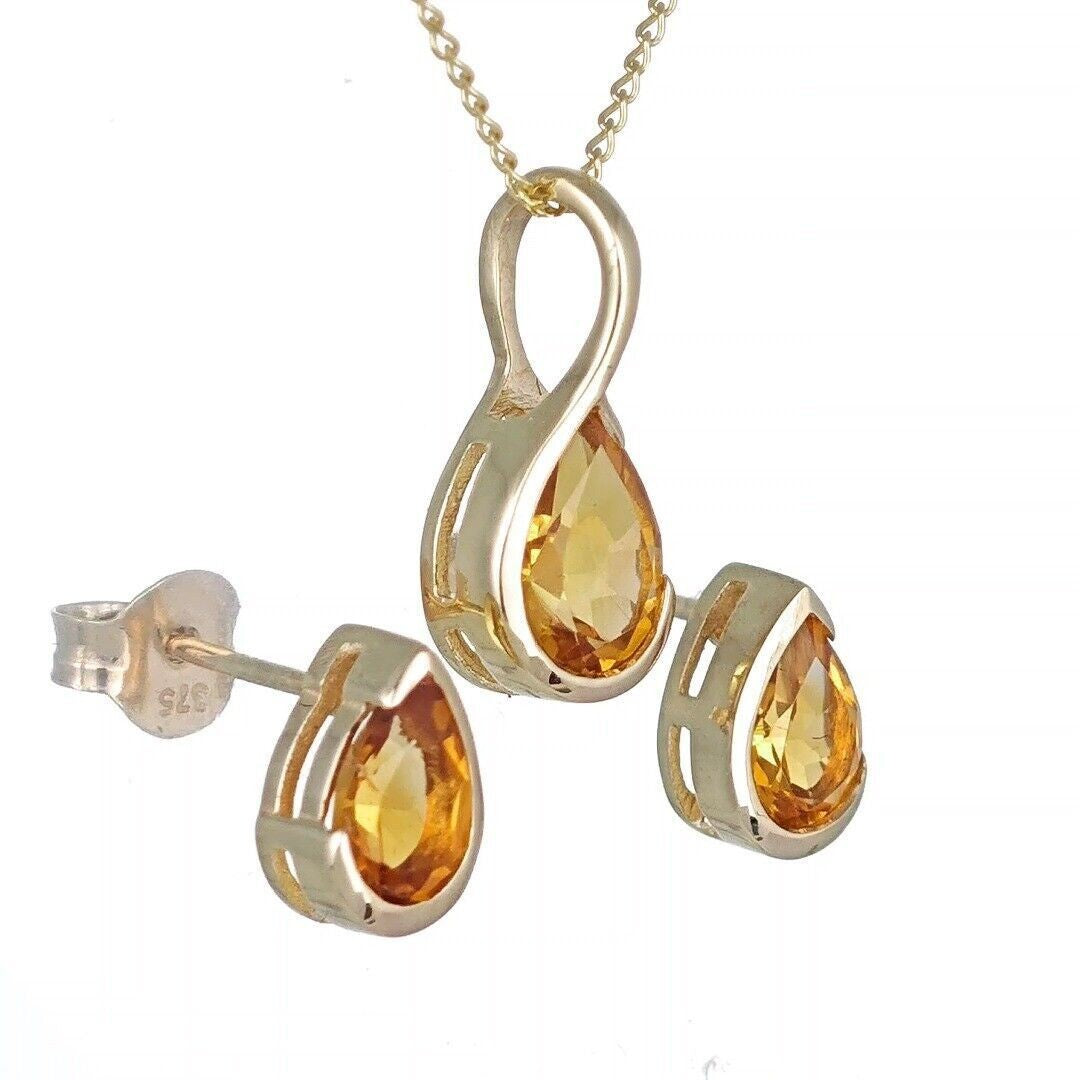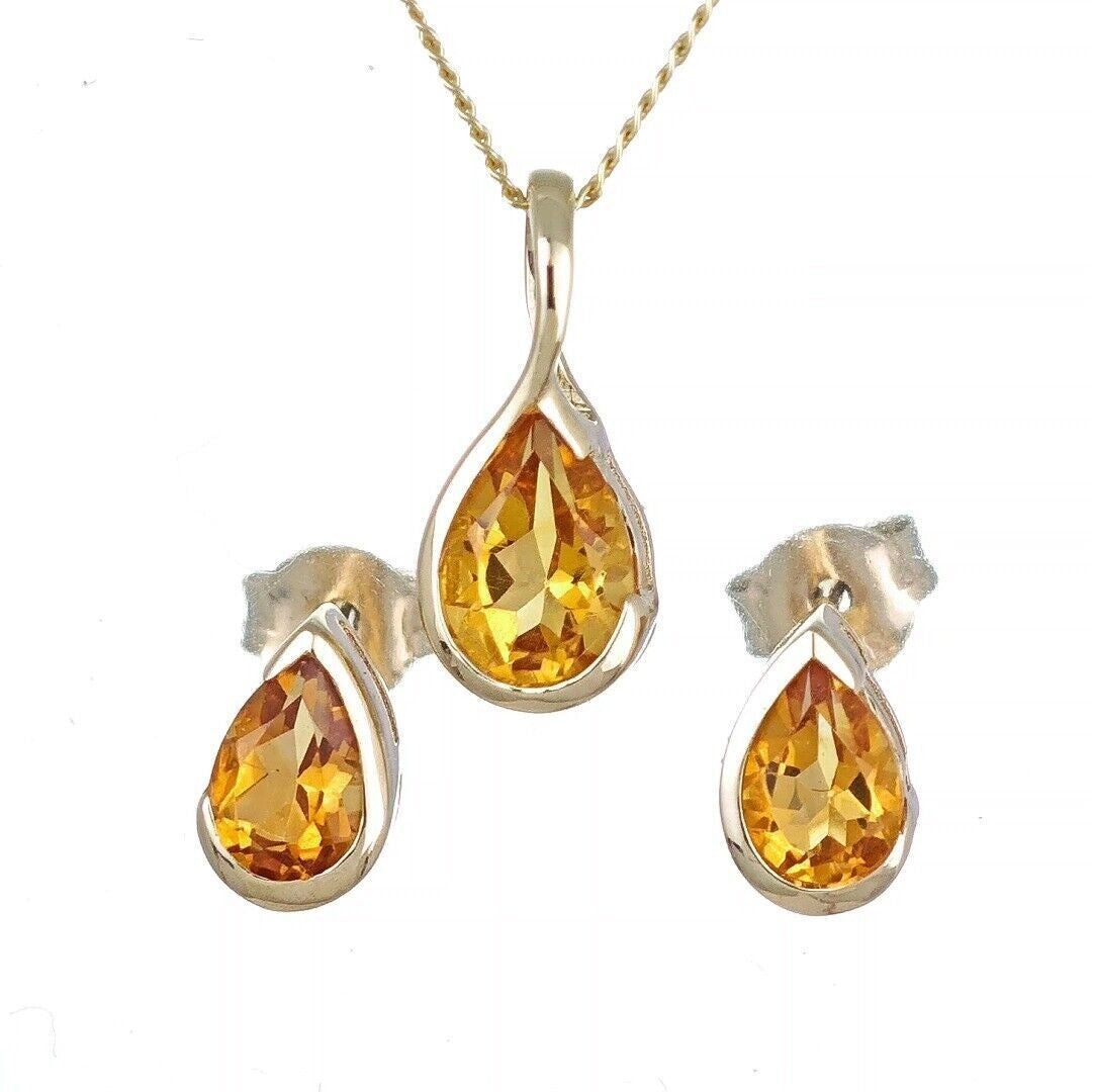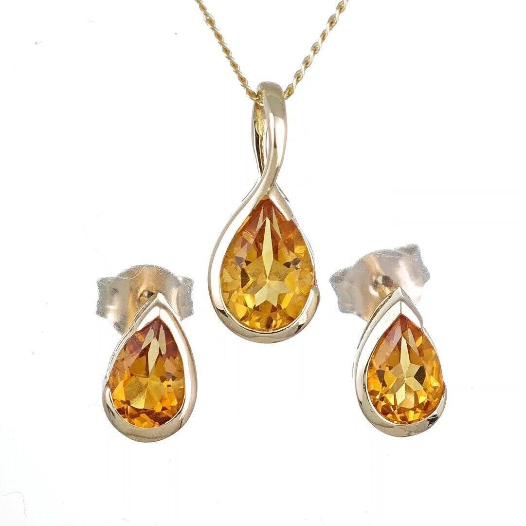 Handmade, UK Designed citrine pear pendant and matching earrings. Natural citrine gemstone set in a raised rub over setting made of 9ct Yellow Gold to allow light to the back of the stone and show off its natural sparkle.
