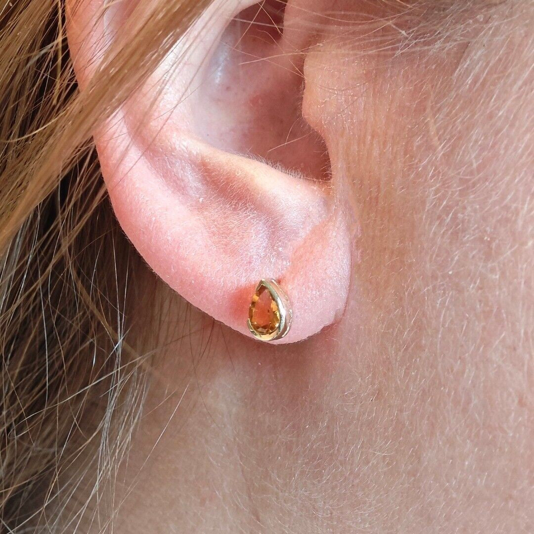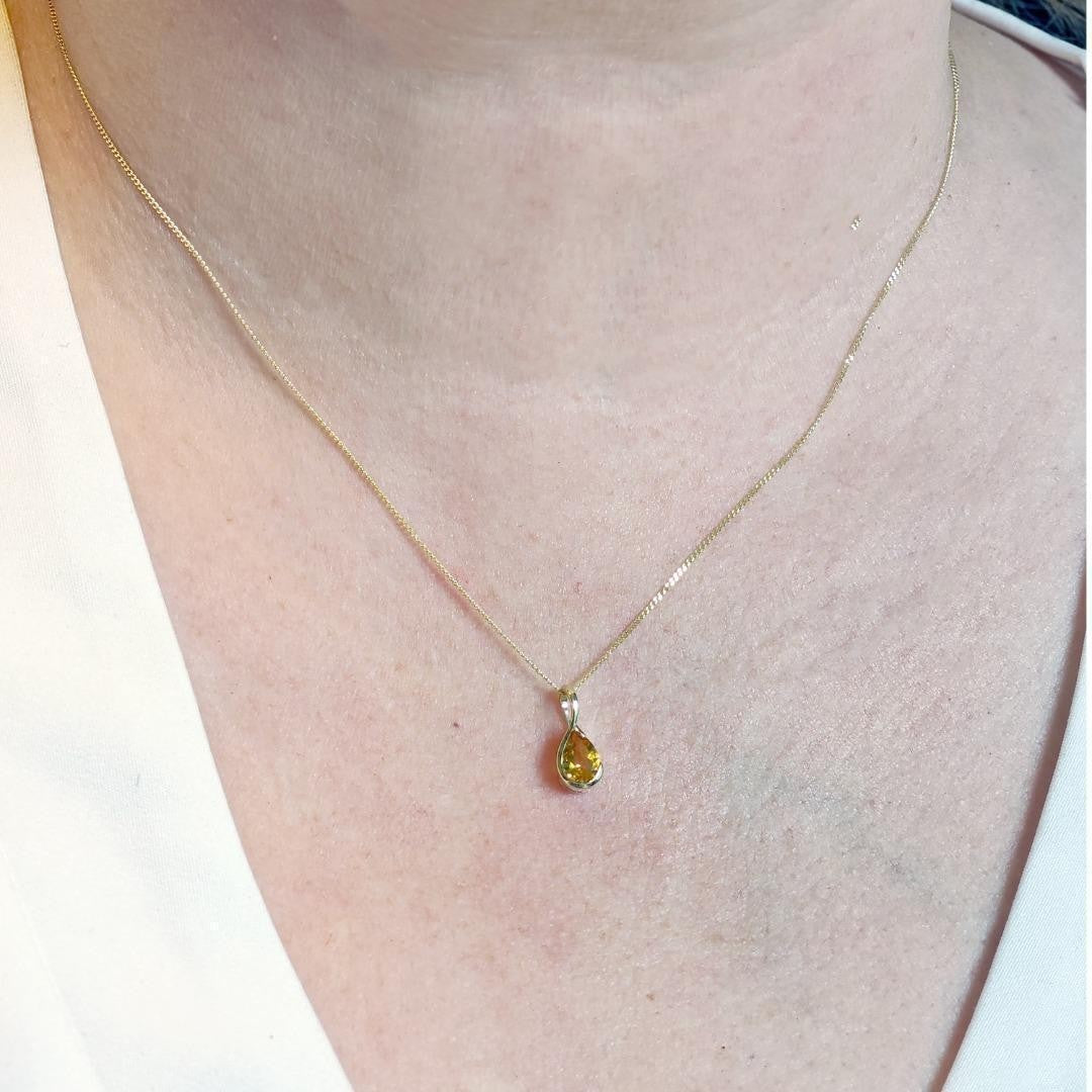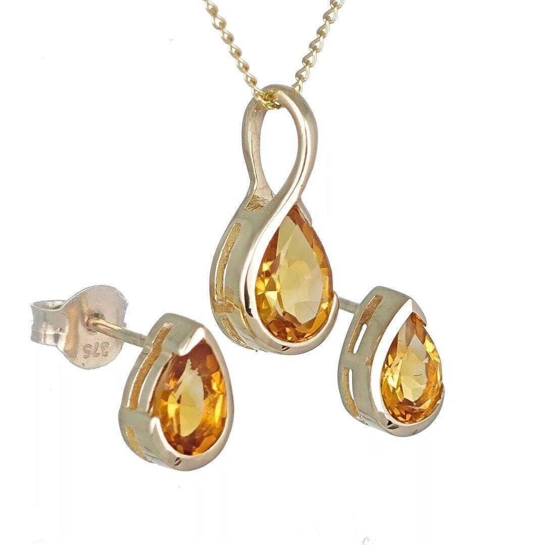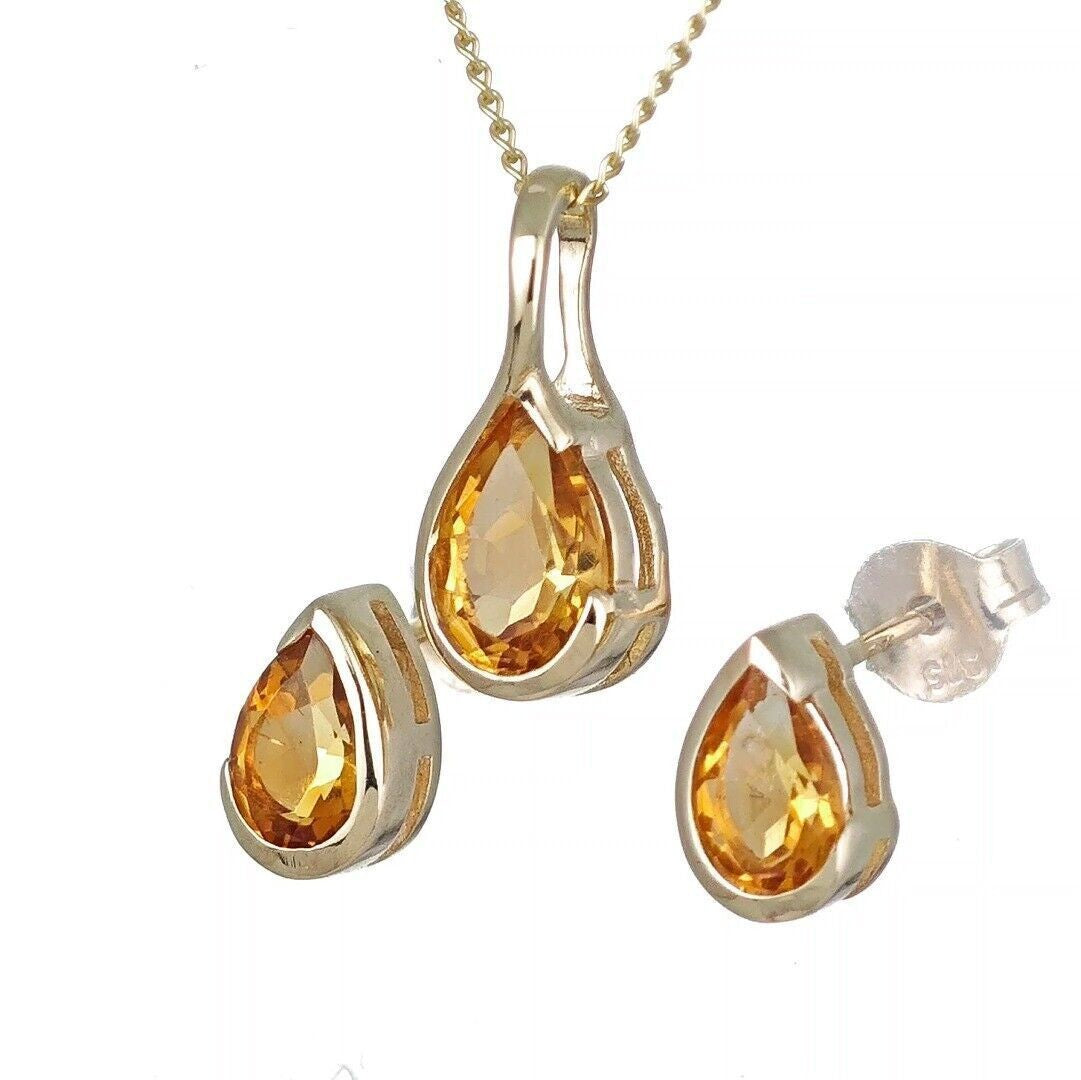 Handmade, UK Designed citrine pear pendant and matching earrings. Natural citrine gemstone set in a raised rub over setting made of 9ct Yellow Gold to allow light to the back of the stone and show off its natural sparkle.