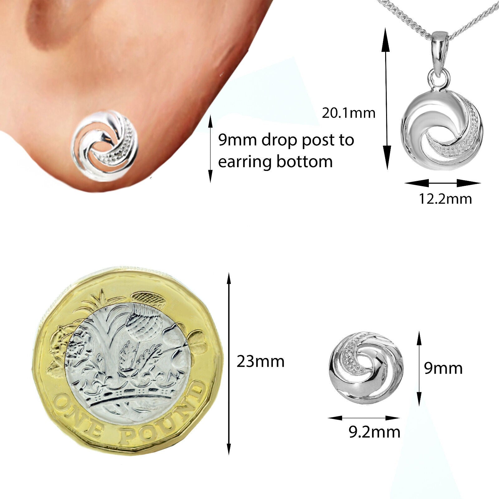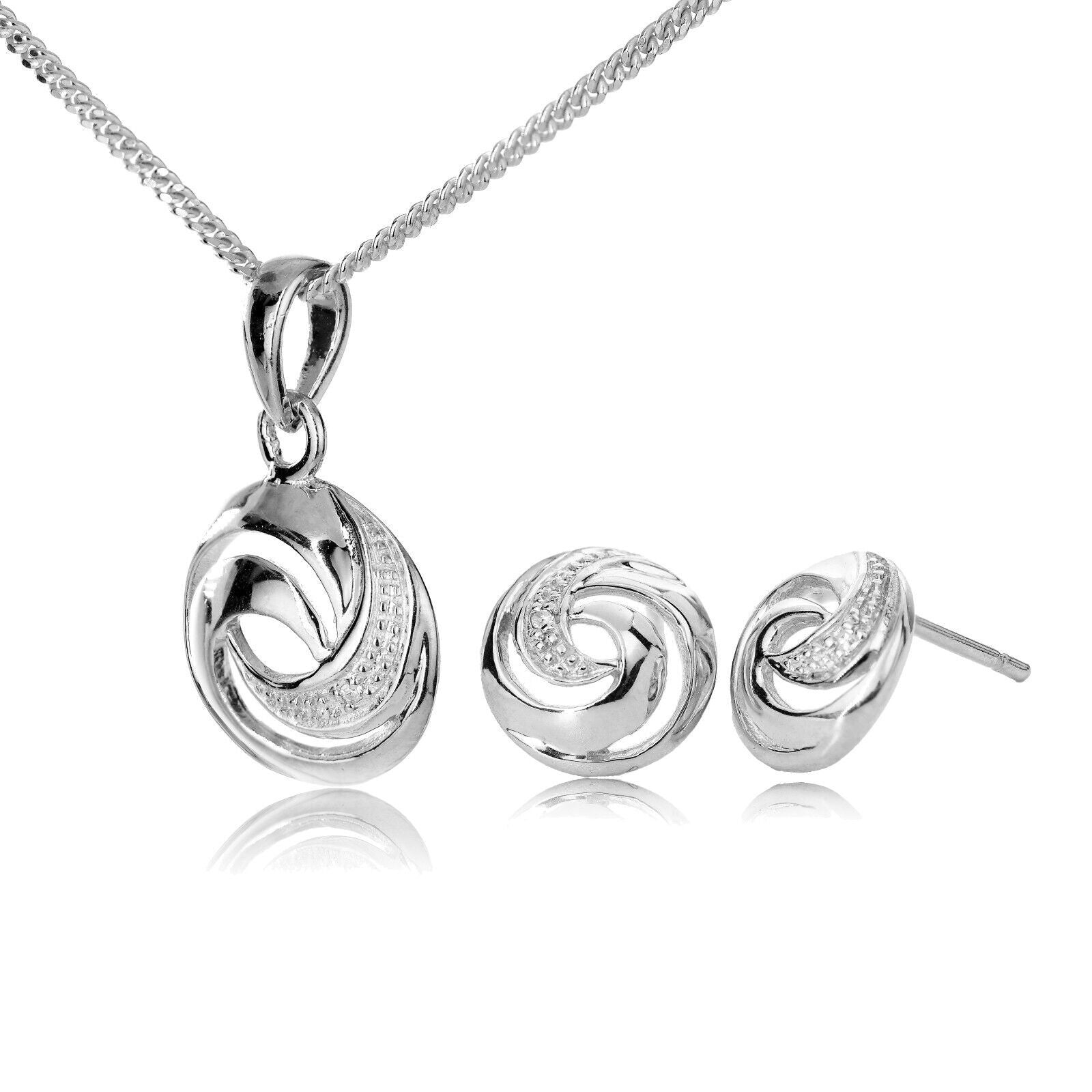 Elegant rhodium plated sterling silver swirl pendant and matching earrings set with sparkling natural near colourless African diamonds.