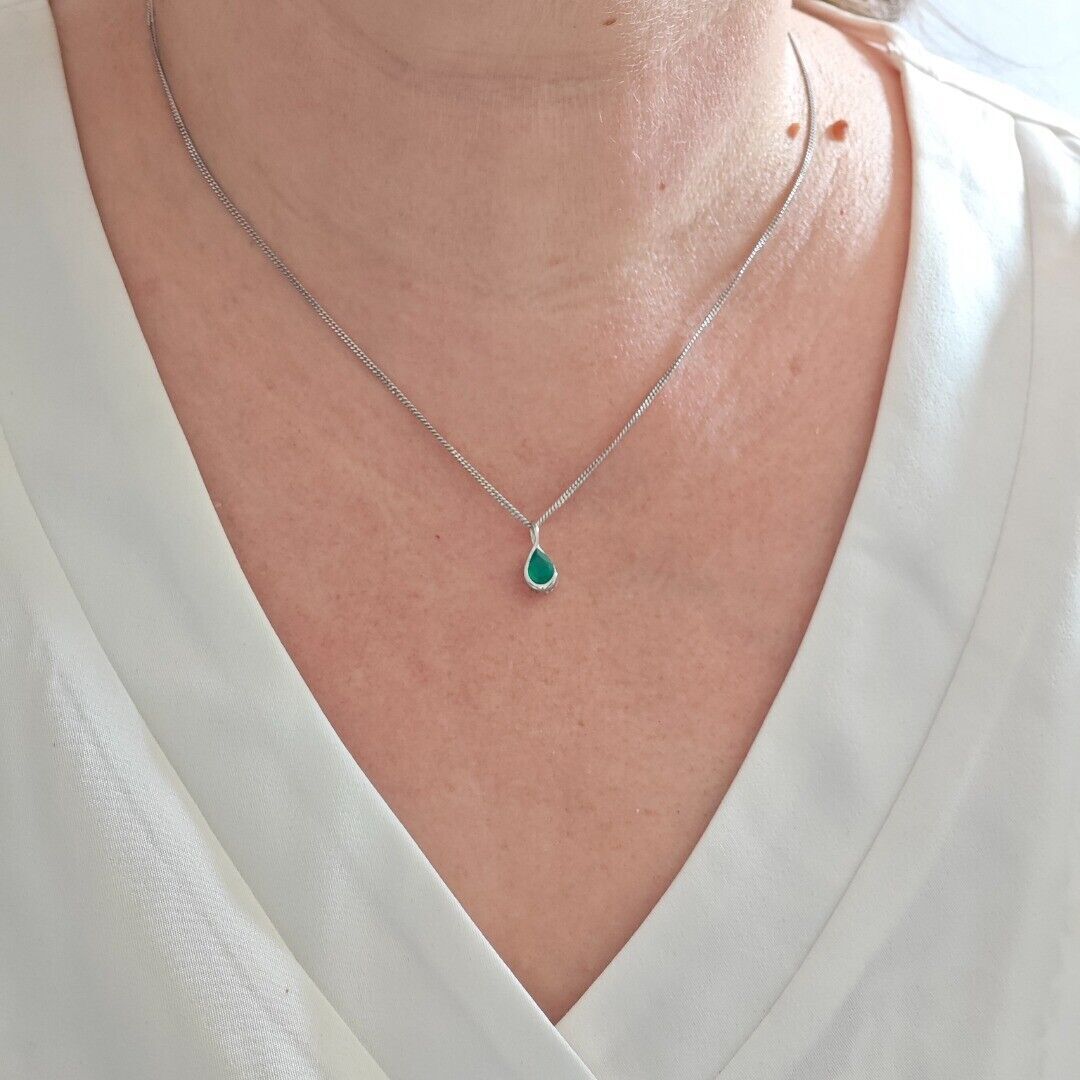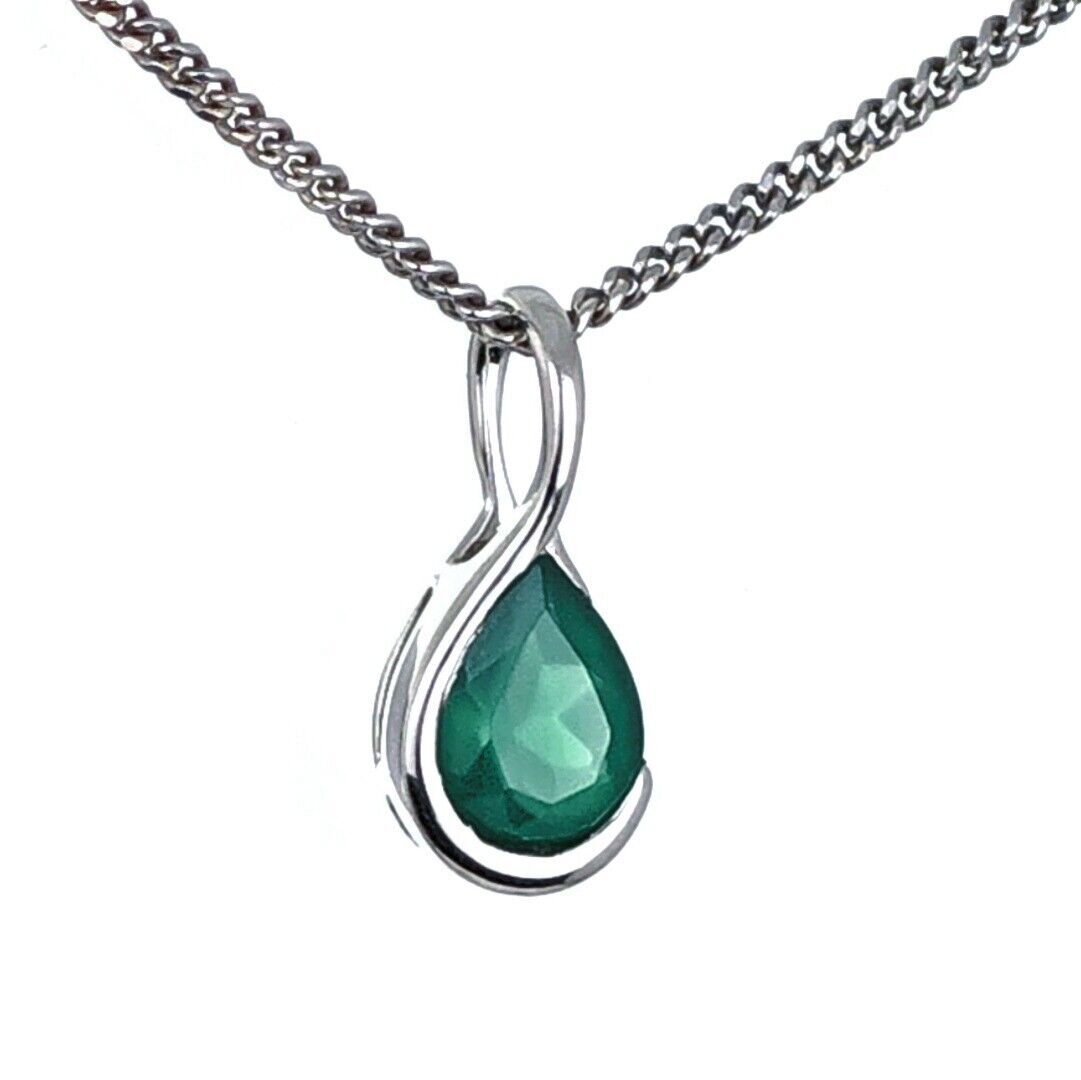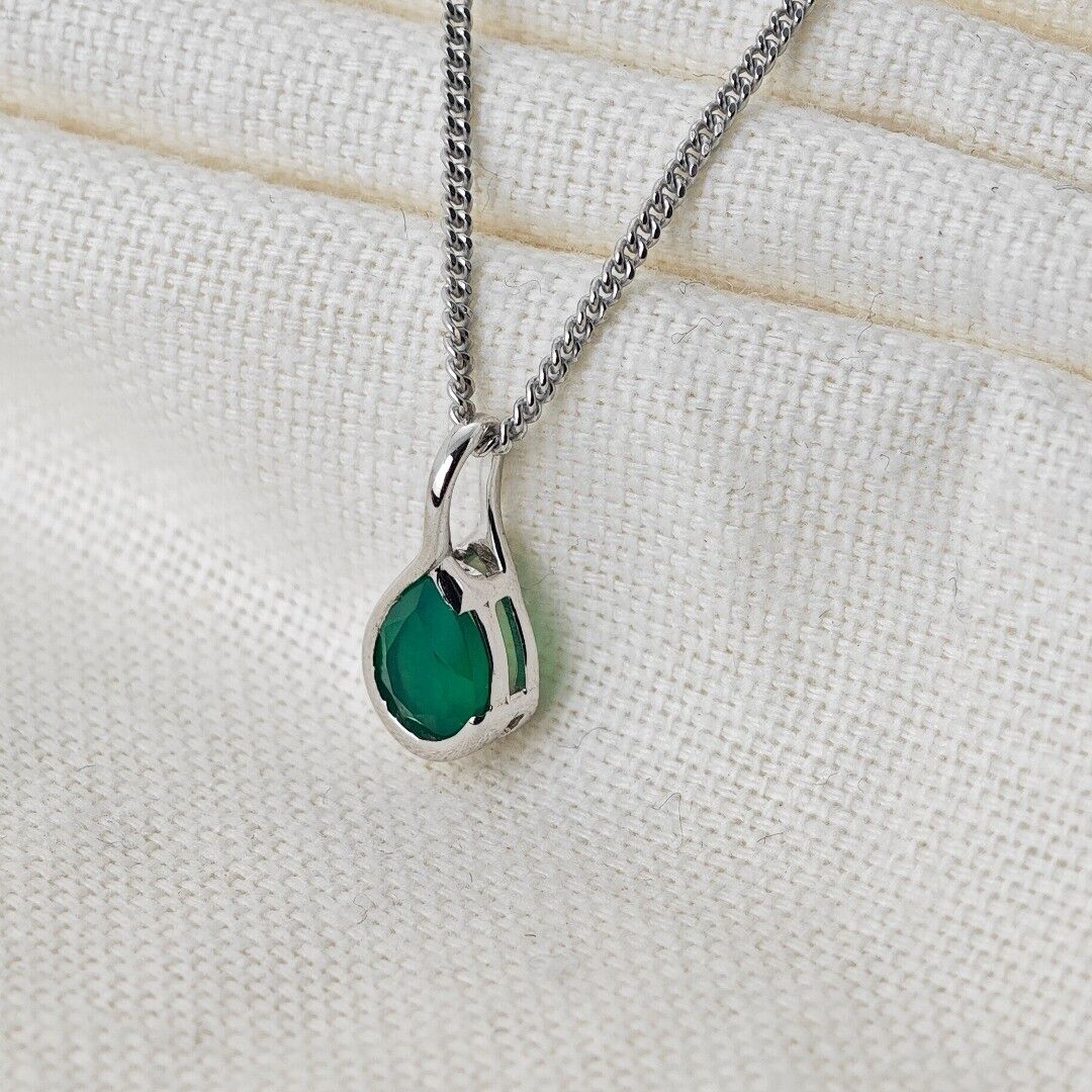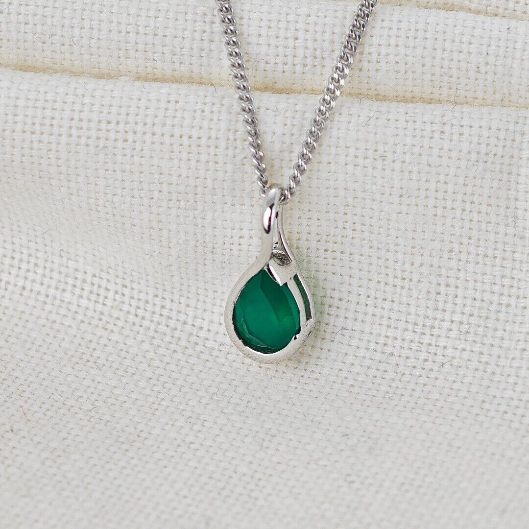 Elegant onyx pear pendant. Set in a raised rub over setting made of sterling silver to allow light to the back of the stone and show off its natural sparkle. The natural green onyx are from Inida. The stone measures 7x5 mm