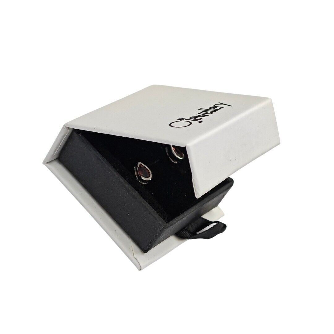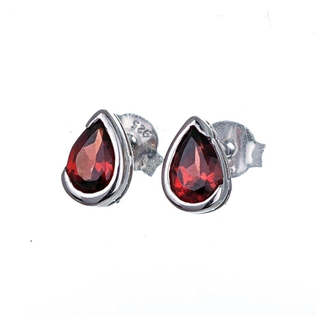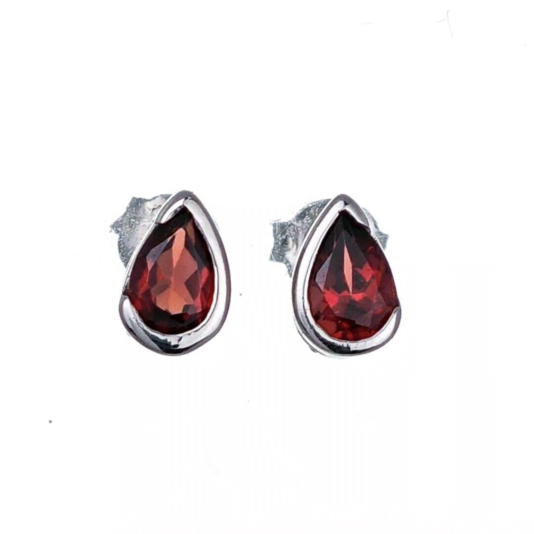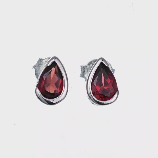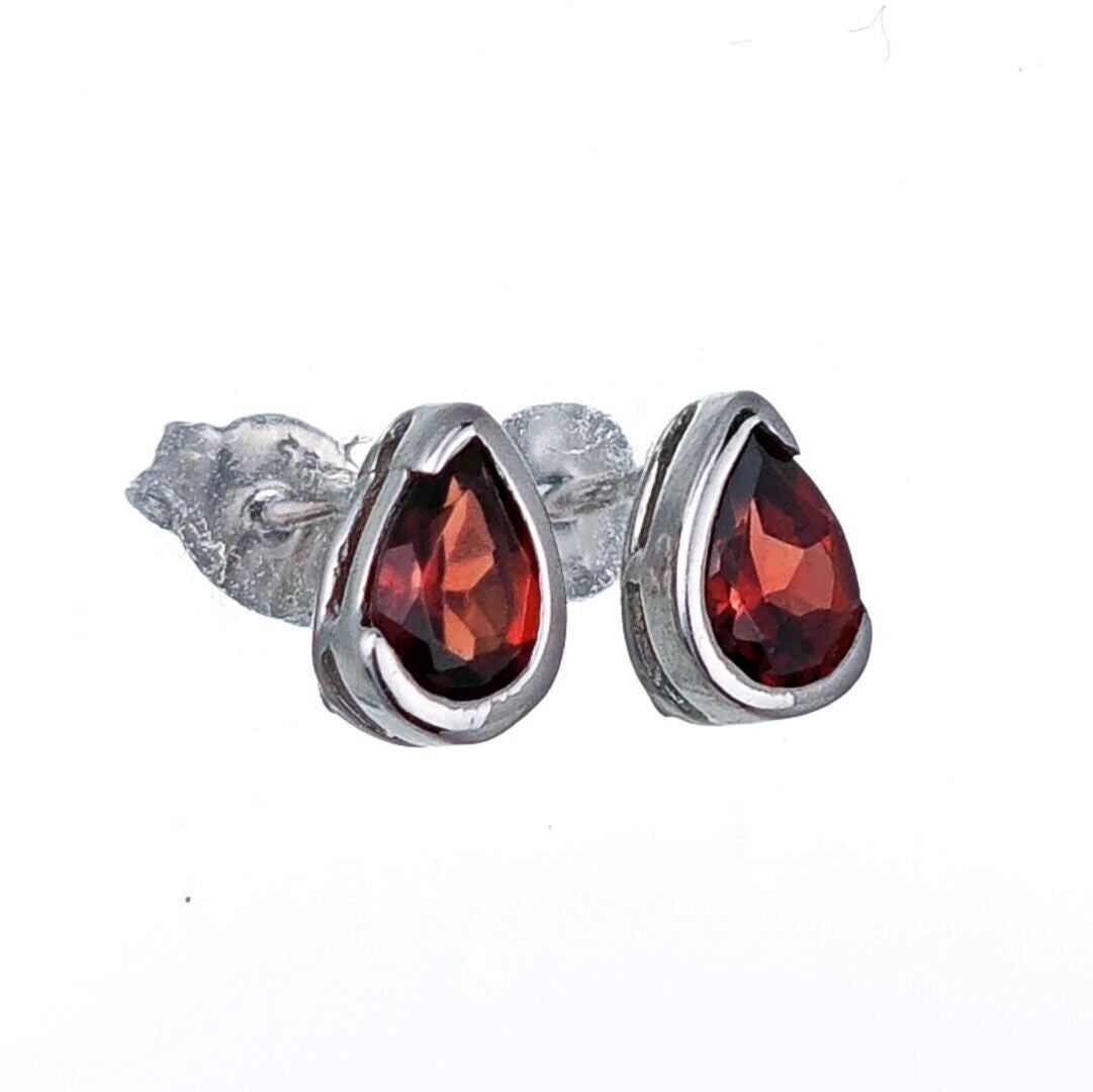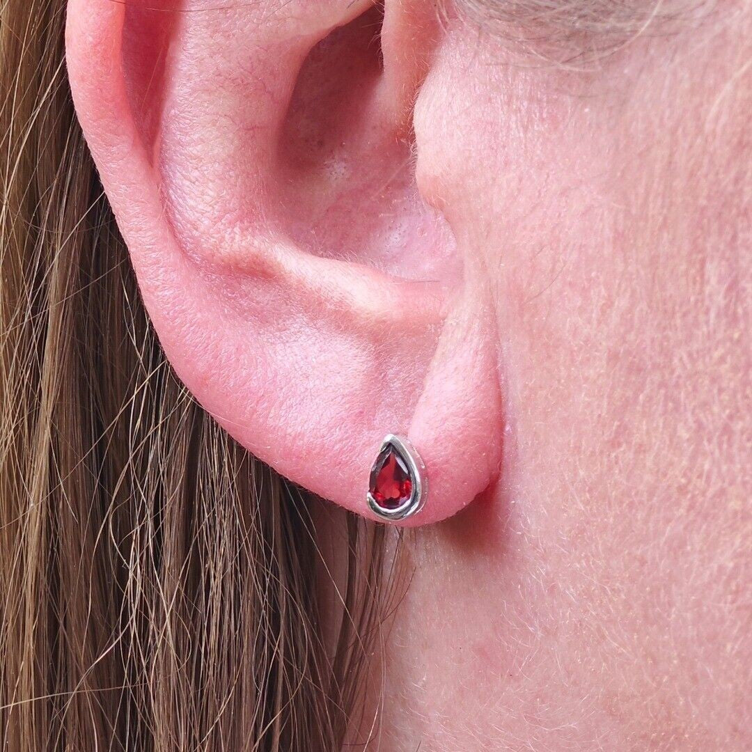 These elegant natural red Mozambique garnet pear stud earrings are designed in the UK and feature natural red Mozambique garnet gemstones. The stones are set in a raised rubover setting made of sterling silver to allow light to the back of the stone and show off its natural sparkle. The stones measure 6 x 4mm (0.61 ct).
