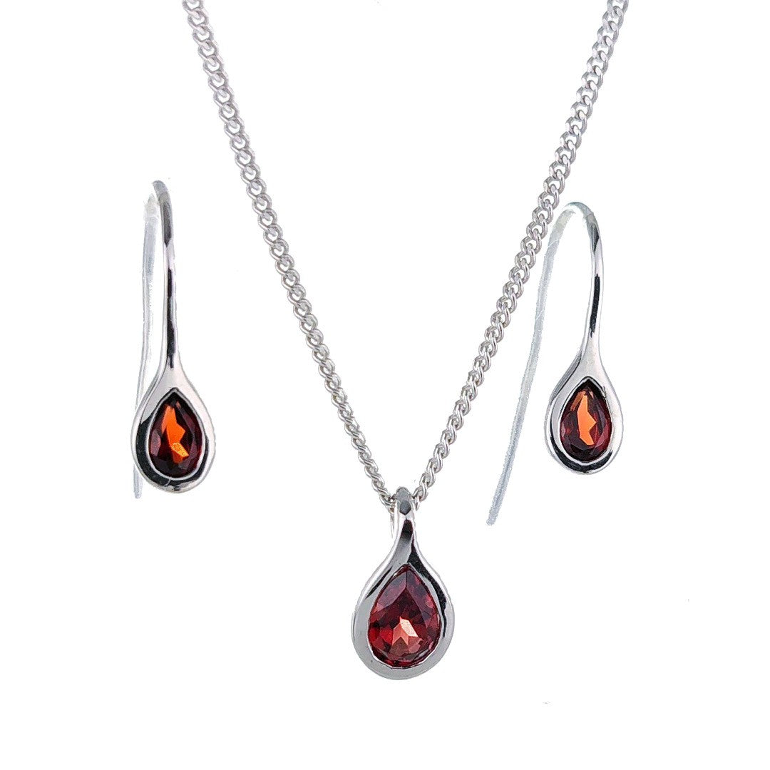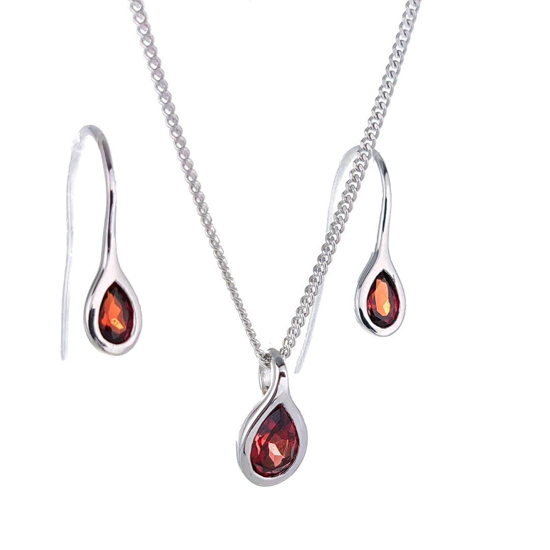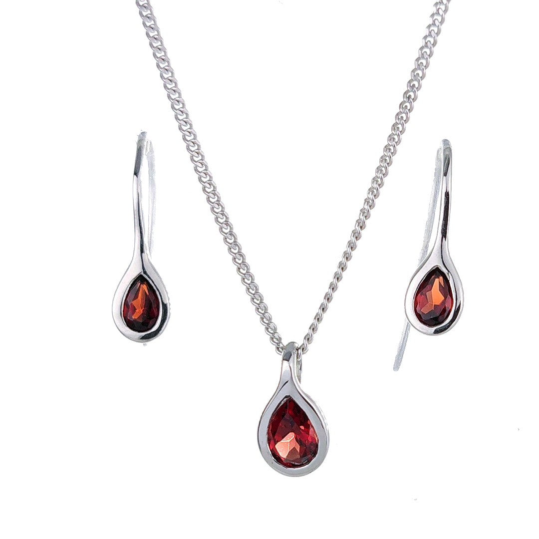 Elegant pear garnets in a rubover setting. Matching pendant on chain and dangle earring set. Natural Mozambique red garnet 6mm long by 4mm in pendant and 5 x 3mm in each dangle earring giving a total carat weight of 0.9ct.