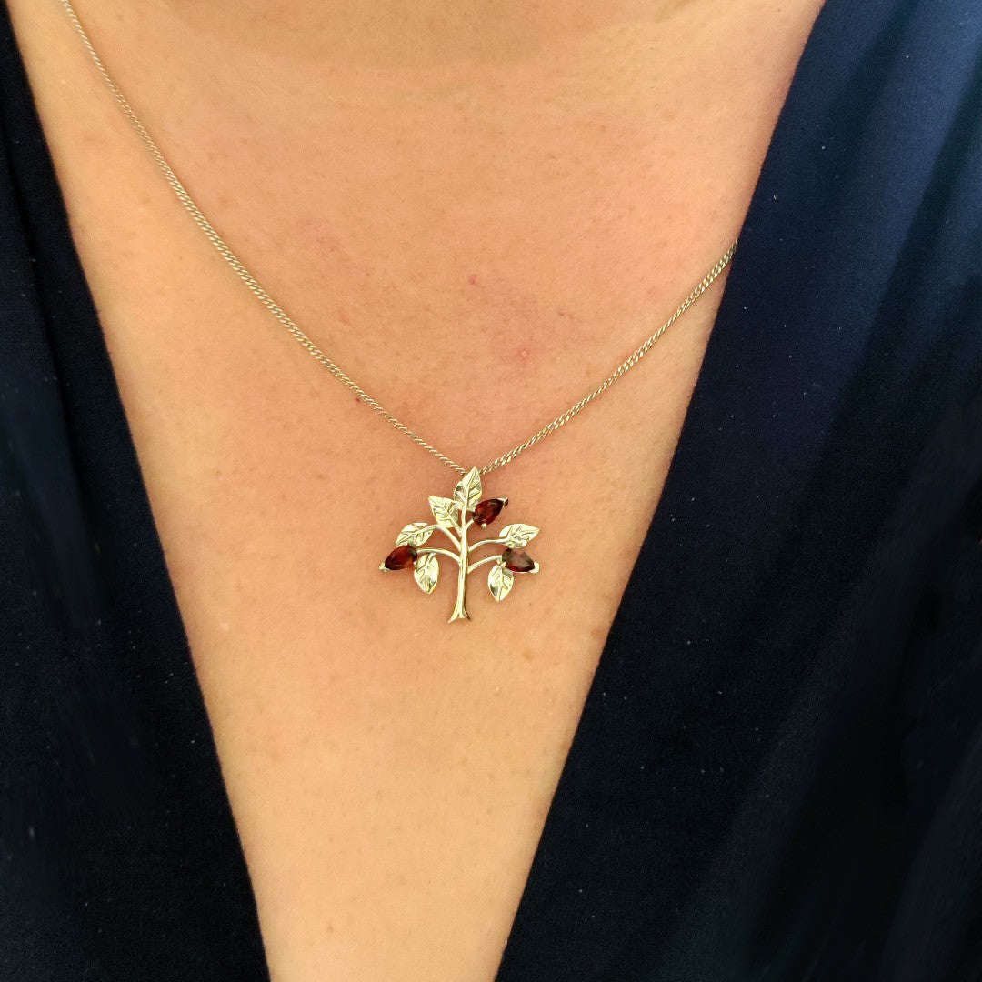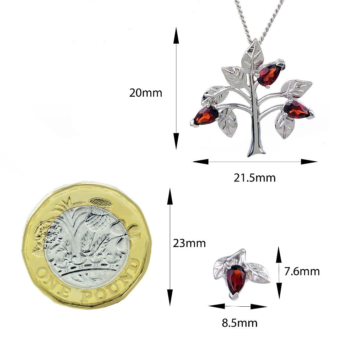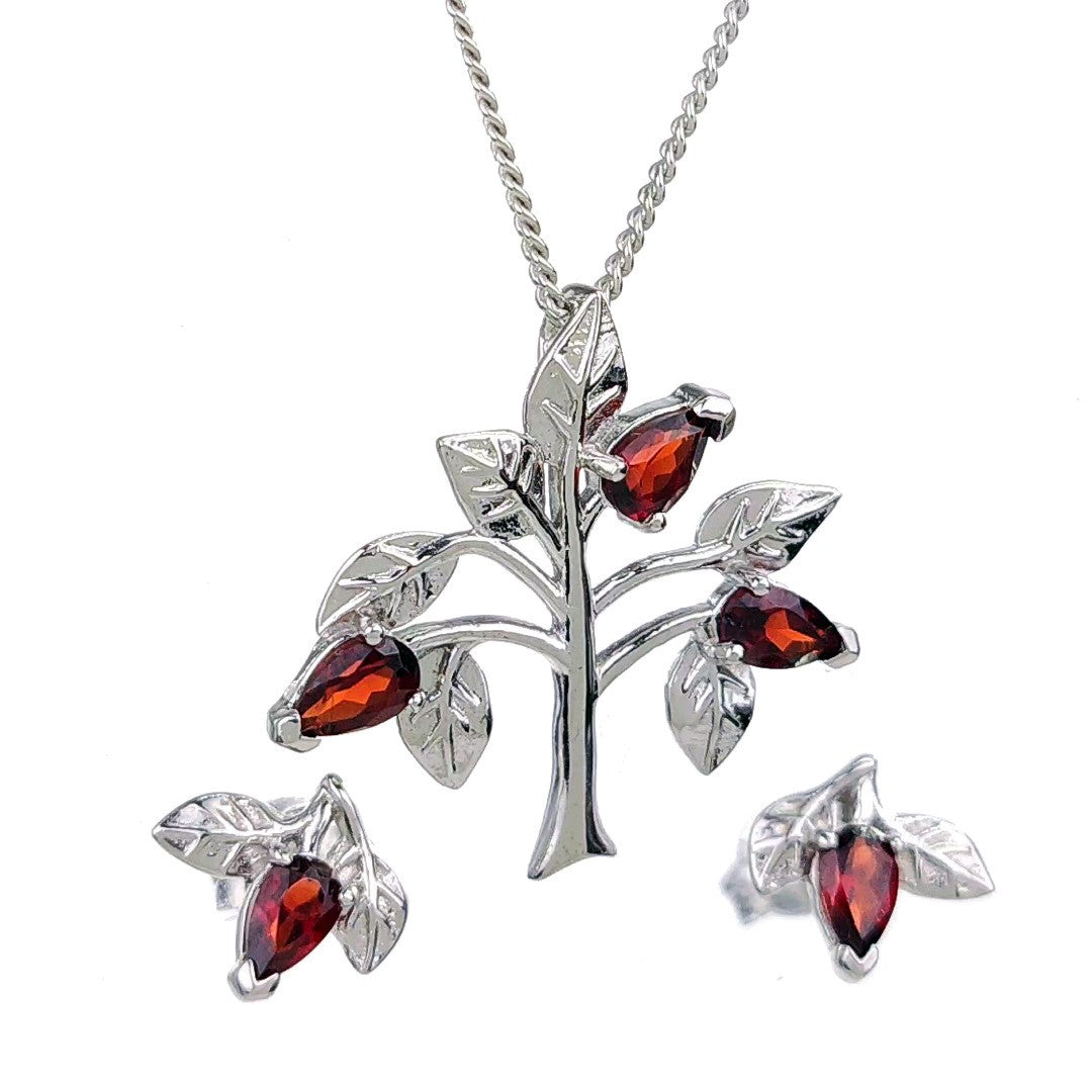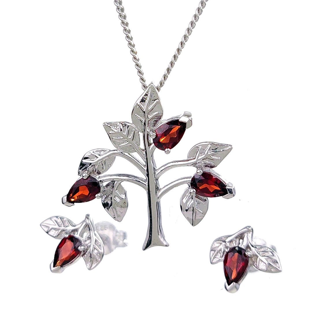 Garnet Necklace Earring Set 1.25ct Pear Red Tree of Life Leaves Sterling Silver