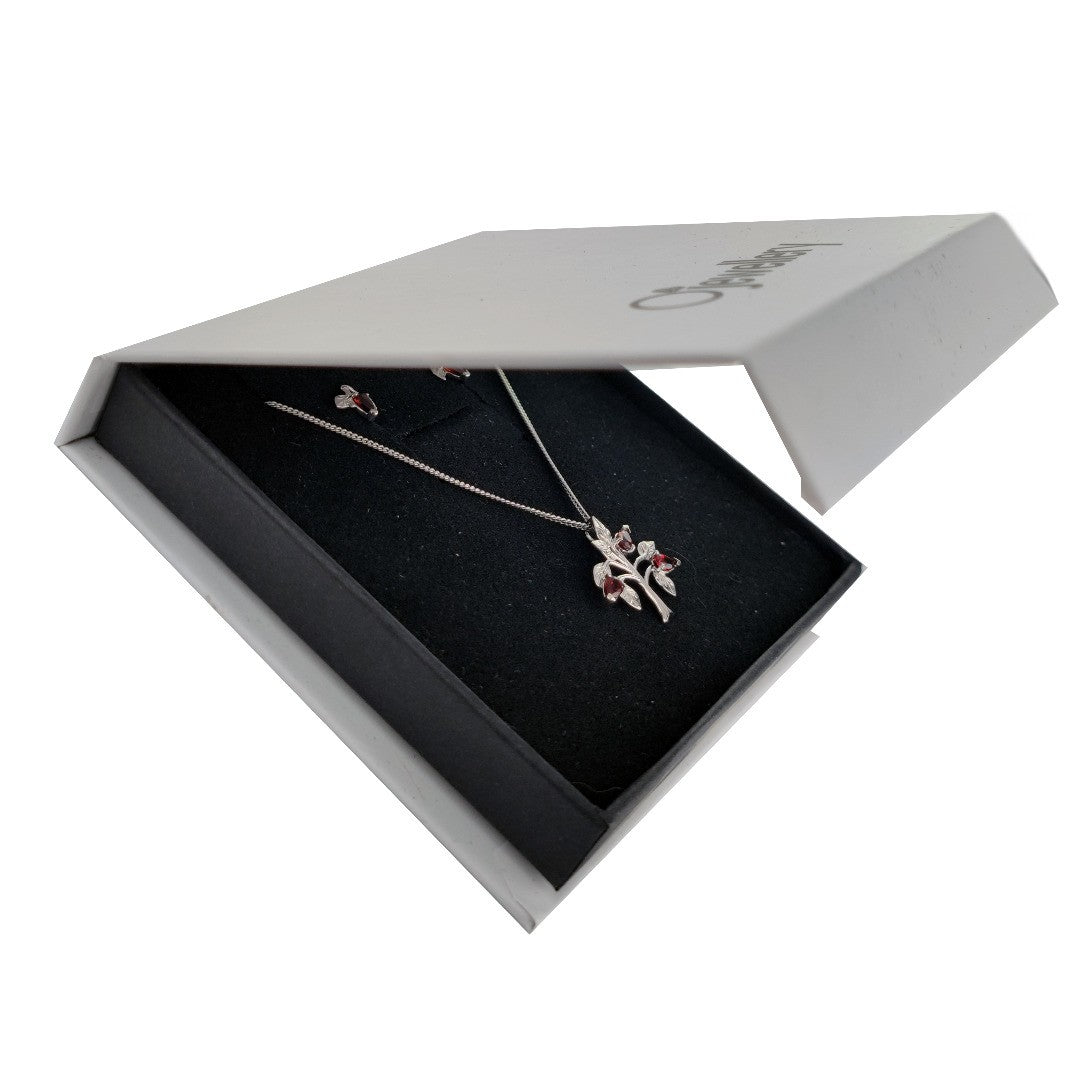 Elegant Tree of Life trilogy stone pendant set with three natural Mozambique elegant red Garnet and matching earrings each set with a natural Mozambique elegant red Garnets. The five garnets are 3mm x 5mm giving a total carat weight of 1.25ct.