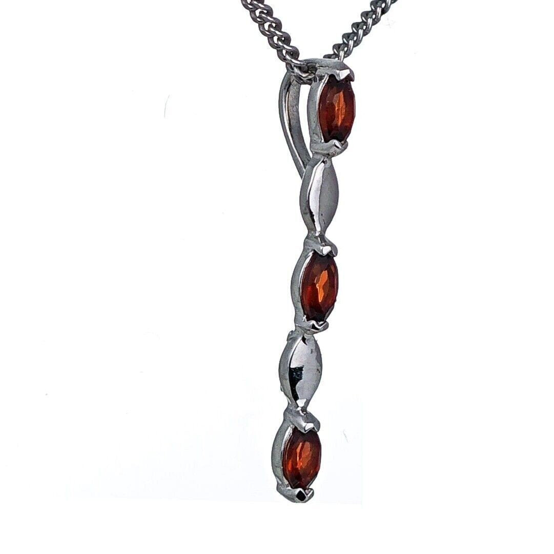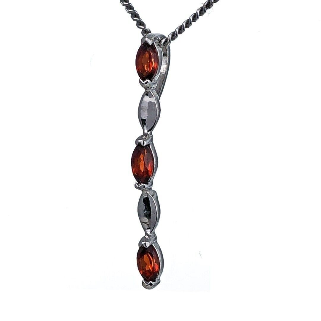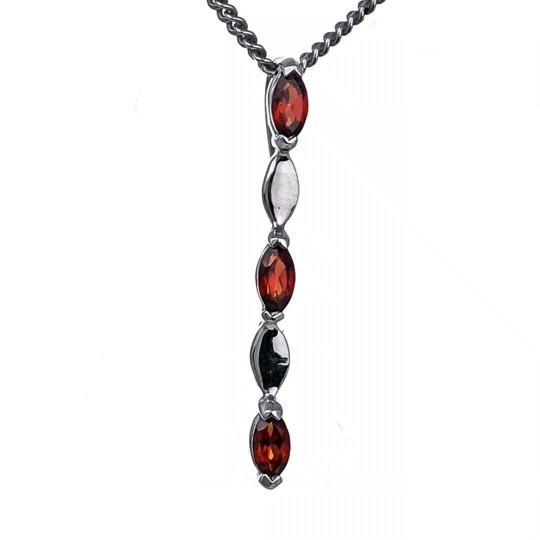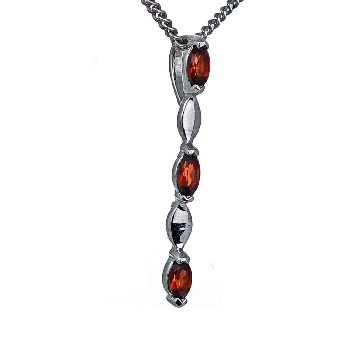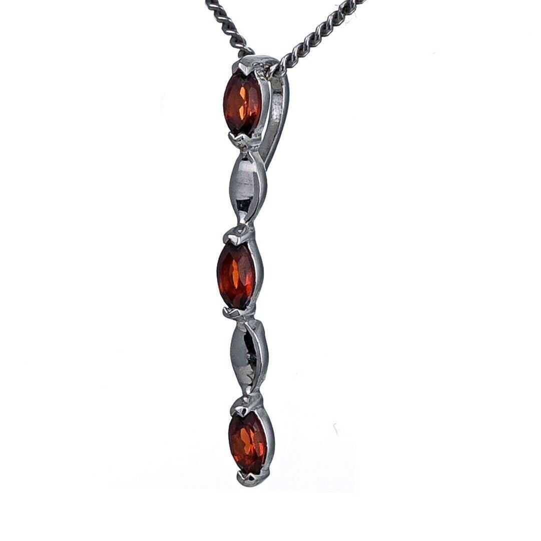 This elegant marquise cut red garnet drop necklace is made of sterling silver and features three natural red garnet gemstones from Mozambique. Each stone measures 4 x 2mm, giving an approximate total carat weight of 0.32ct. Red garnet is associated with passion, love, and vitality, and is the birthstone for January.
