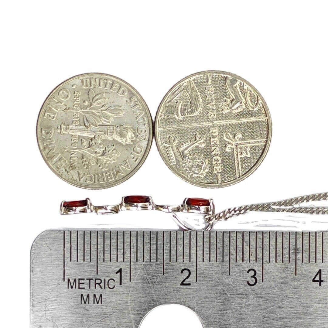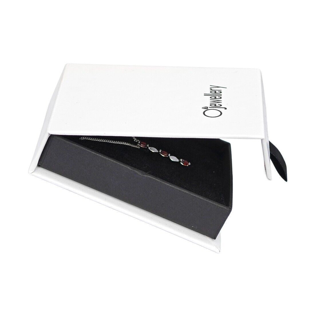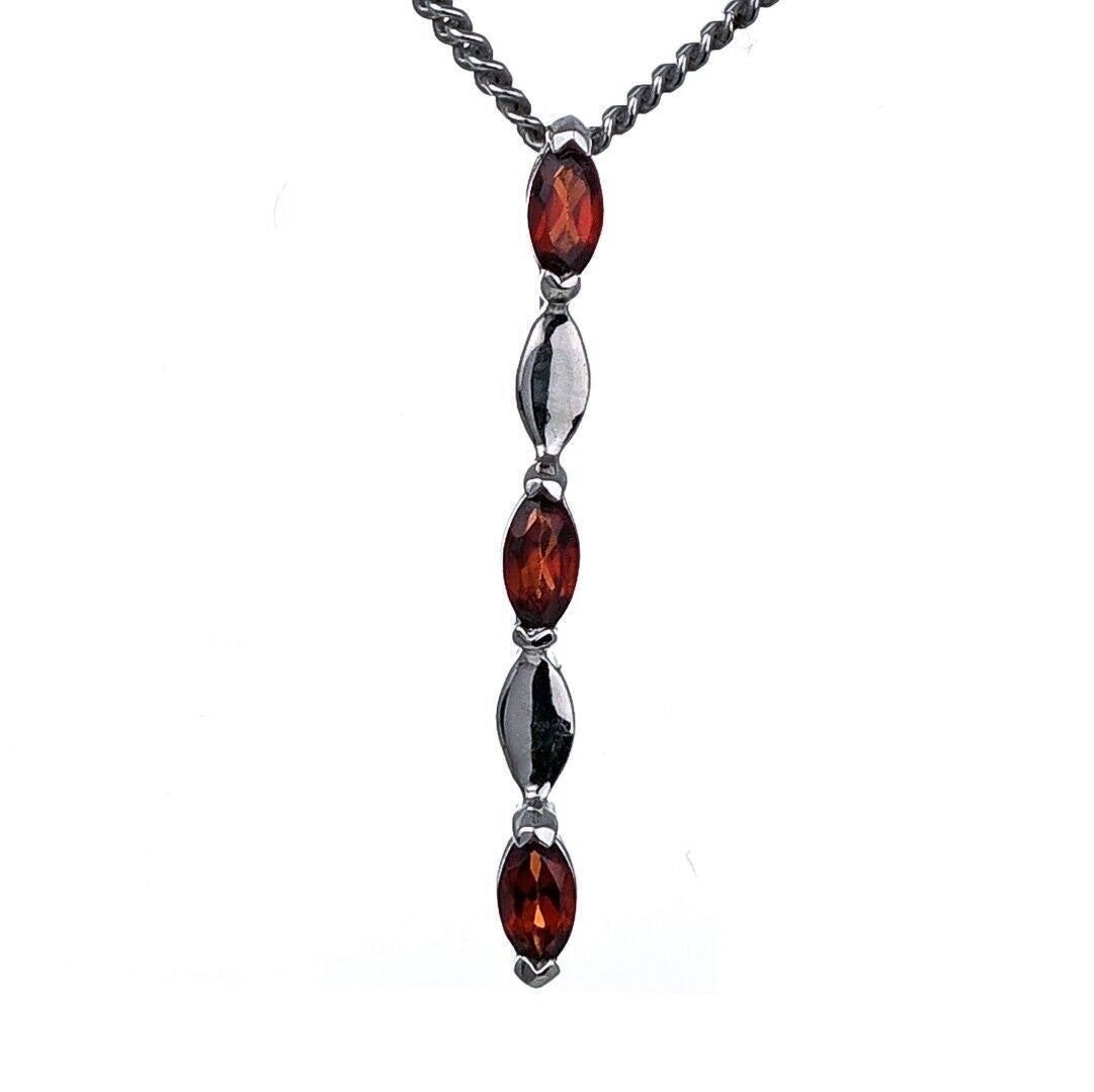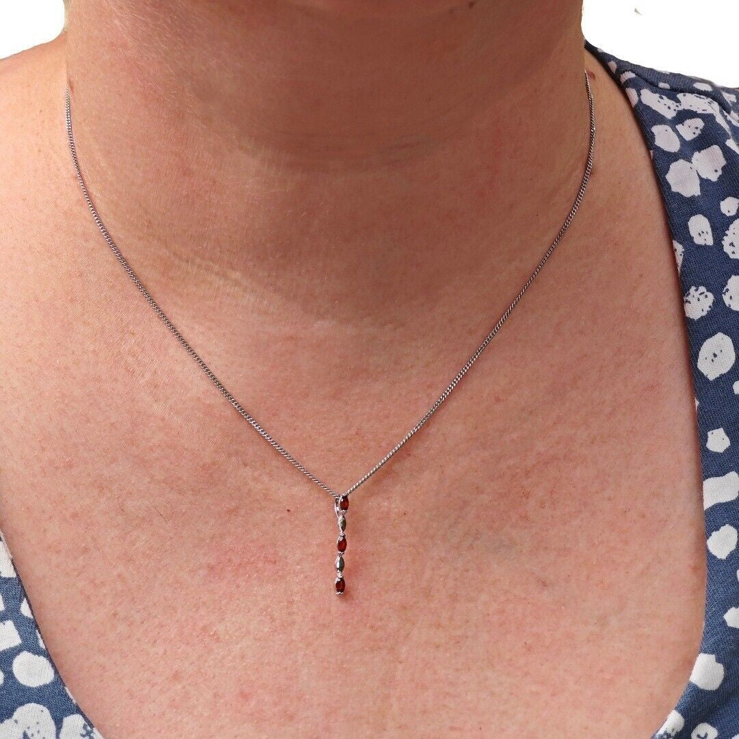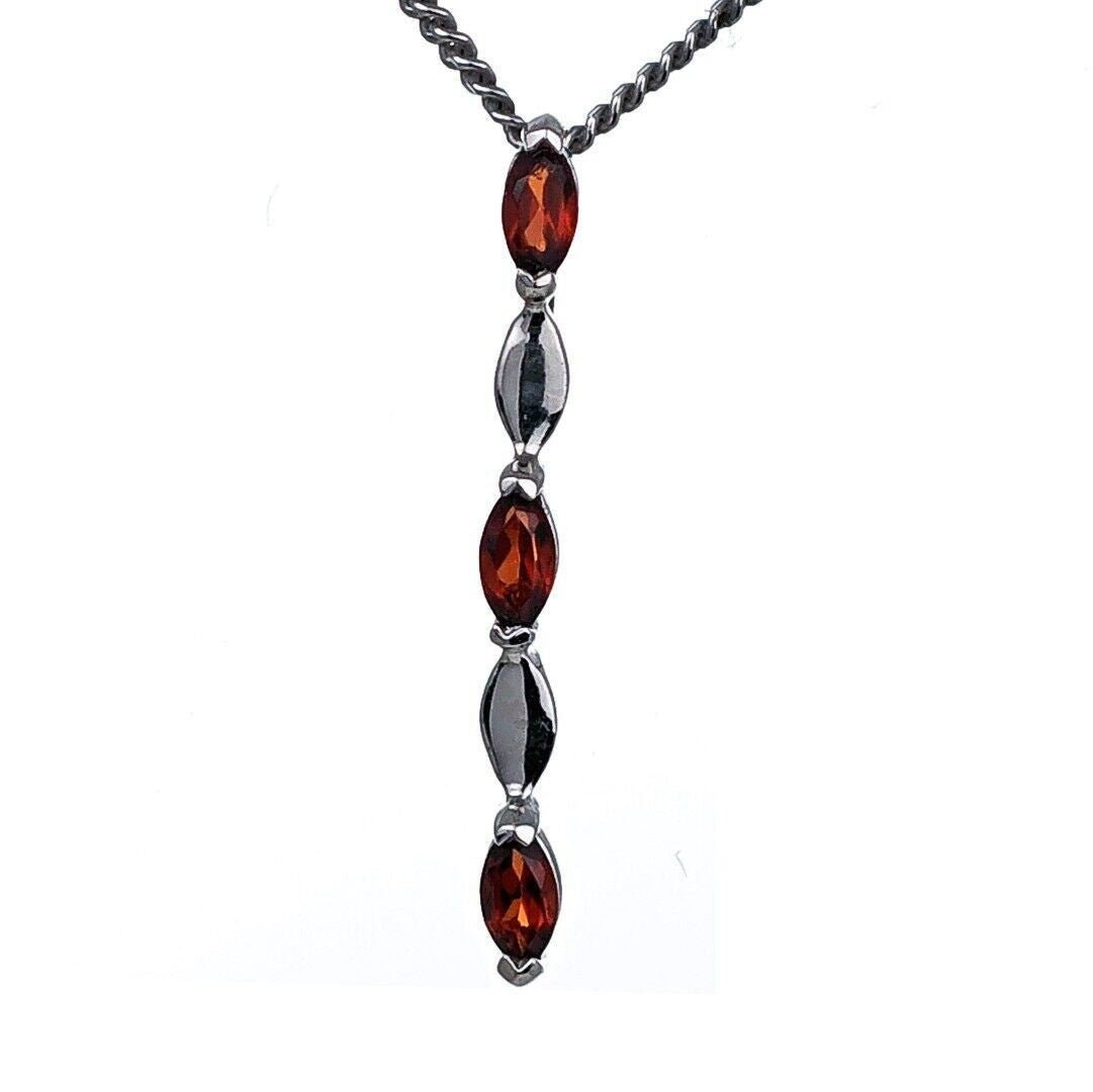 This elegant marquise cut red garnet drop necklace is made of sterling silver and features three natural red garnet gemstones from Mozambique. Each stone measures 4 x 2mm, giving an approximate total carat weight of 0.32ct. Red garnet is associated with passion, love, and vitality, and is the birthstone for January.