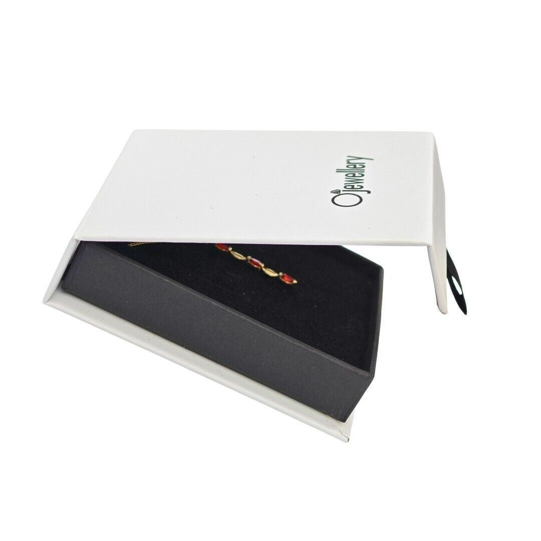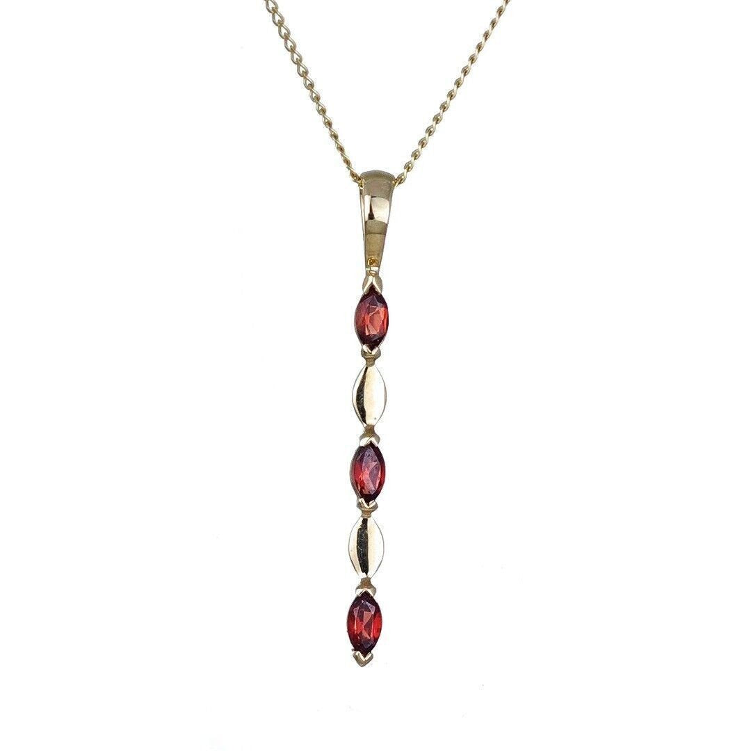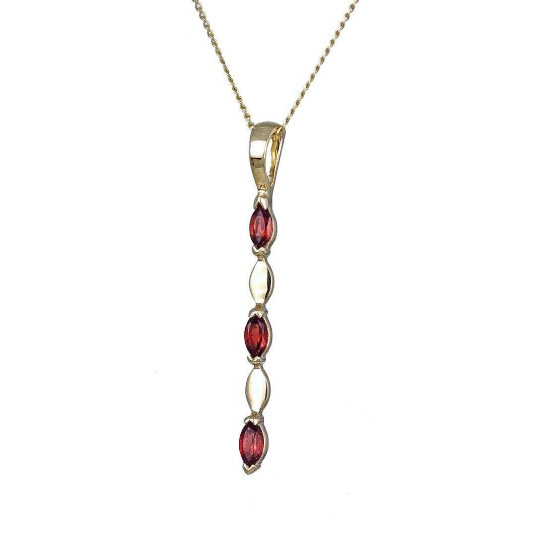 This elegant marquise cut red garnet drop necklace is made of 9ct Yellow Gold and features three natural red garnet gemstones from Mozambique. Each stone measures 4 x 2mm, giving an approximate total carat weight of 0.32ct. Red garnet is associated with passion, love, and vitality, and is the birthstone for January.