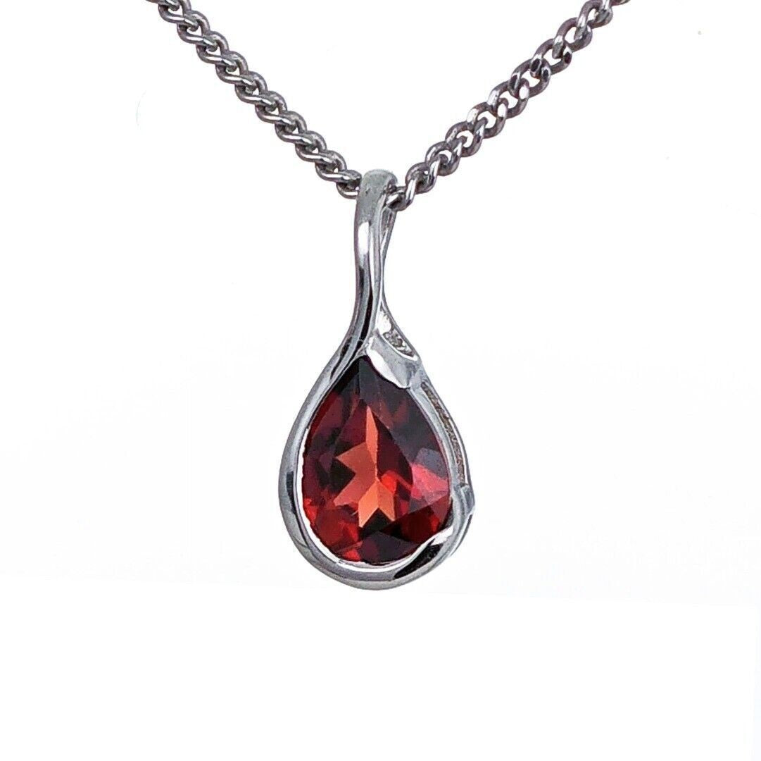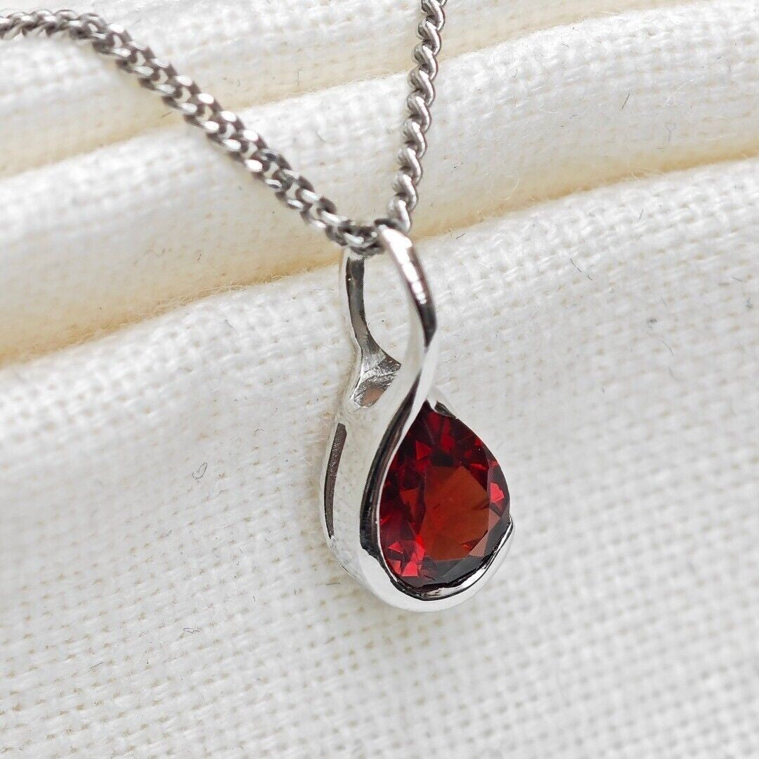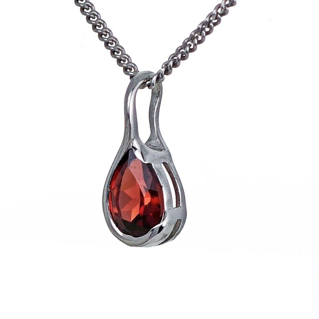 This elegant red Garnet pear pendant is designed in the UK and handmade. It features a natural red Garnet gemstone from Mozambique. The stone is set in a raised flush setting made of sterling silver to allow light to the back of the stone and show off its natural sparkle.