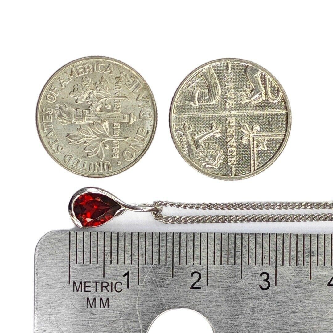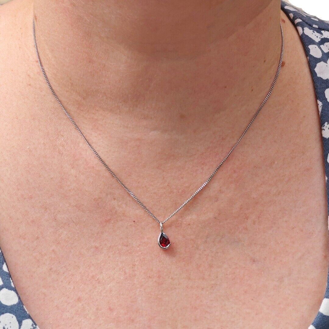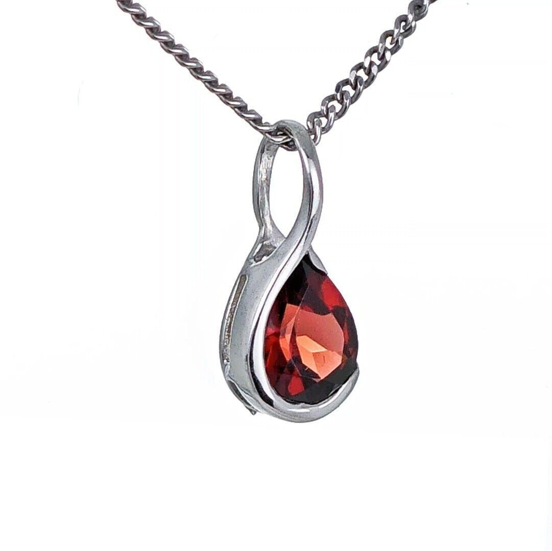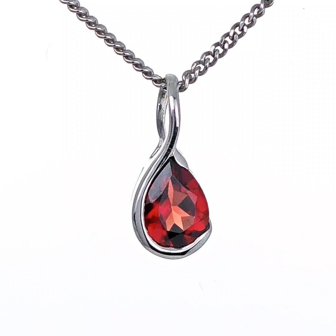 This elegant red Garnet pear pendant is designed in the UK and handmade. It features a natural red Garnet gemstone from Mozambique. The stone is set in a raised flush setting made of sterling silver to allow light to the back of the stone and show off its natural sparkle.