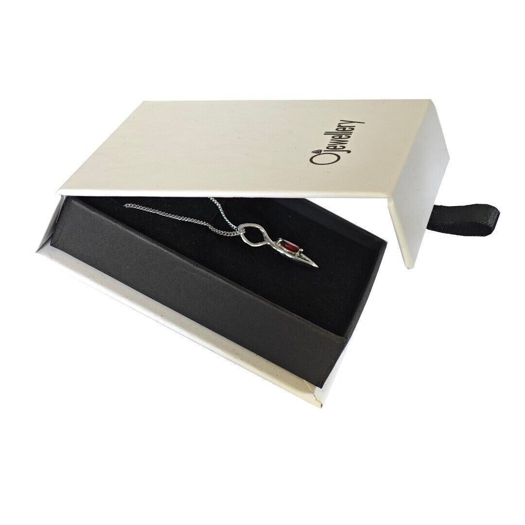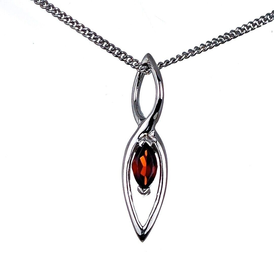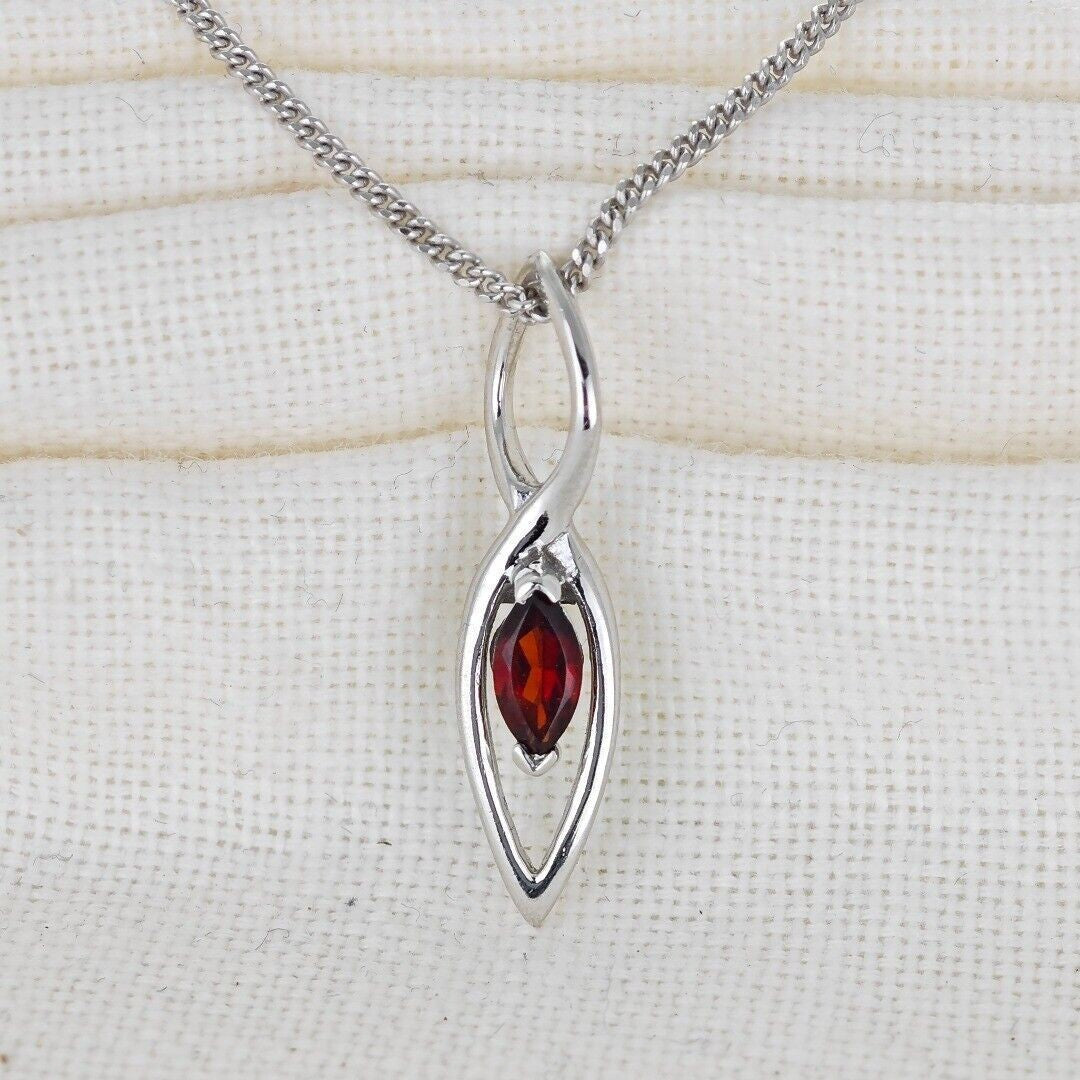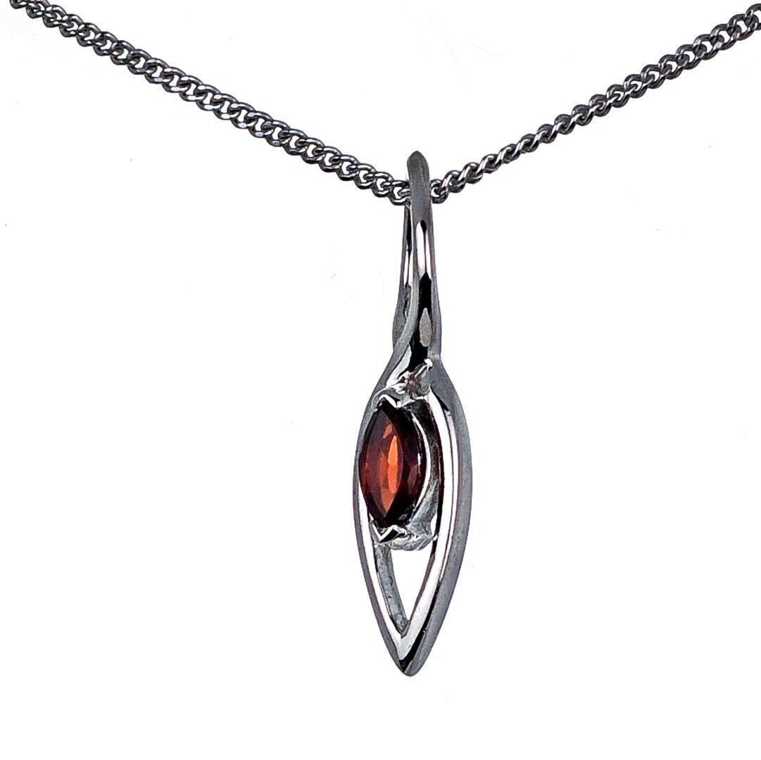 Sterling Silver minimalist marquise design dangle pendant.Garnets are associated with firey passion, strength, and creativity. They are the birthstone for January.Finished with a commercial grade rhodium plate to give a high quality shine finish.Supplied in an Ojewellery presentation box, within a ribbon handled gift bag, complete with product information authenticity card with space for a gift message and a jewellery cleaning cloth to keep your jewellery in ready to wear condition.Our packaging is from FSC chain of custody audited suppliers and our very short supply chain means we can trace our gemstones back to country of origin.Specification:Chain 18inch curb linkPendant Width: 6 mmPendant Height: 23.4 mmWeight: 3.6 gStone: Natural Mozambique Red Garnet, marquise cut 6x3mm Metal mark: 925 for sterling silver