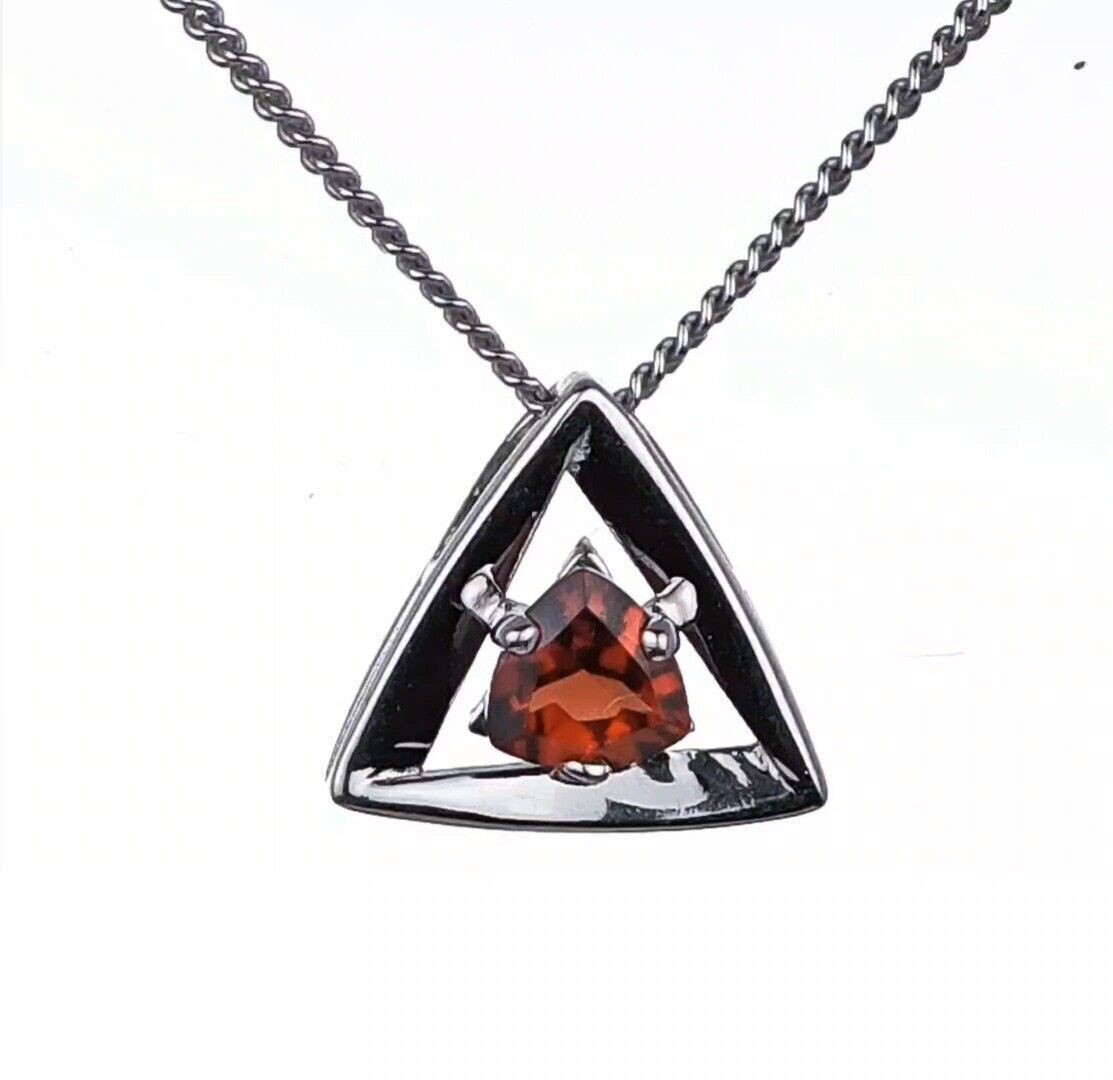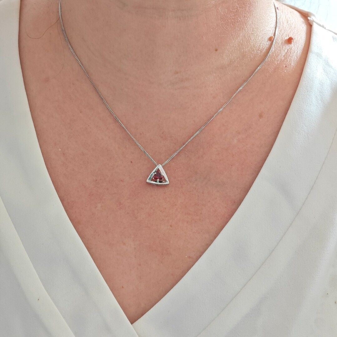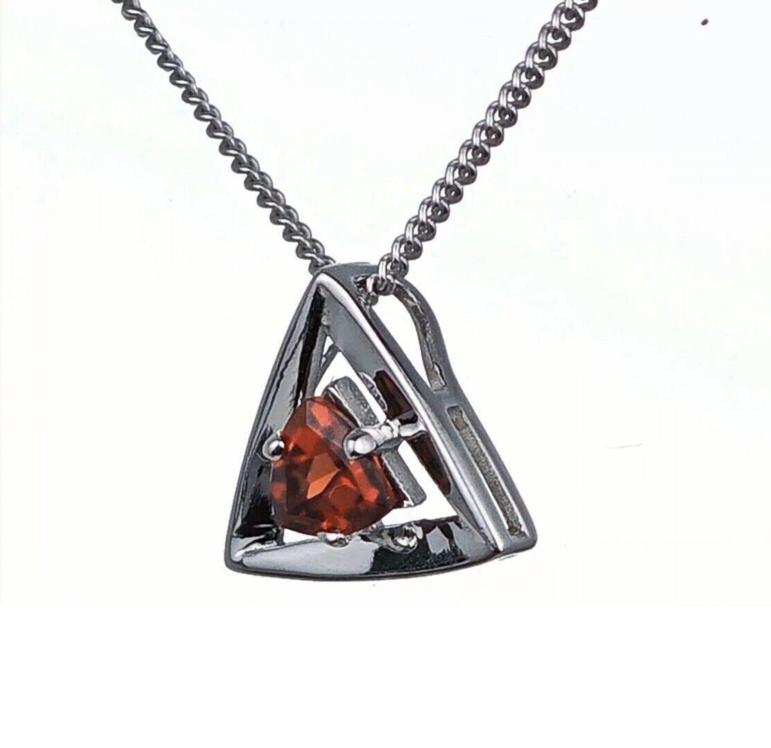 Trillion cut stone set in a triangle made of sterling silver. The stone measures 5 x 5mmGarnets are associated with firey passion, strength, and creativity. They are the birthstone for January.These elegant pendant suitable to wear for daytime or evening wear.Finished with a commercial grade rhodium plate to give a high quality shine finish.Supplied in an Ojewellery presentation box, within a ribbon handled gift bag, complete with product information authenticity card with space for a gift message and a jewellery cleaning cloth to keep your jewellery in ready to wear condition.Our jewellery packaging is from an FSC chain of custody audited supplier and our very short supply chains mean we are able to trace our natural gemstones back to country of origin.Specification:Chain Curb Link 18 inch with lobster clasp fasteningPendant Drop: 11.5mmPendant Width: 12.6mmWeight: 3.5gStones Natural Mozambique Red Garnet Trillion cut 5 x 5mm