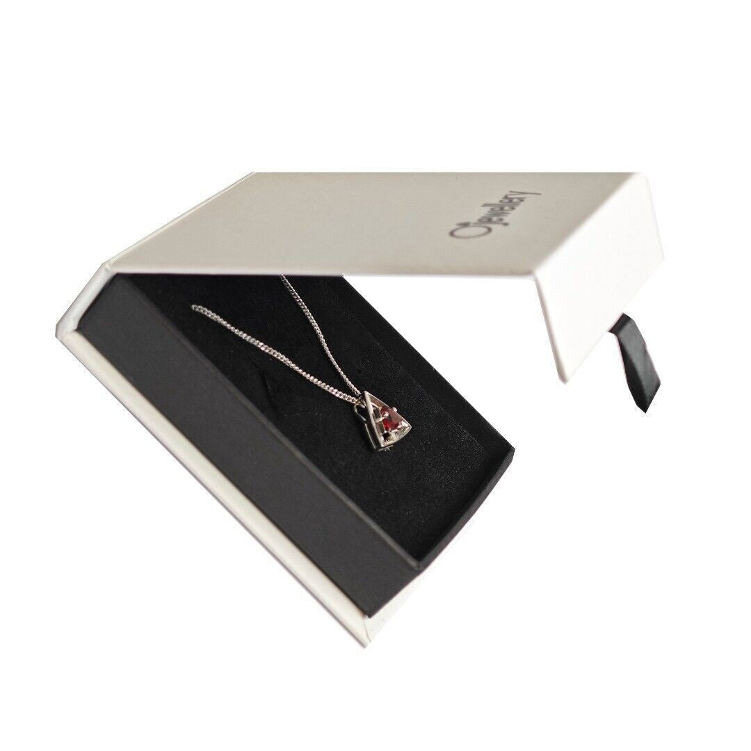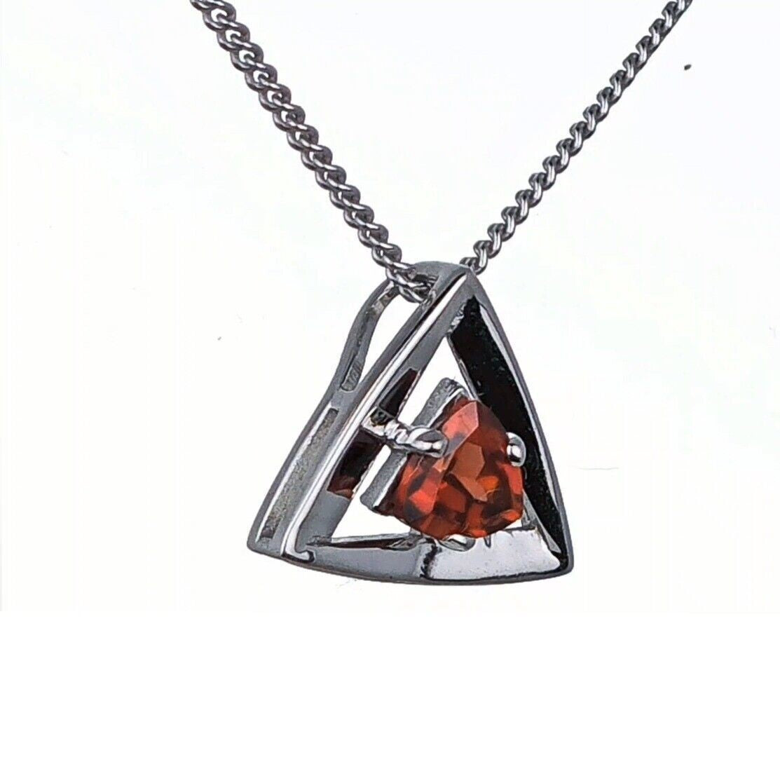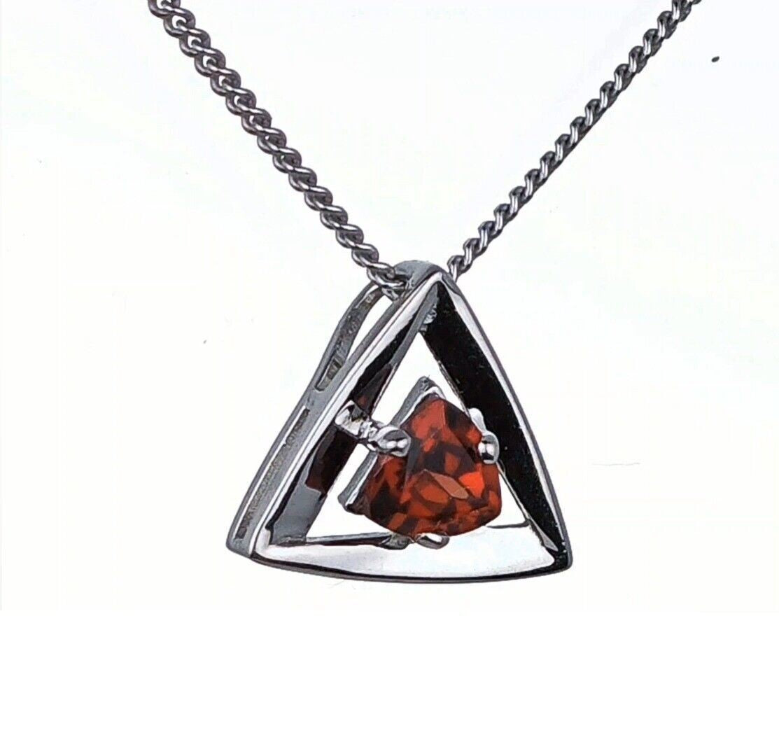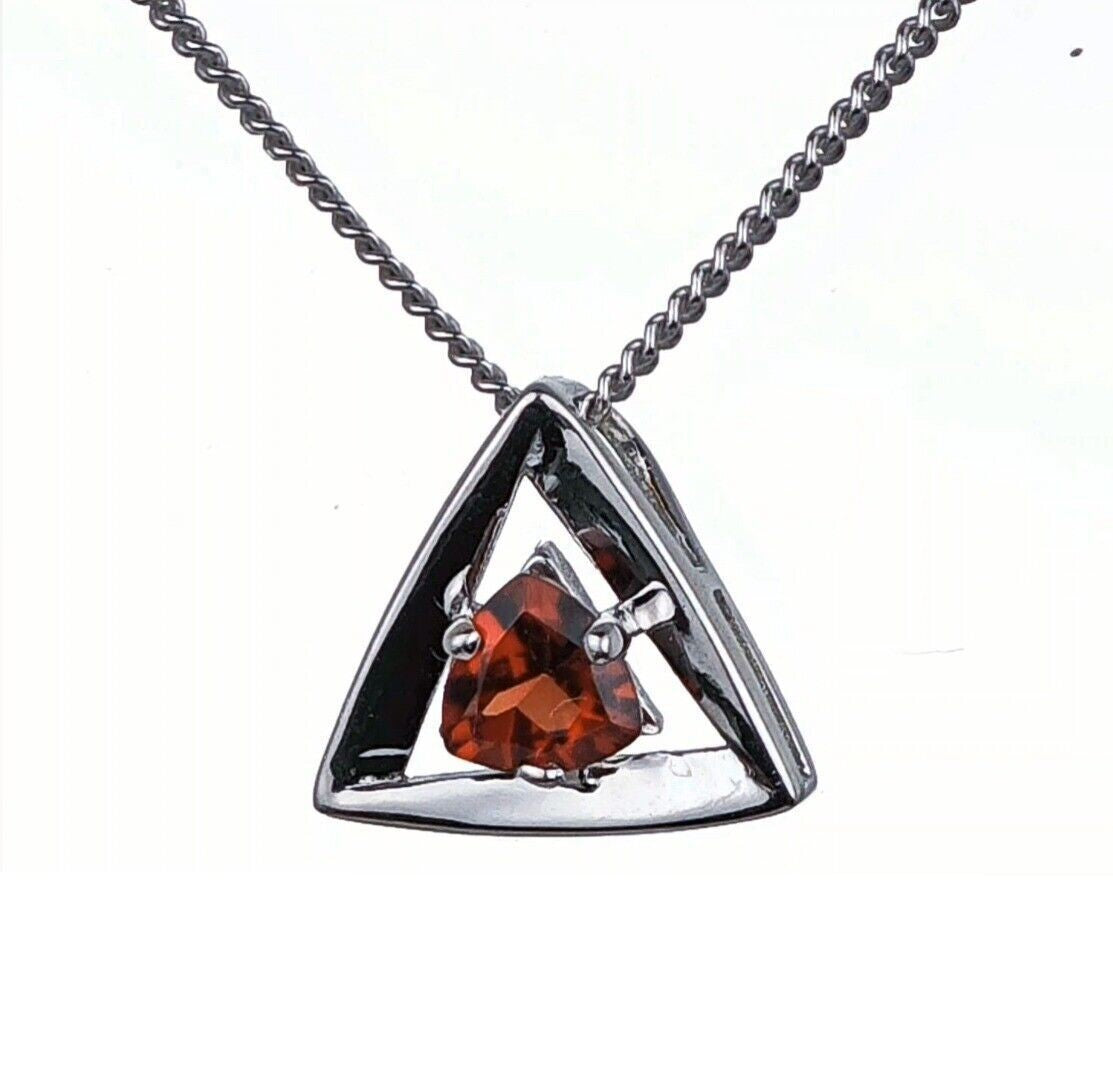 Trillion cut stone set in a triangle made of sterling silver. The stone measures 5 x 5mmGarnets are associated with firey passion, strength, and creativity. They are the birthstone for January.These elegant pendant suitable to wear for daytime or evening wear.Finished with a commercial grade rhodium plate to give a high quality shine finish.Supplied in an Ojewellery presentation box, within a ribbon handled gift bag, complete with product information authenticity card with space for a gift message and a jewellery cleaning cloth to keep your jewellery in ready to wear condition.Our jewellery packaging is from an FSC chain of custody audited supplier and our very short supply chains mean we are able to trace our natural gemstones back to country of origin.Specification:Chain Curb Link 18 inch with lobster clasp fasteningPendant Drop: 11.5mmPendant Width: 12.6mmWeight: 3.5gStones Natural Mozambique Red Garnet Trillion cut 5 x 5mm