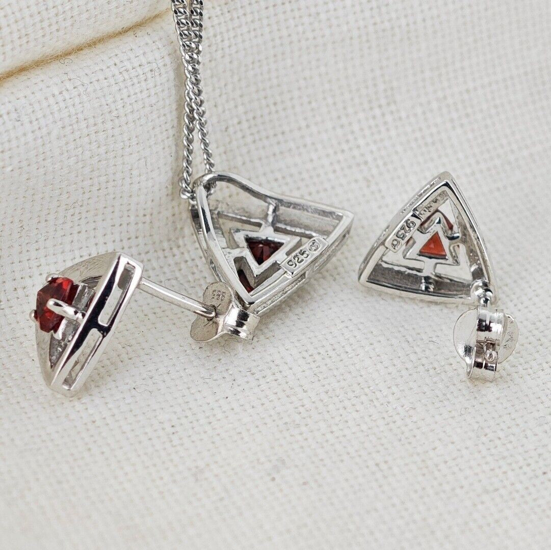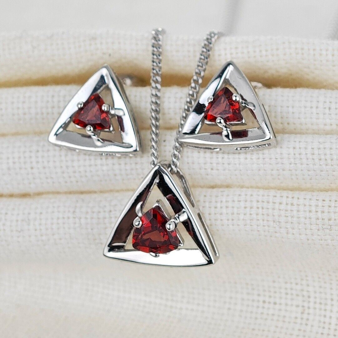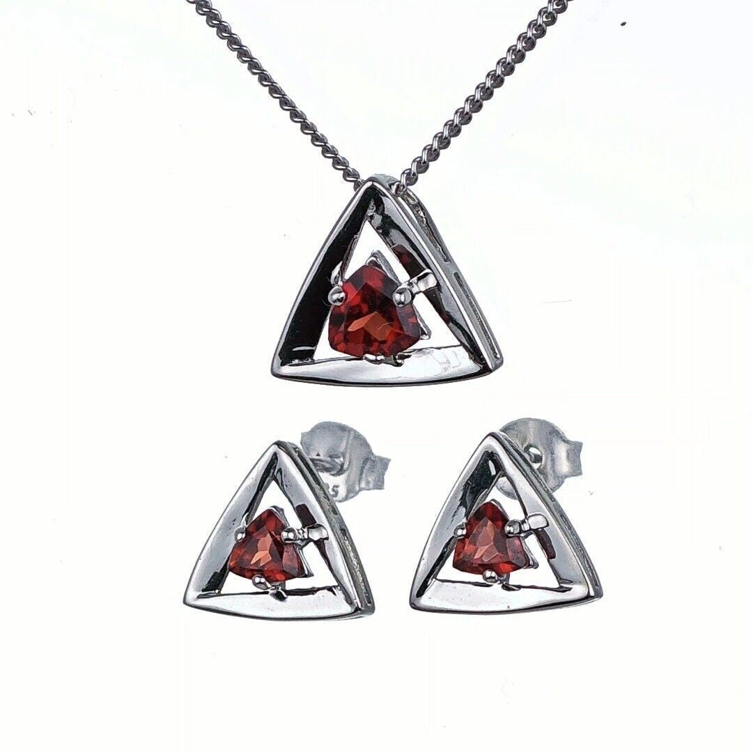 Trillion cut natural stones set in a triangle made of sterling silver. Each stud stone measures 4 x 4mm and the pendant stone is 5x5mm Garnets are associated with firey passion, strength, and creativity. They are the birthstone for January. This elagent set is suitable to wear for daytime or evening wear. Finished with a commercial grade rhodium plate to give a high quality shine finish. Supplied in an Ojewellery presentation box, within a ribbon handled gift bag, complete with product information authenticity card with space for a gift message and a jewellery cleaning cloth to keep your jewellery in ready to wear condition. Our jewellery packaging is from an FSC chain of custody audited supplier and our very short supply chains mean we are able to trace our natural gemstones back to country of origin. Specification: Fastening: Butterfly Earring Drop: 10.2mm Earring Width: 10.7mm Weight of pair:1.9g Stones Natural Mozambique Red Garnets trillion cut 2qty 4 x 4mm Chain Curb Link 18 inch with lobster clasp fastening Pendant Drop: 11.5mm Pendant Width: 12.6mm Weight: 3.5g Stones Natural Mozambique Red Garnet Trillion cut 5 x 5mm