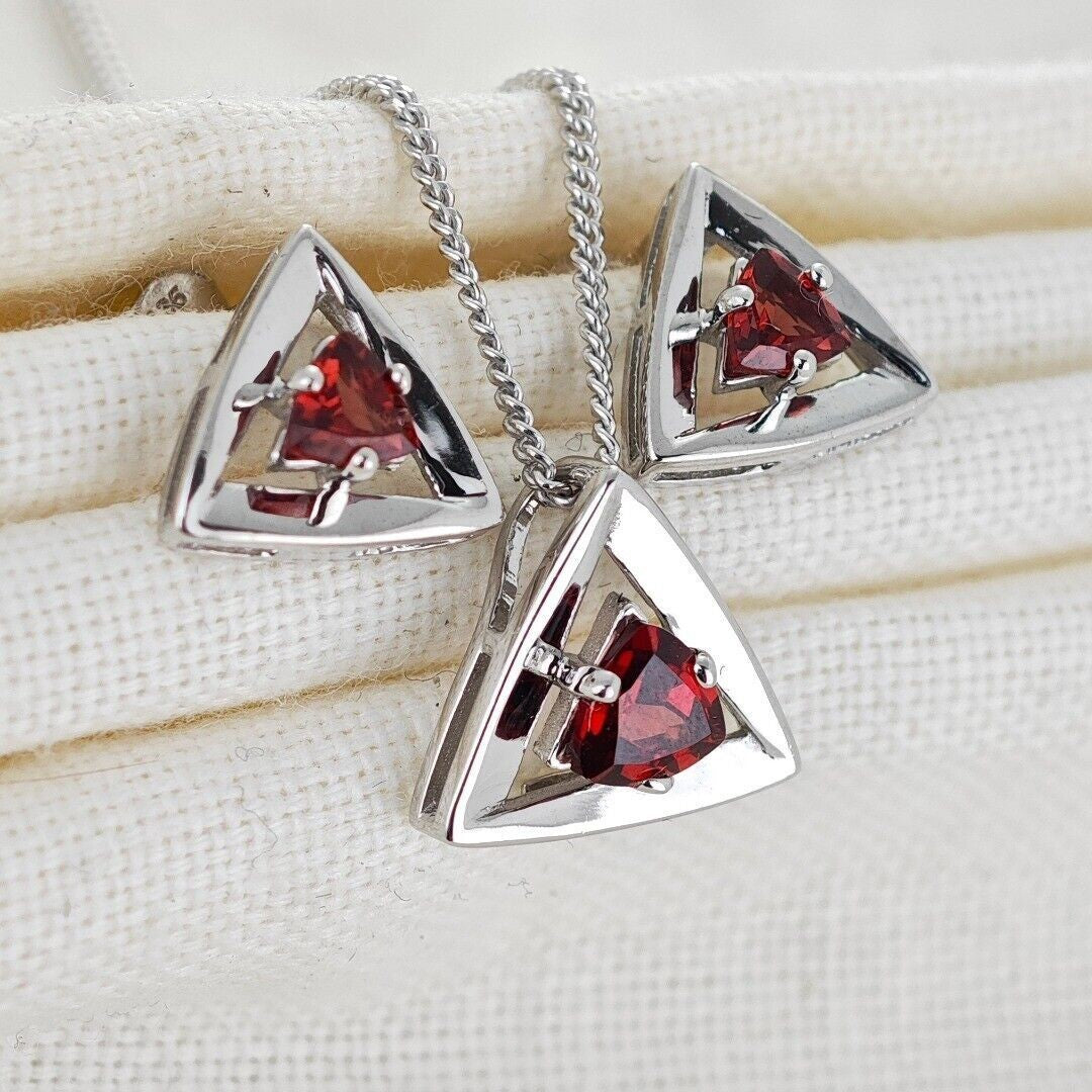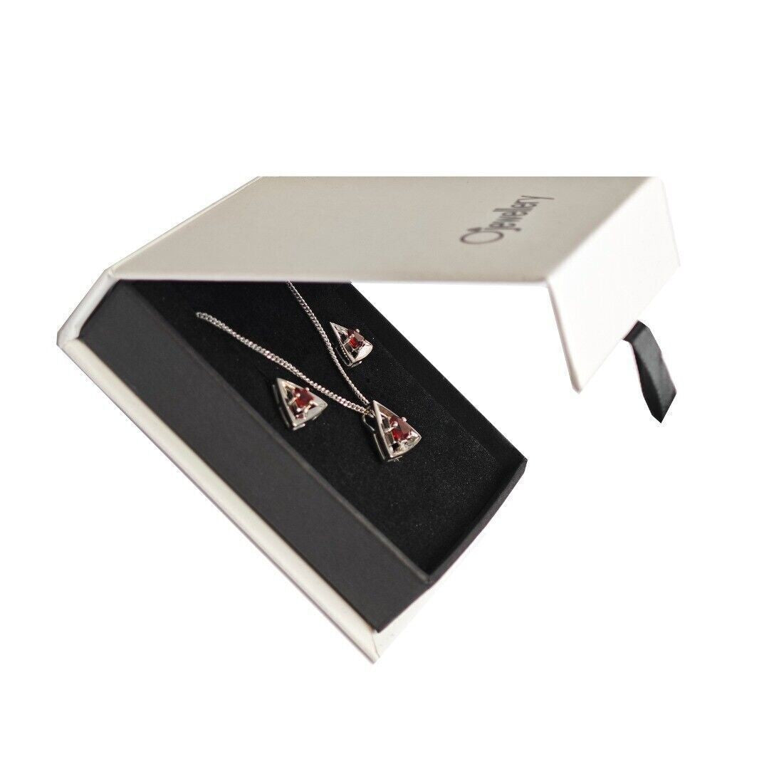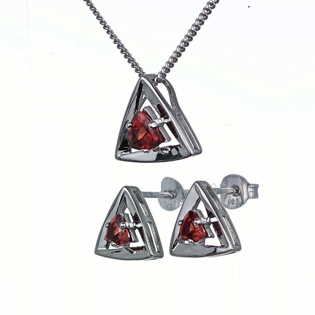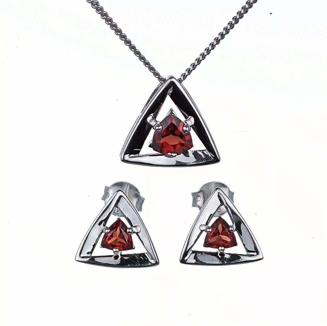 Trillion cut natural stones set in a triangle made of sterling silver. Each stud stone measures 4 x 4mm and the pendant stone is 5x5mm Garnets are associated with firey passion, strength, and creativity. They are the birthstone for January. This elagent set is suitable to wear for daytime or evening wear. Finished with a commercial grade rhodium plate to give a high quality shine finish. Supplied in an Ojewellery presentation box, within a ribbon handled gift bag, complete with product information authenticity card with space for a gift message and a jewellery cleaning cloth to keep your jewellery in ready to wear condition. Our jewellery packaging is from an FSC chain of custody audited supplier and our very short supply chains mean we are able to trace our natural gemstones back to country of origin. Specification: Fastening: Butterfly Earring Drop: 10.2mm Earring Width: 10.7mm Weight of pair:1.9g Stones Natural Mozambique Red Garnets trillion cut 2qty 4 x 4mm Chain Curb Link 18 inch with lobster clasp fastening Pendant Drop: 11.5mm Pendant Width: 12.6mm Weight: 3.5g Stones Natural Mozambique Red Garnet Trillion cut 5 x 5mm