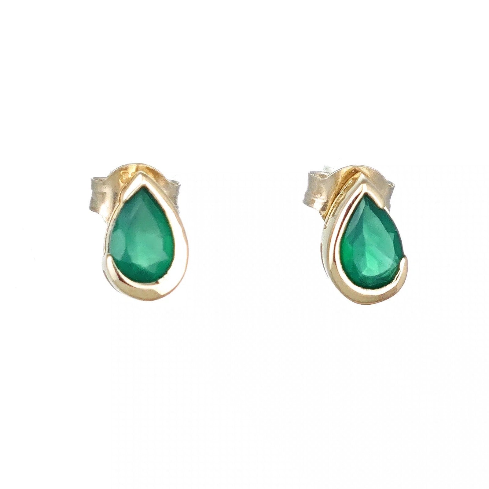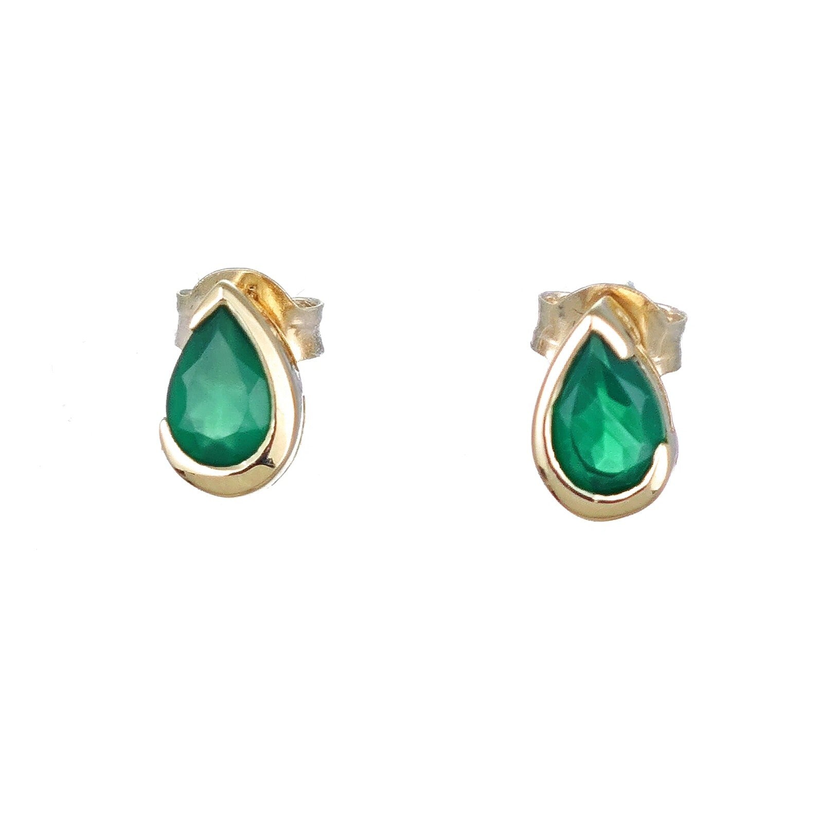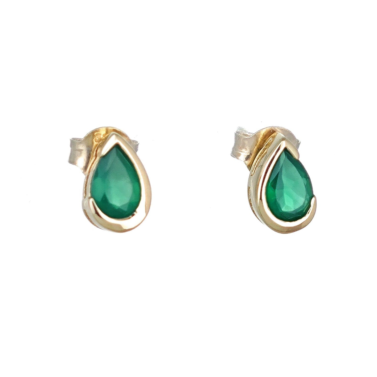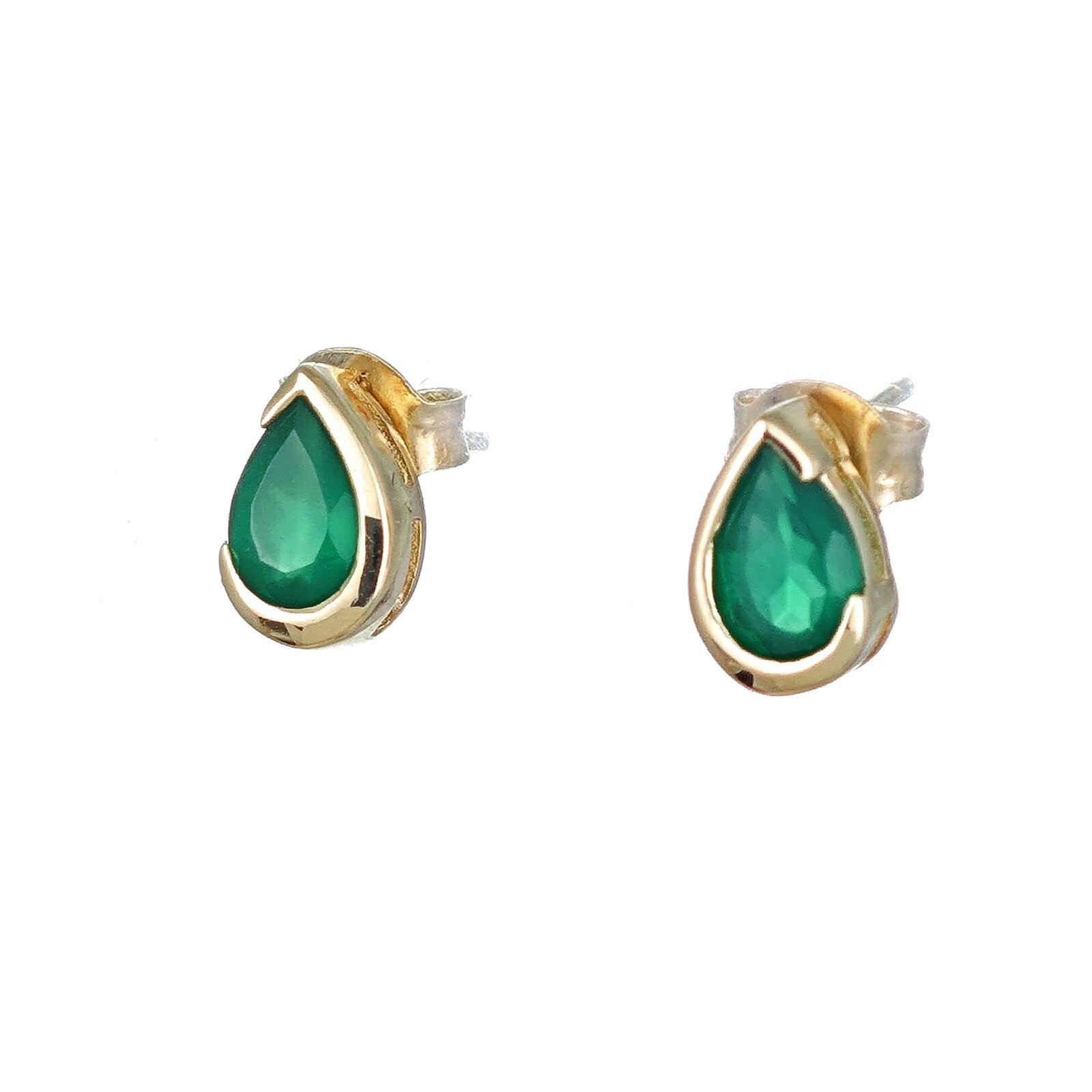 These elegant stud earrings feature pear-shaped natural green onyx stones from India. The stones measure 6x4 mm and are set in a raised rubover setting made of 9ct Yellow Gold to allow light to the back of the stone and show off its natural sparkle. The earrings are finished with a commercial grade rhodium plate to give a high quality shine finish.