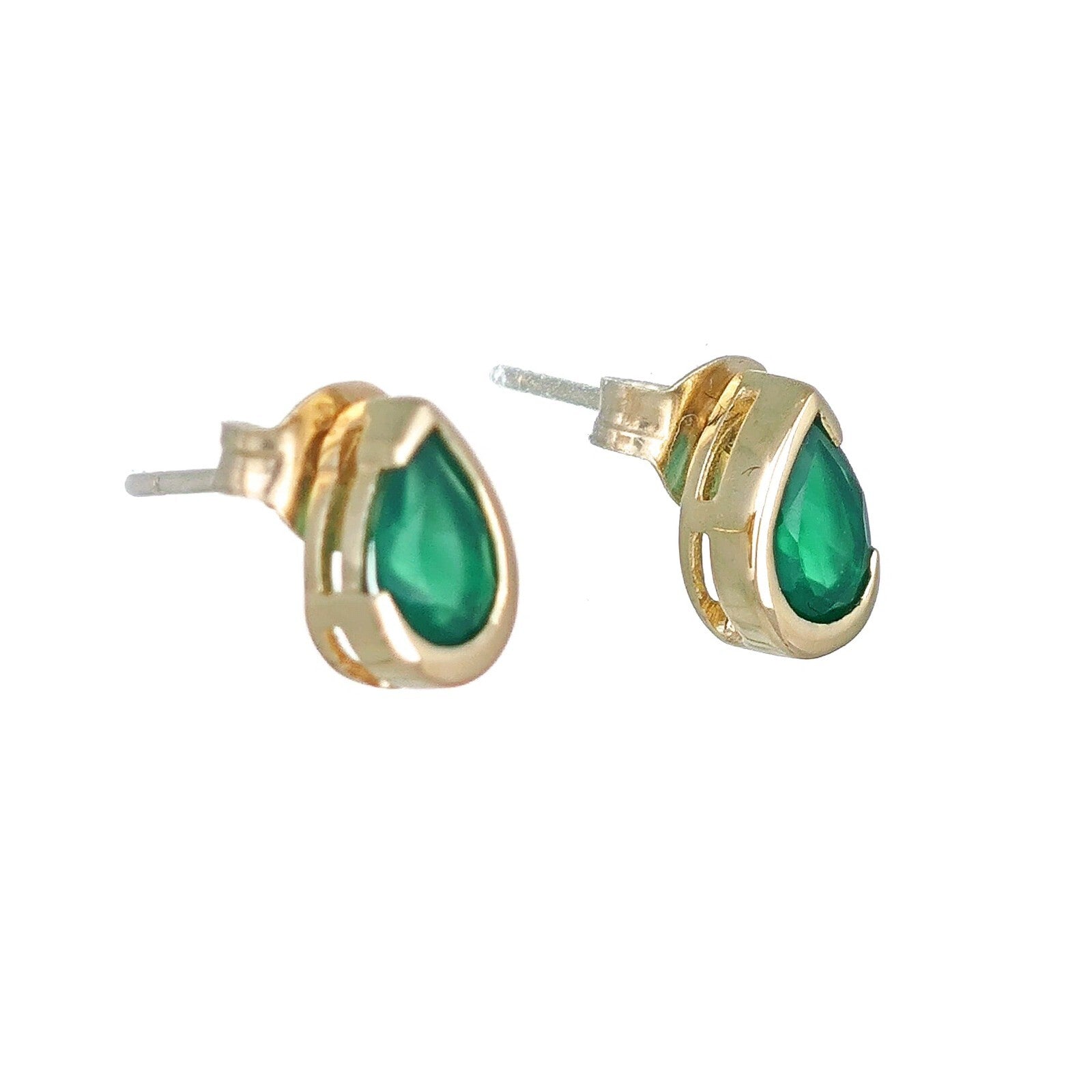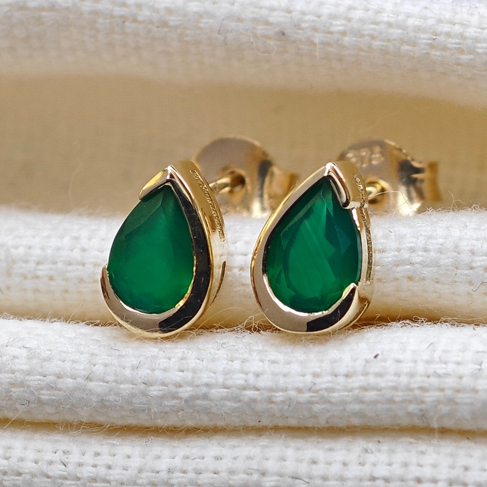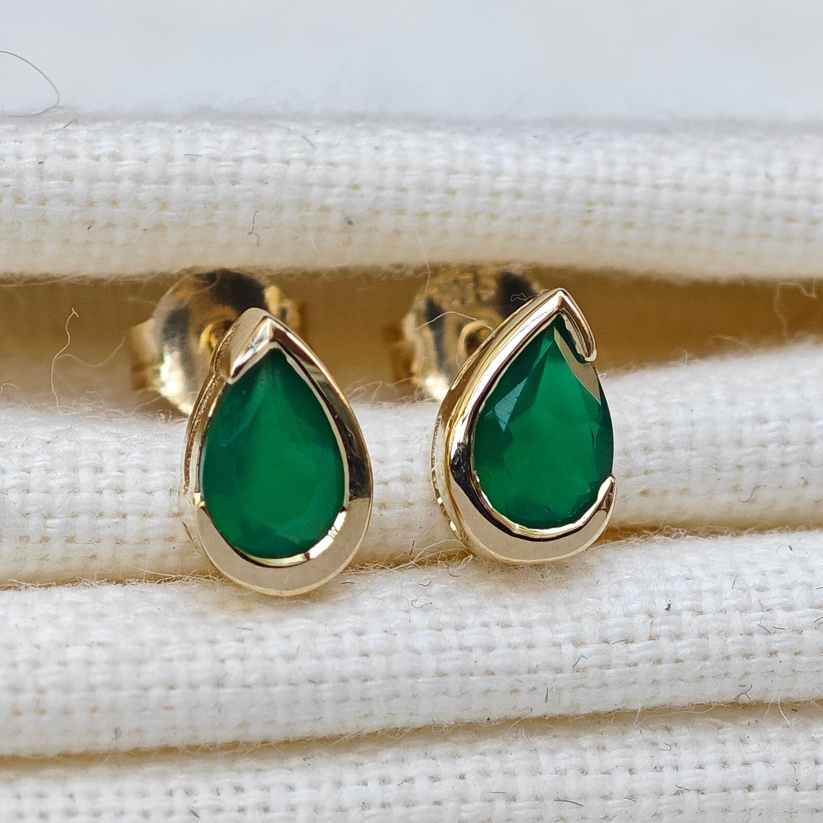These elegant stud earrings feature pear-shaped natural green onyx stones from India. The stones measure 6x4 mm and are set in a raised rubover setting made of 9ct Yellow Gold to allow light to the back of the stone and show off its natural sparkle. The earrings are finished with a commercial grade rhodium plate to give a high quality shine finish.