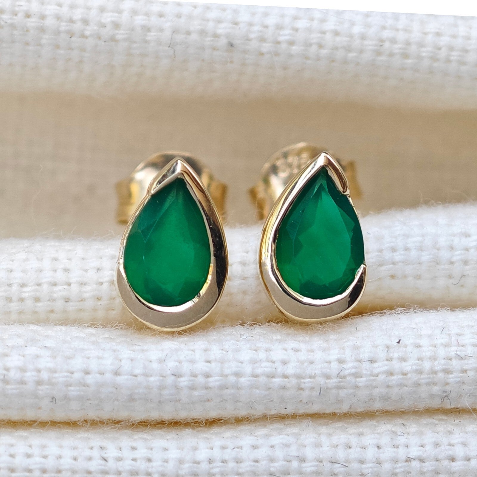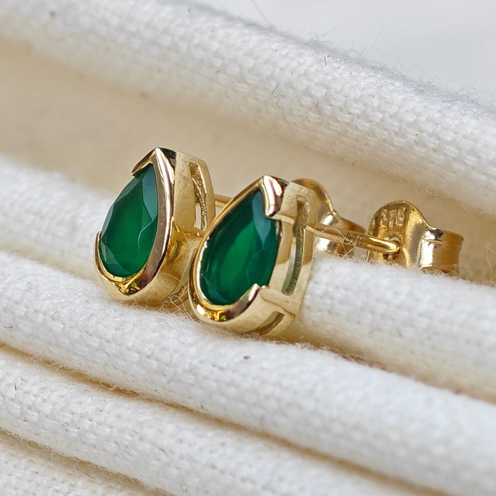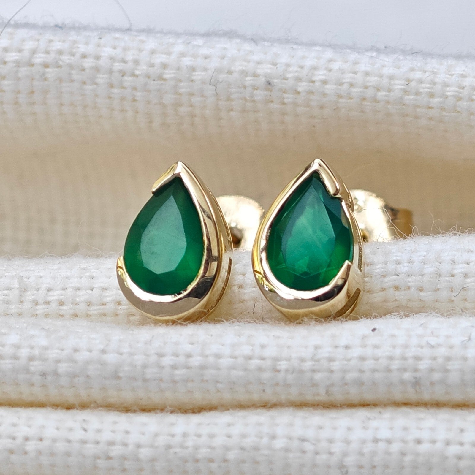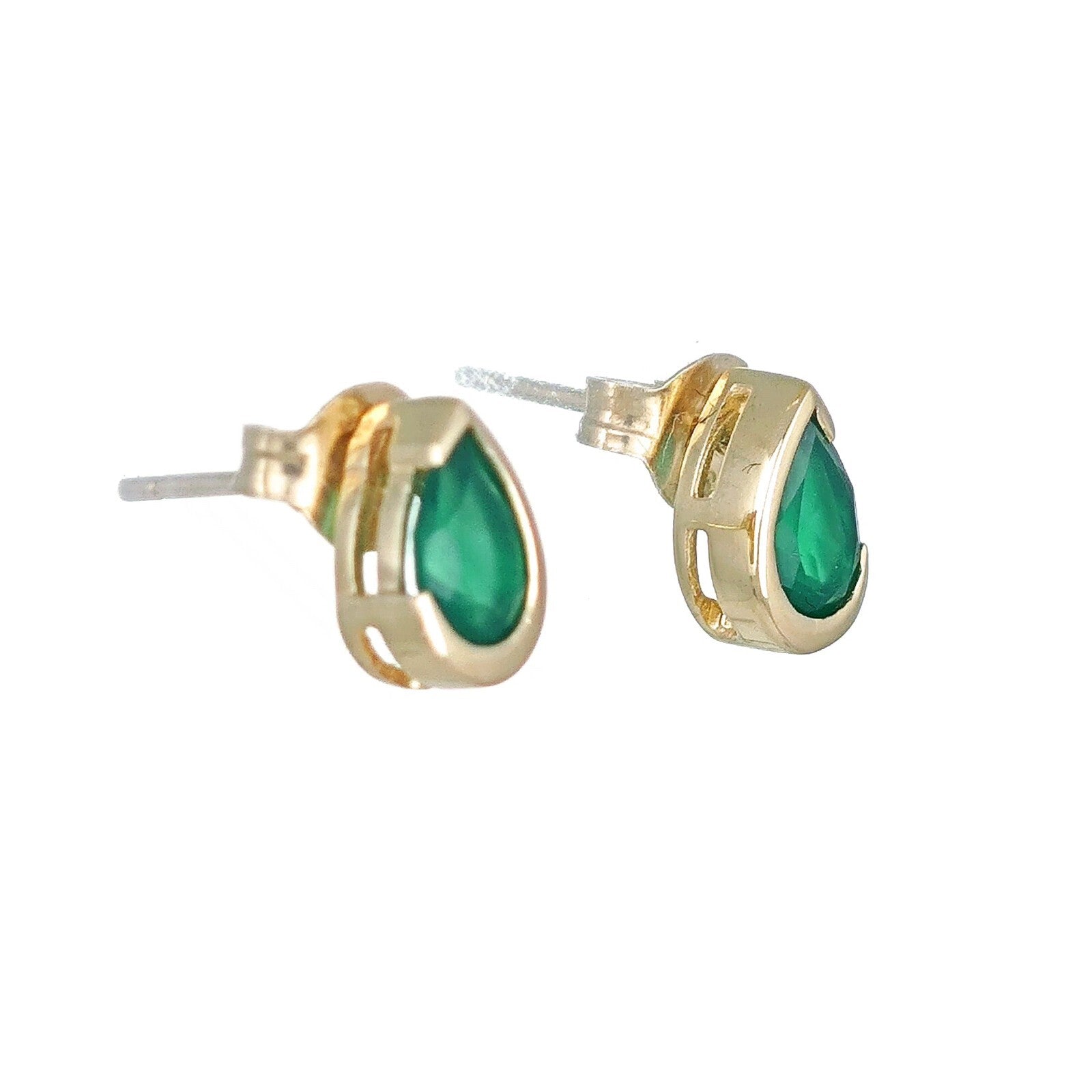 These elegant stud earrings feature pear-shaped natural green onyx stones from India. The stones measure 6x4 mm and are set in a raised rubover setting made of 9ct Yellow Gold to allow light to the back of the stone and show off its natural sparkle. The earrings are finished with a commercial grade rhodium plate to give a high quality shine finish.