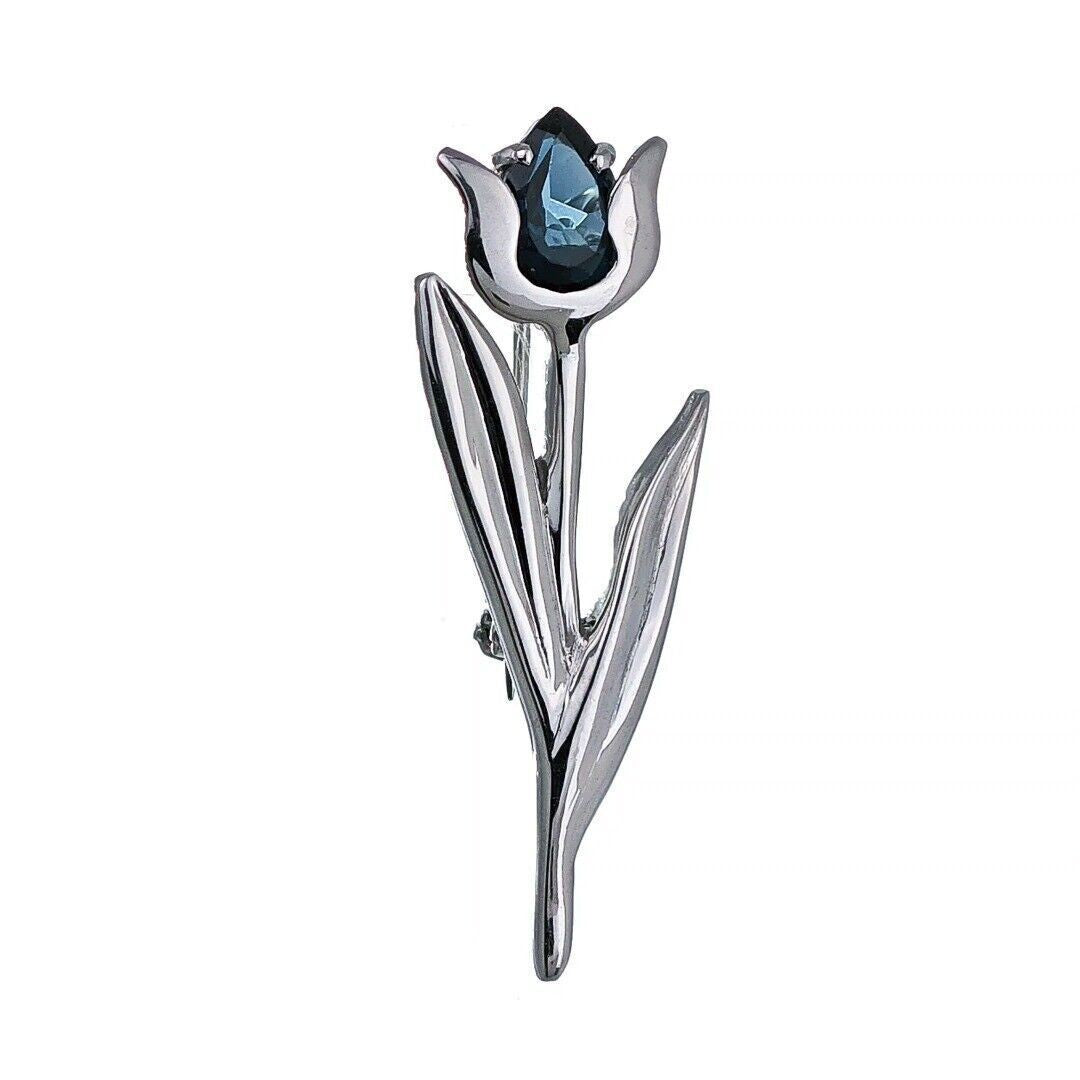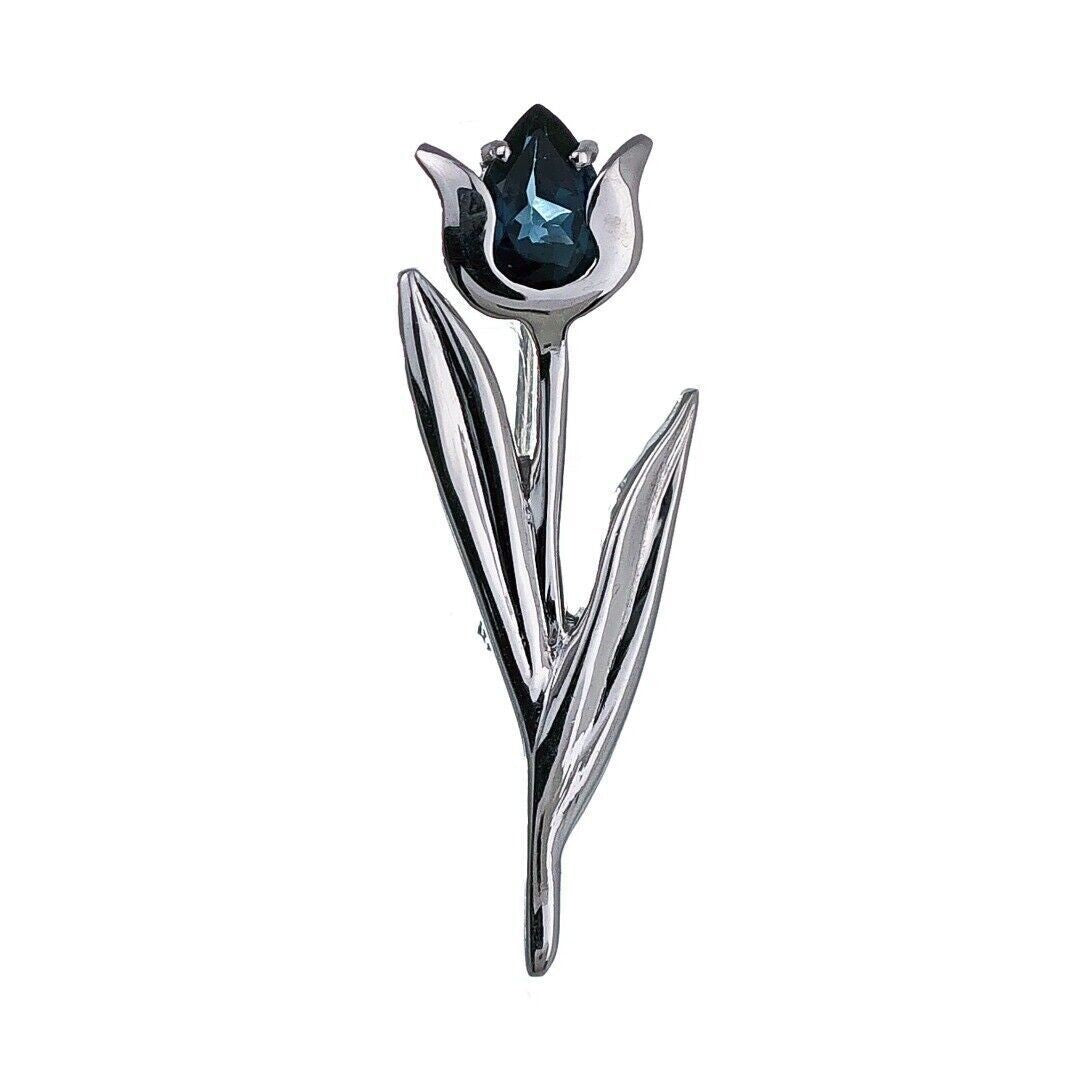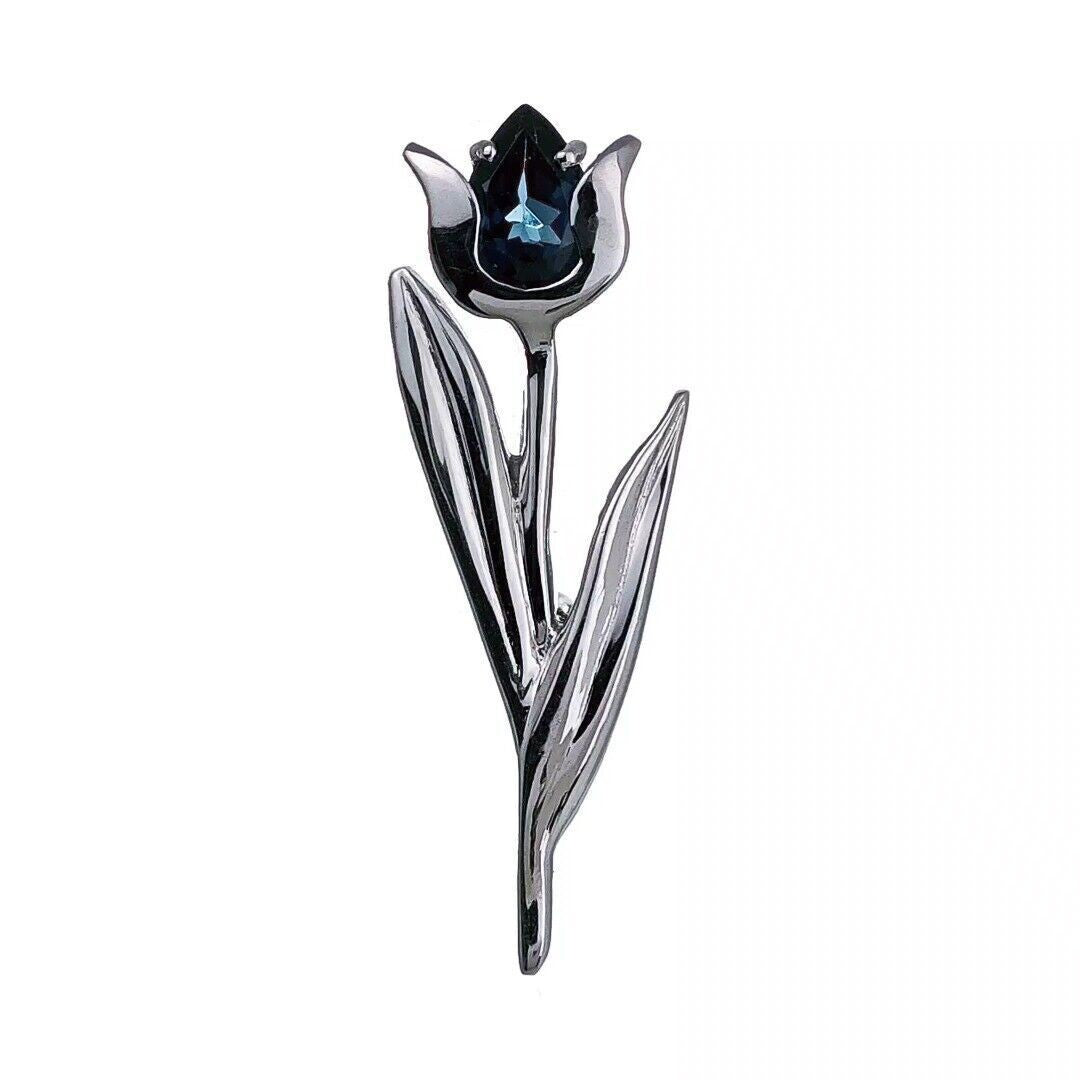 This elegant tulip flower brooch is set with a sparkling London blue topaz gemstone. The natural gemstone is from Africa and measures 7 x 5mm, giving the set an approximate 0.76ct stone weight.