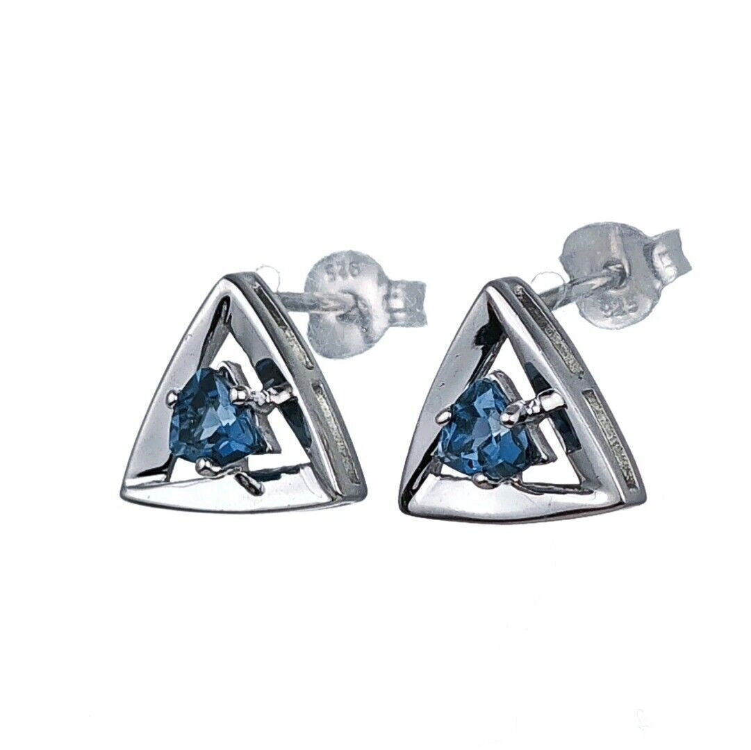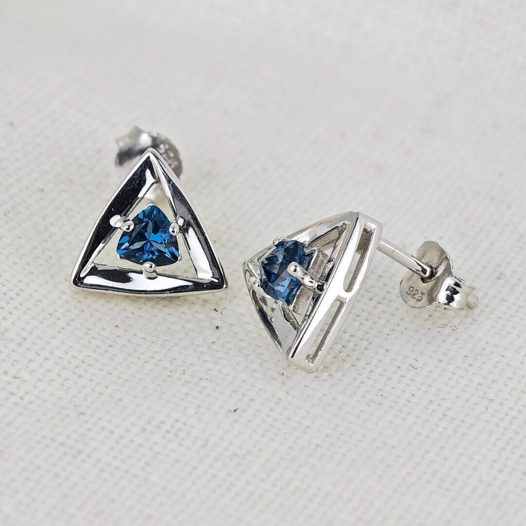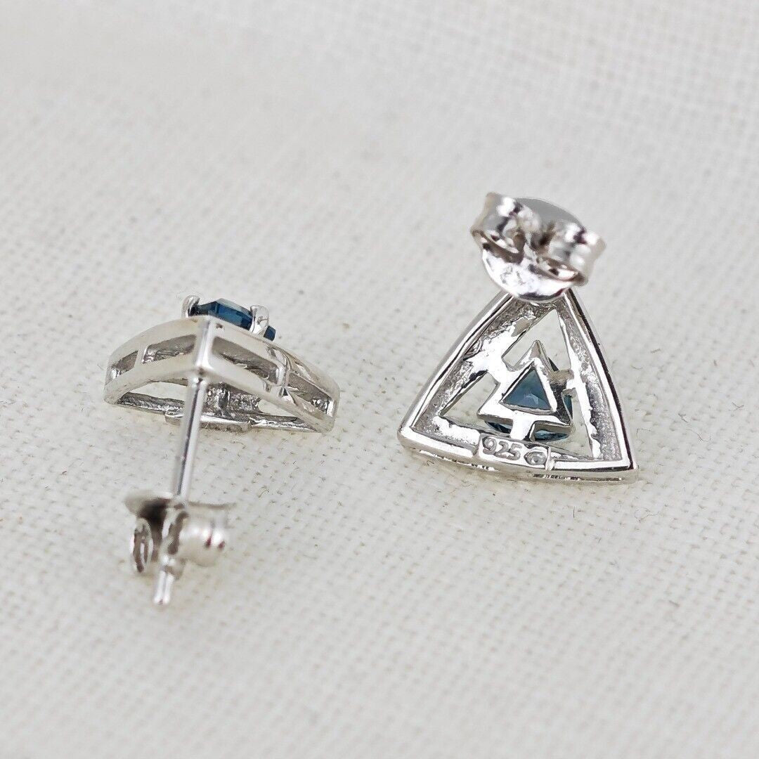 Elegant London blue topaz earrings. Trillion cut topaz set in a triangle made of sterling silver. The London blue topaz are from Africa. Each stone measures 4 x 4mm