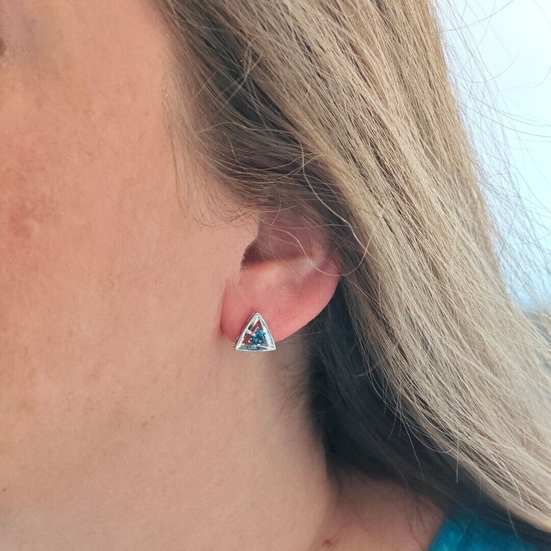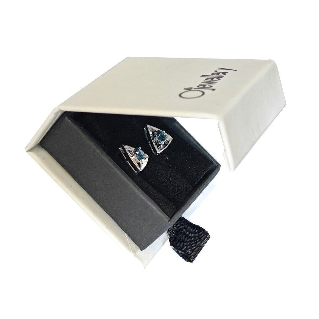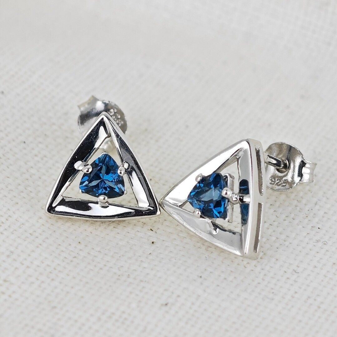 Elegant London blue topaz earrings. Trillion cut topaz set in a triangle made of sterling silver. The London blue topaz are from Africa. Each stone measures 4 x 4mm