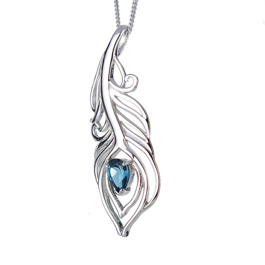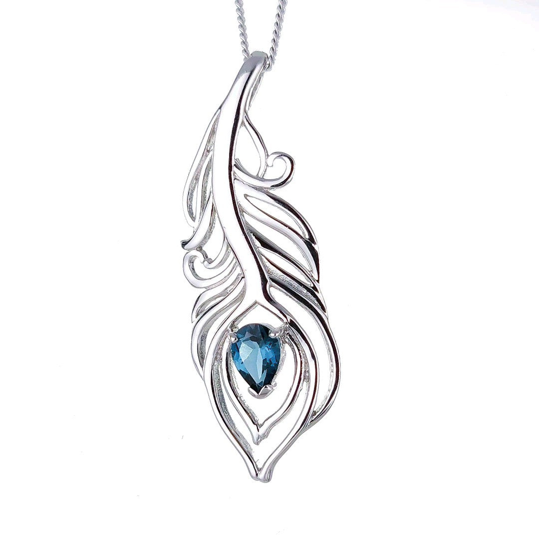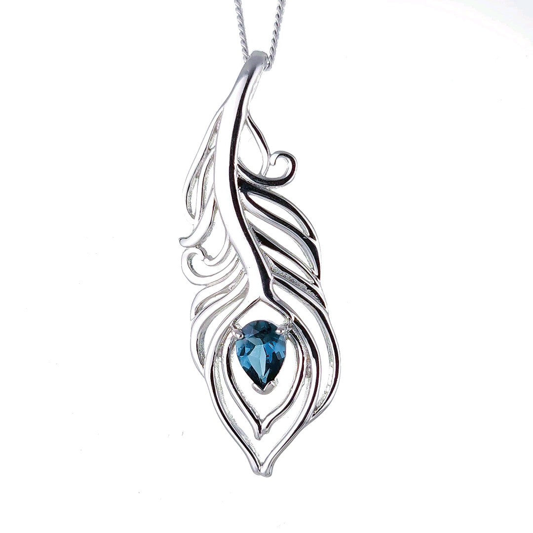London Blue Topaz Necklace Peacock Feather Pendant Sterling Silver Boxed Gift