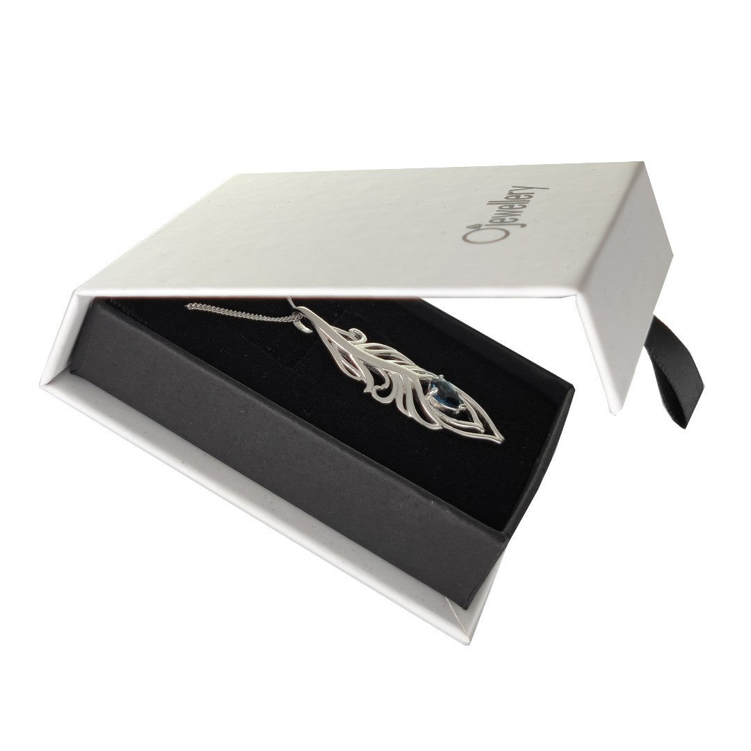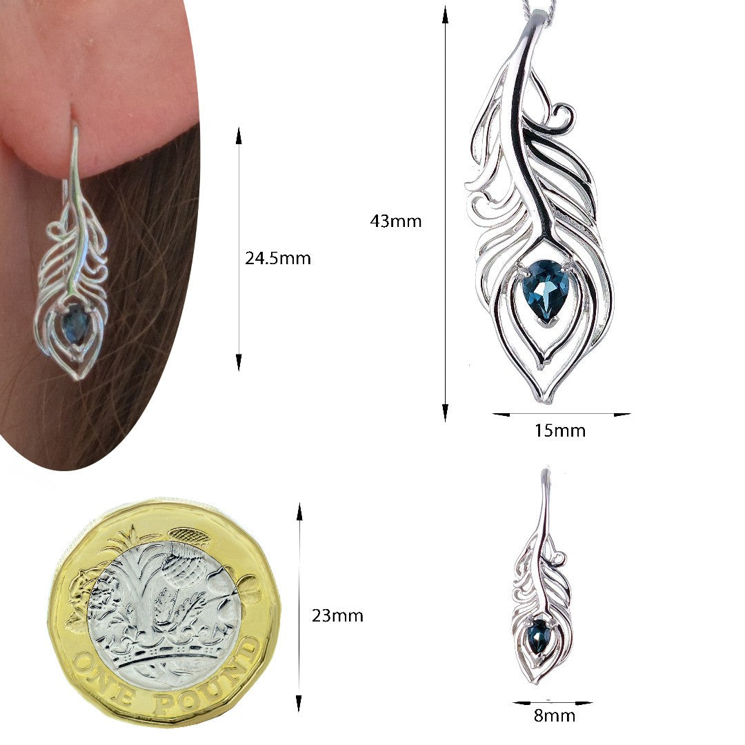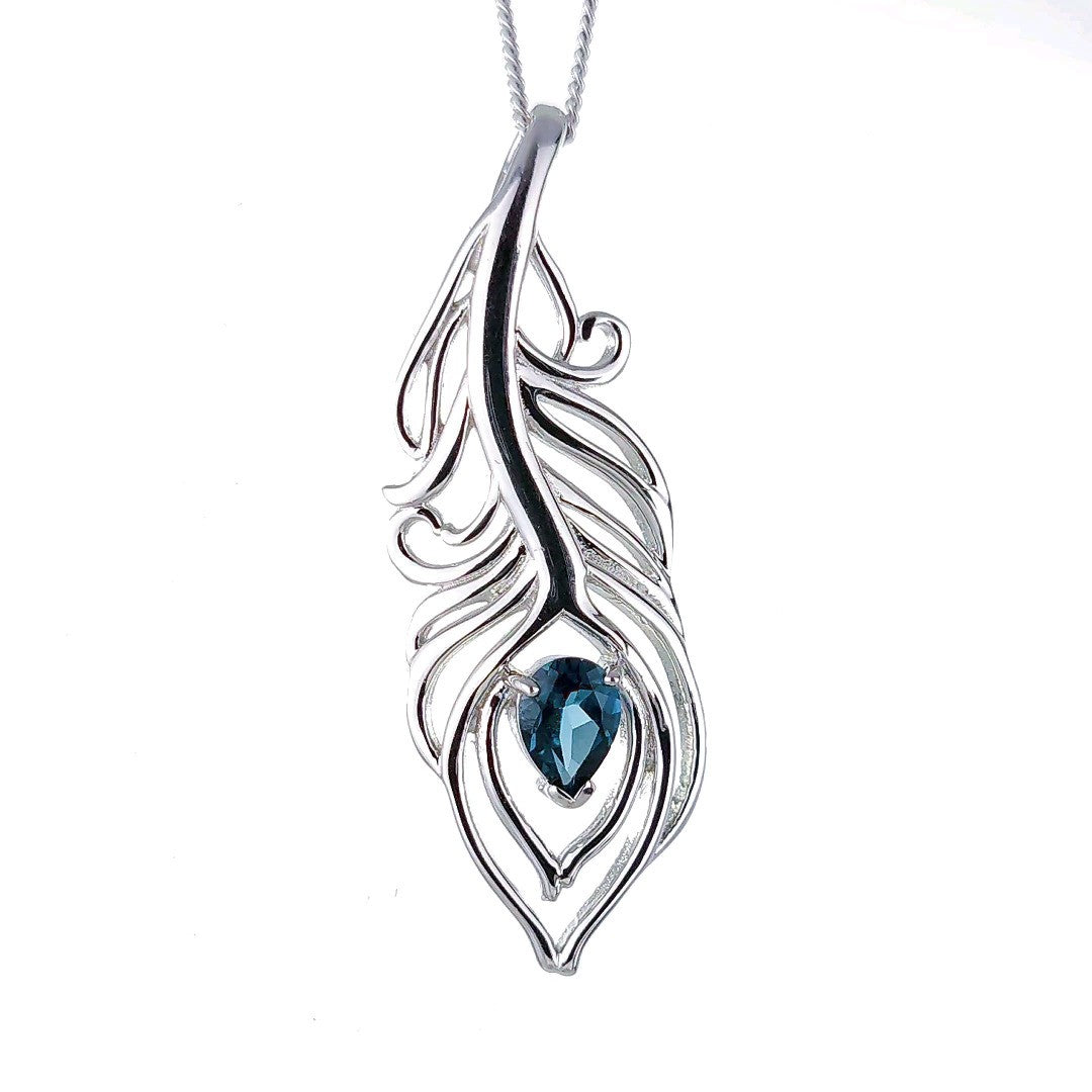 London Blue Topaz Necklace Peacock Feather Pendant Sterling Silver Boxed Gift