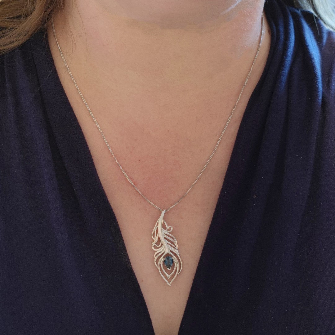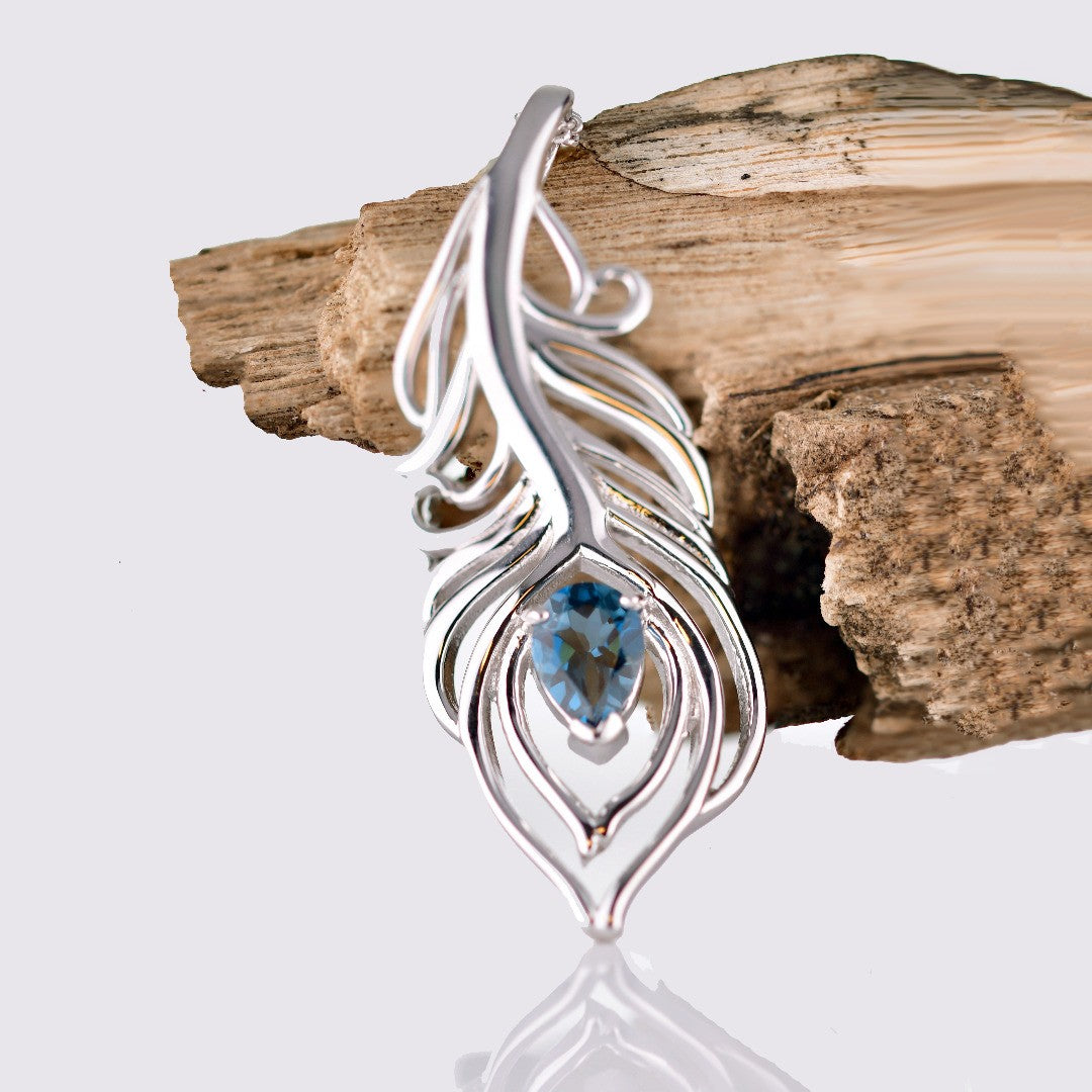 Elegant peacock feather statement pendant set with a pear shaped natural African London blue topaz. The topaz is 7mm long by 5mm giving a total carat weight of 1ct.
