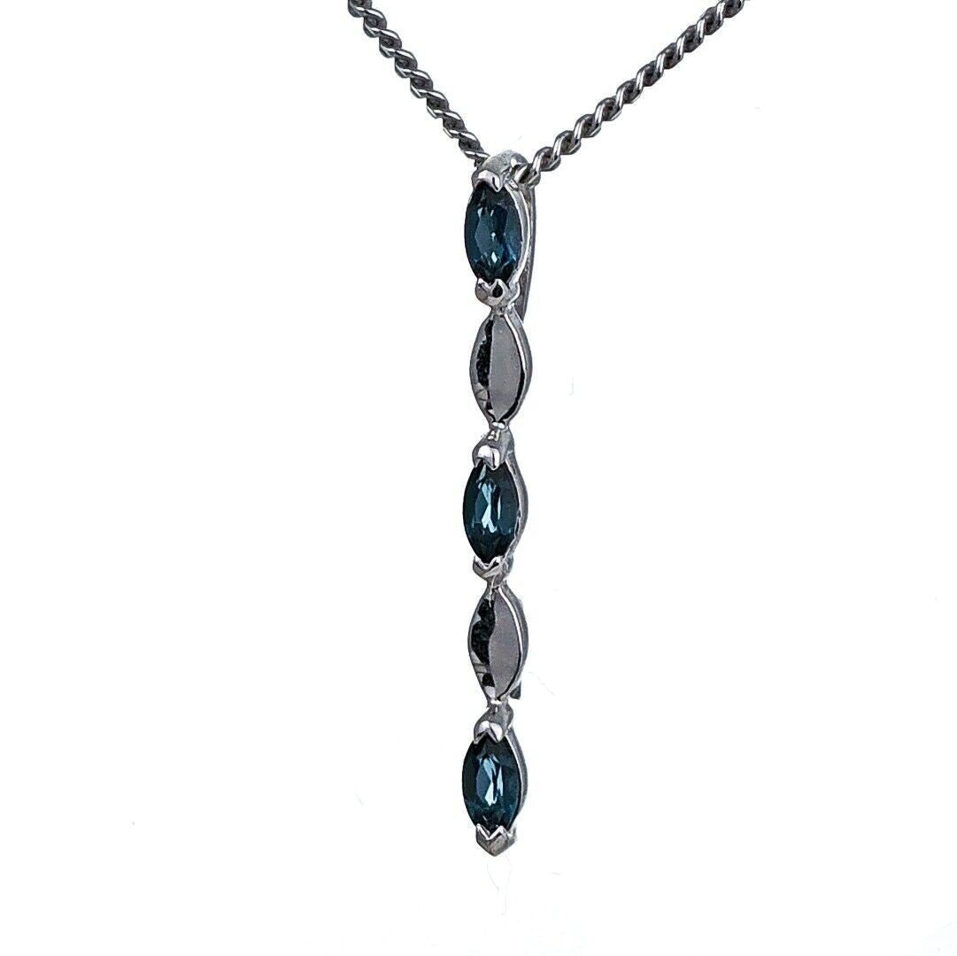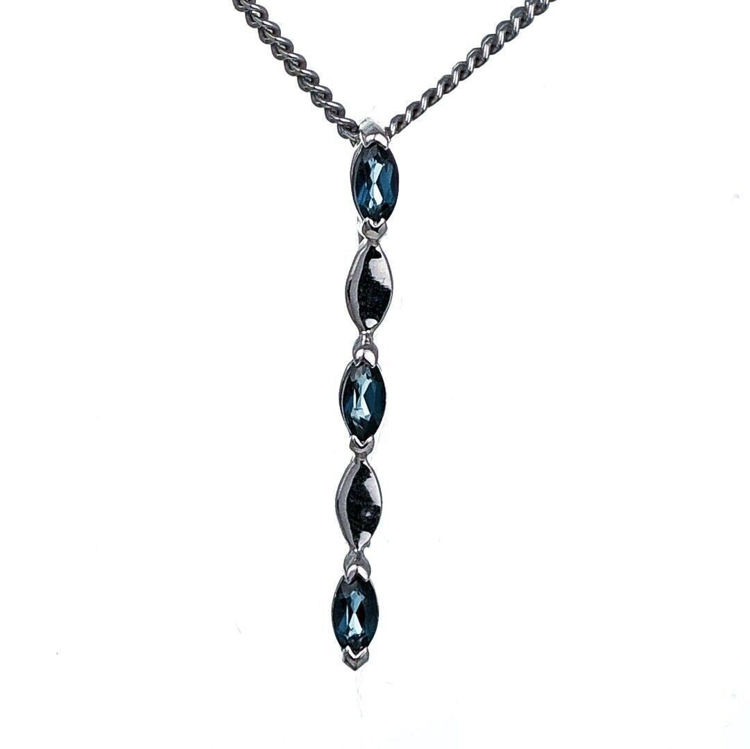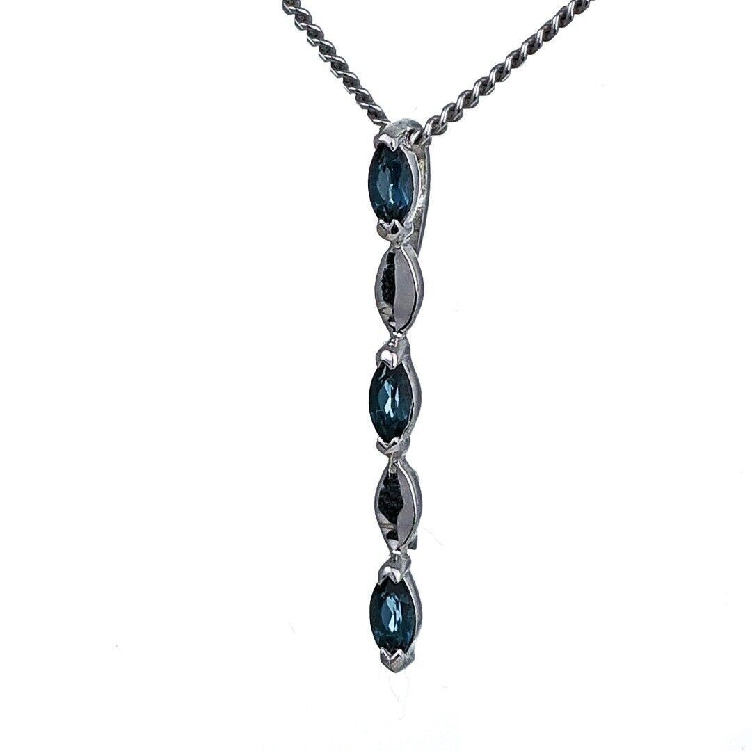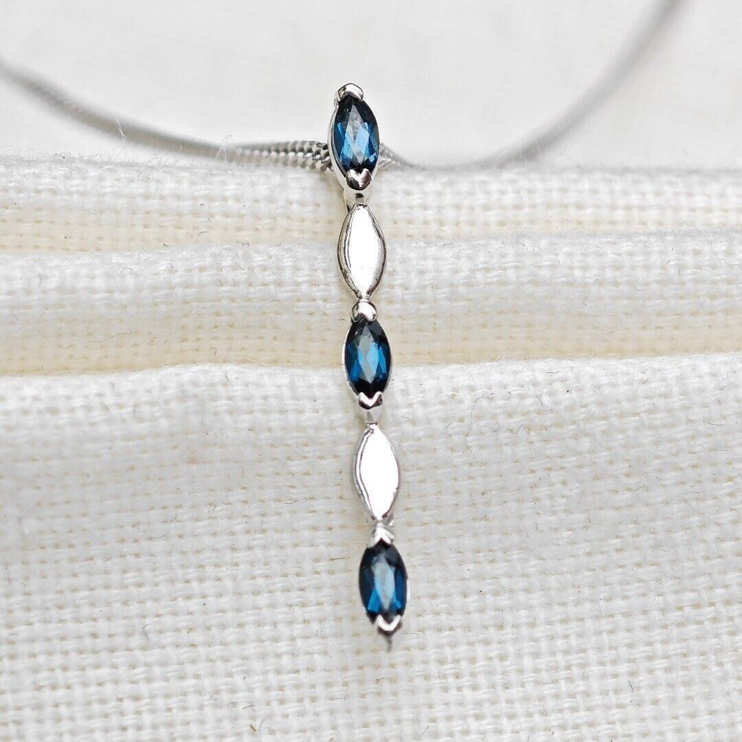 This elegant marquise cut London blue topaz drop pendant is made of sterling silver and features three natural blue topaz gemstones from Africa. Each stone measures 4 x 2mm, giving an approximate total carat weight of 0.23ct. Blue topaz is associated with calmness, serenity, and loyalty, and is the birthstone for December.