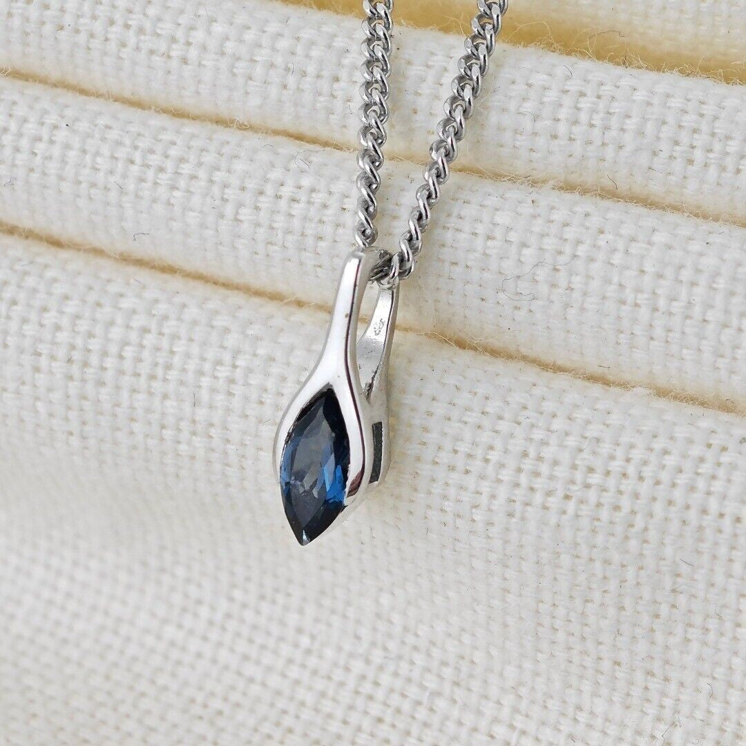 Elegant pendant minimalist solitaire marquise cut London blue topaz, set in a raised partial rubover setting made of sterling silver to allow light to the back of the stone and show off its natural sparkle. The stone measures 6x3 mm.