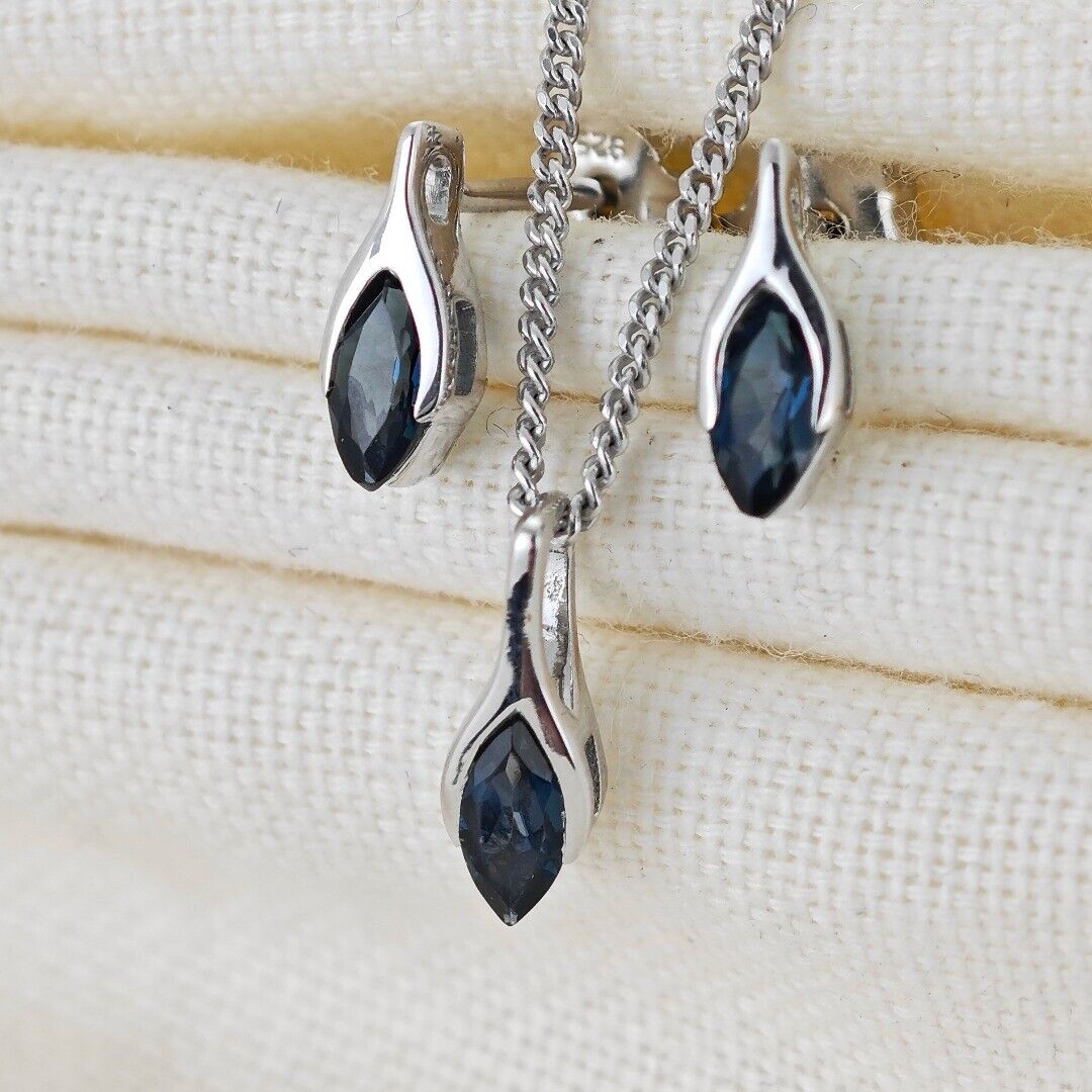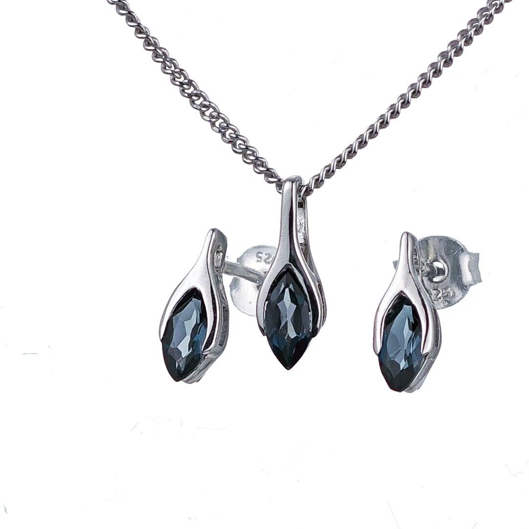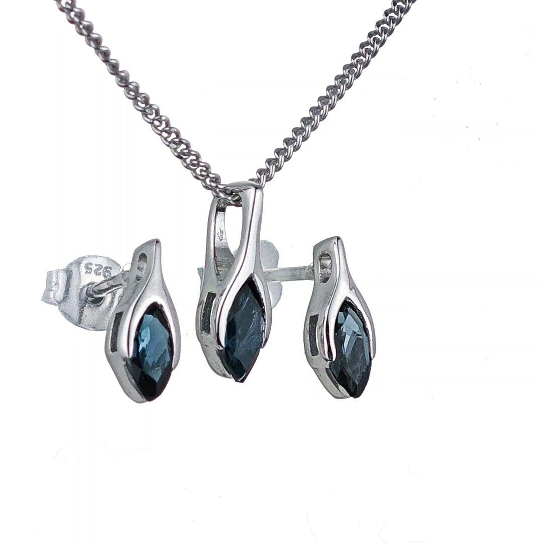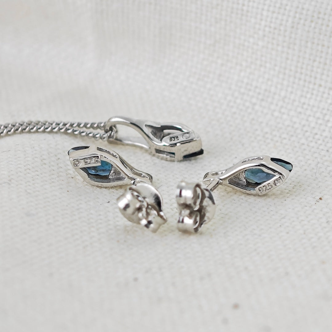 London Blue Topaz Set Necklace Earrings Sterling Silver Studs Minimalist Marquise