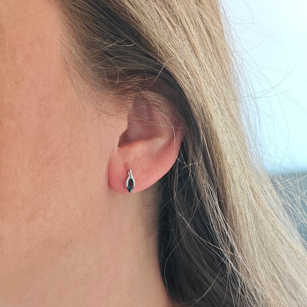 Elegant pendant and matching stud earrings minimalist solitaire marquise cut London blue topaz, set in a raised partial flush setting made of sterling silver to allow light to the back of the stone and show off its natural sparkle. The stones each measure 6x3 mm.