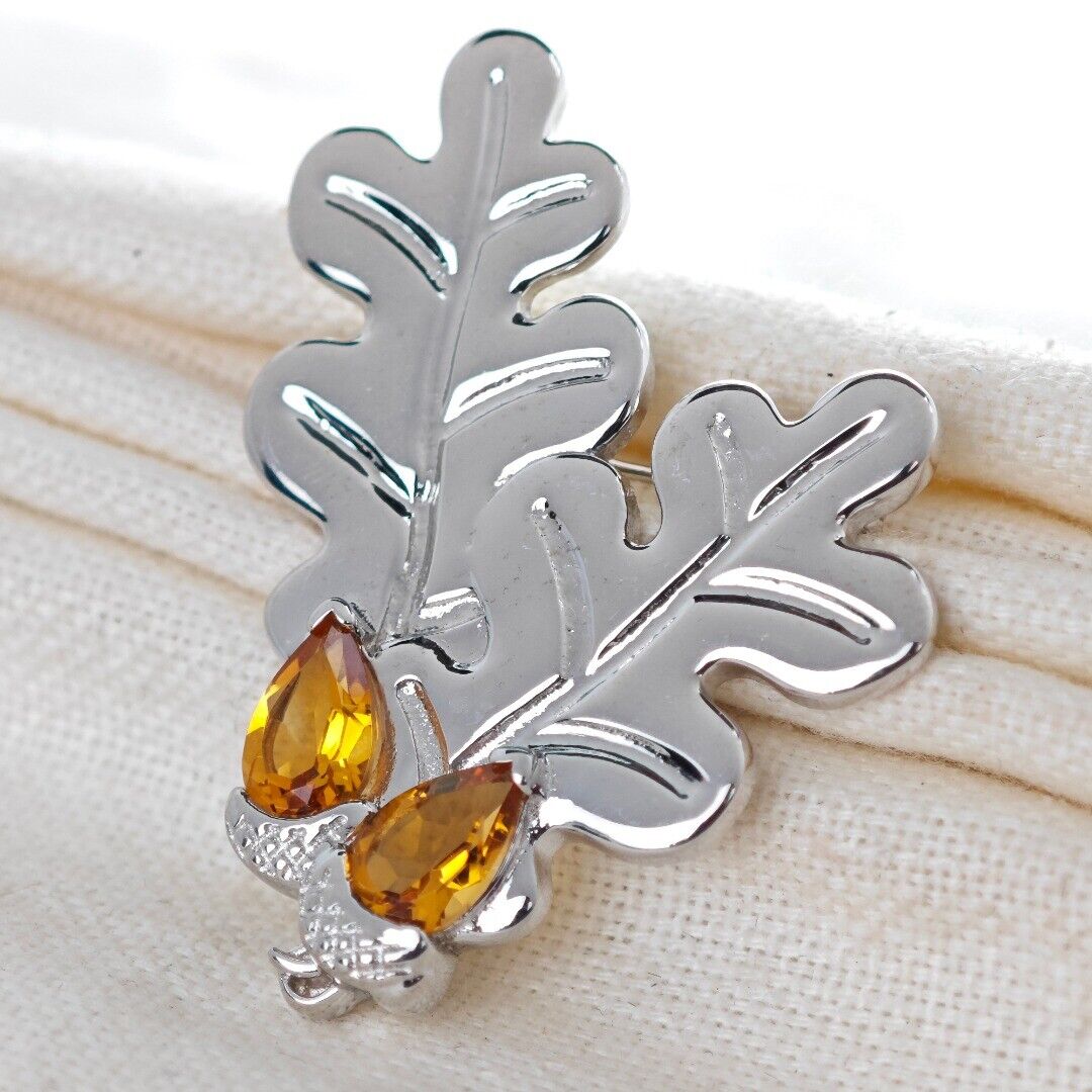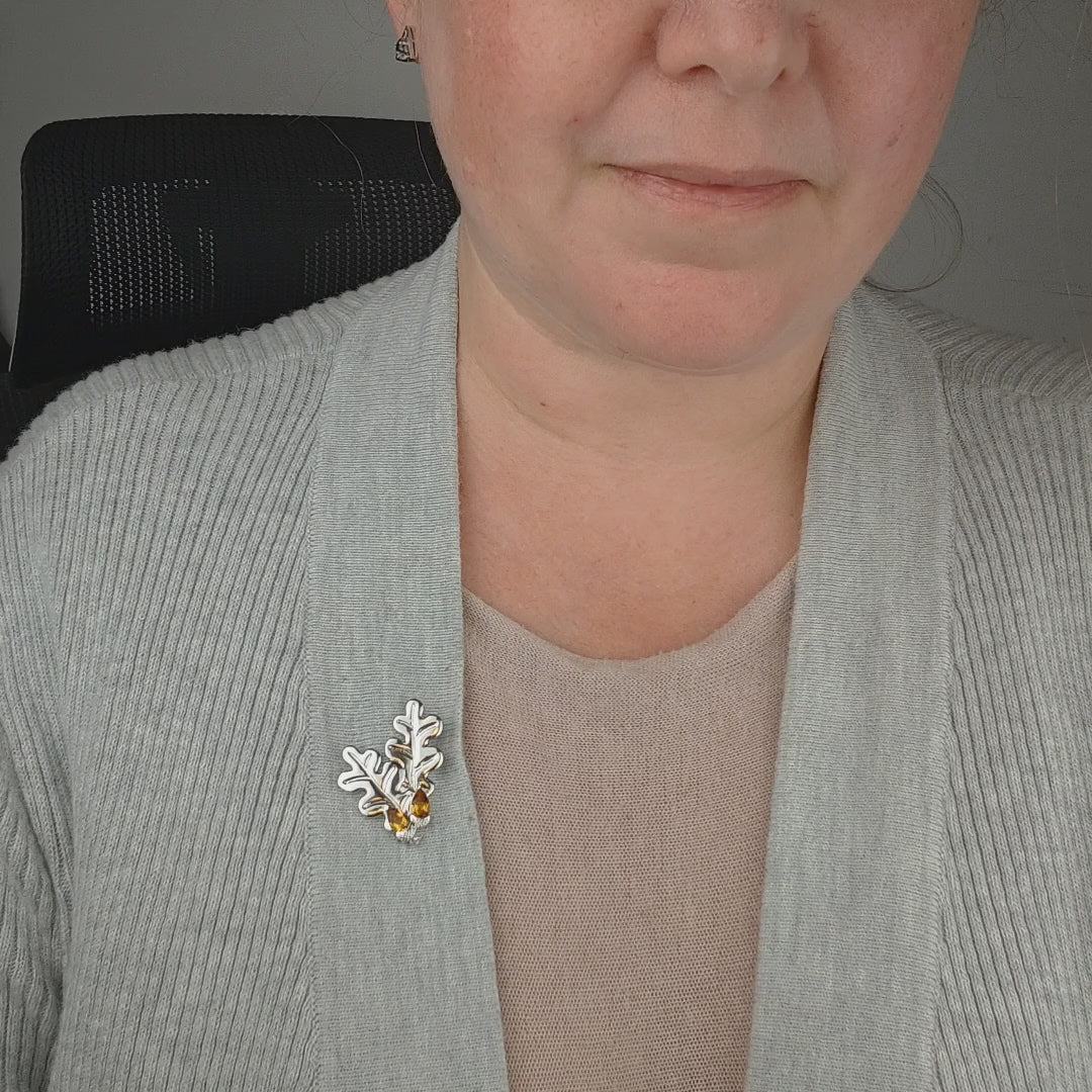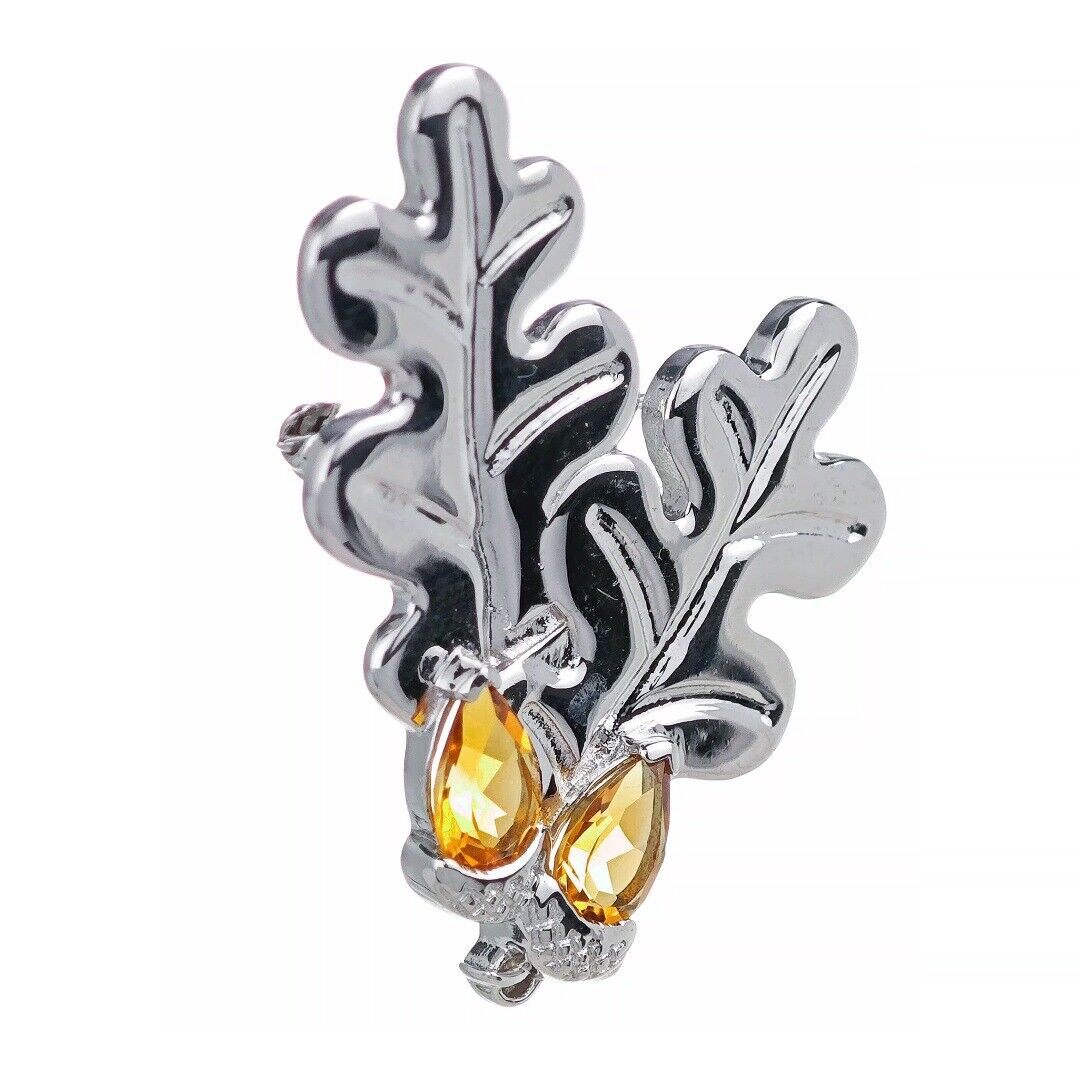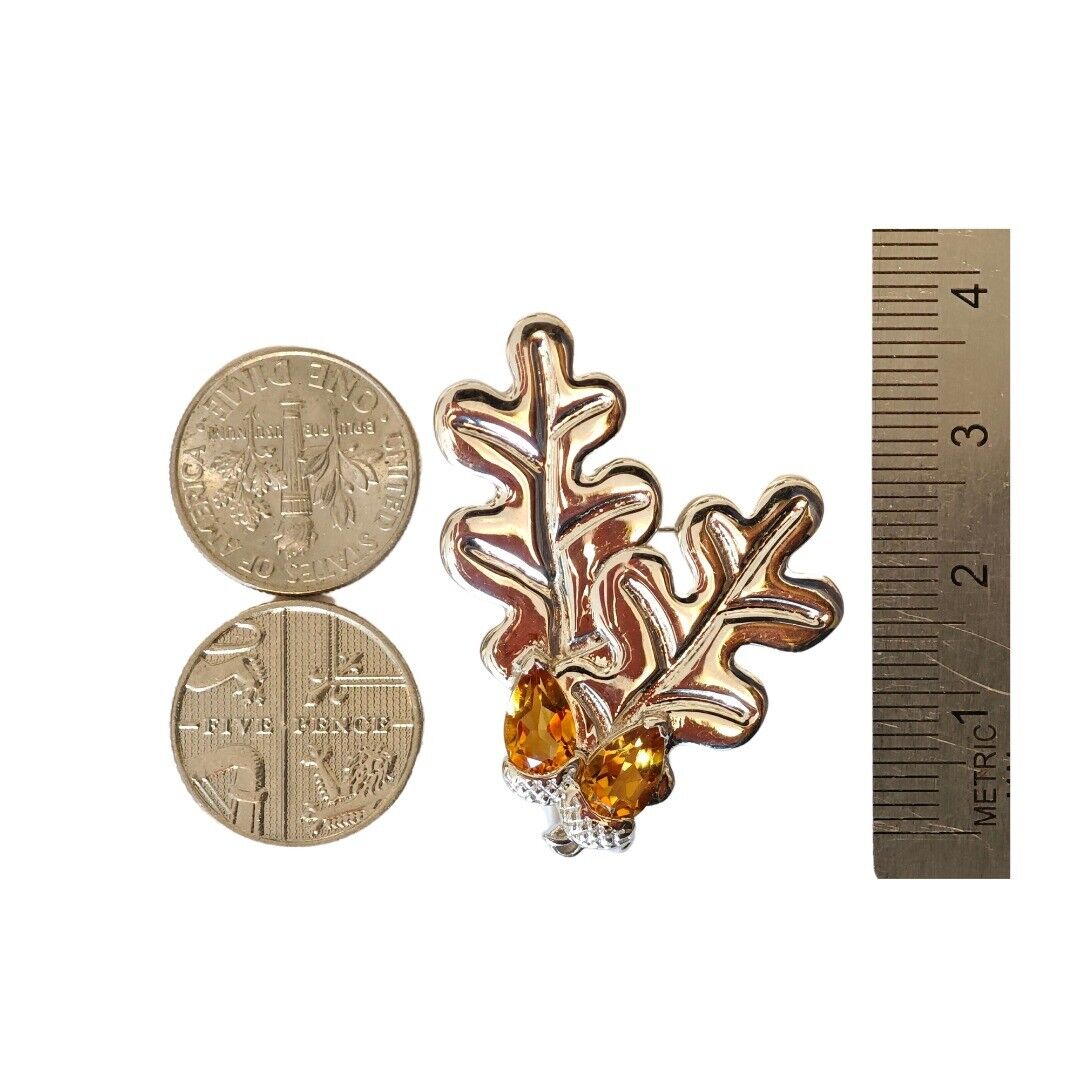 Two radiant Citrine pear gemstones, meticulously set to resemble acorns, nestle amongst the veined oak leaves. The vibrant natural African citrines, each measure 8x6mm, add a touch of warmth and symbolism to this enchanting piece.