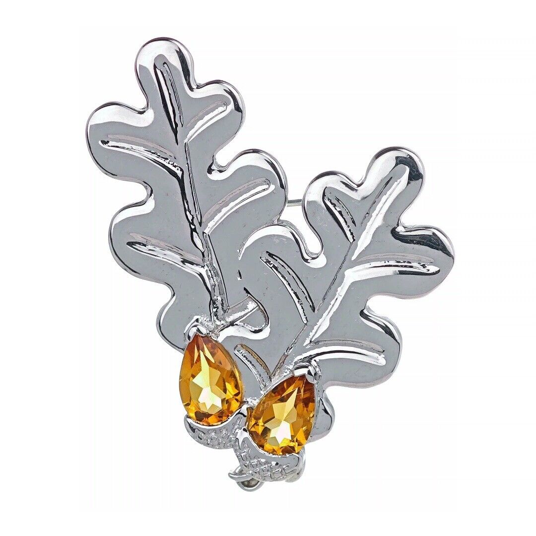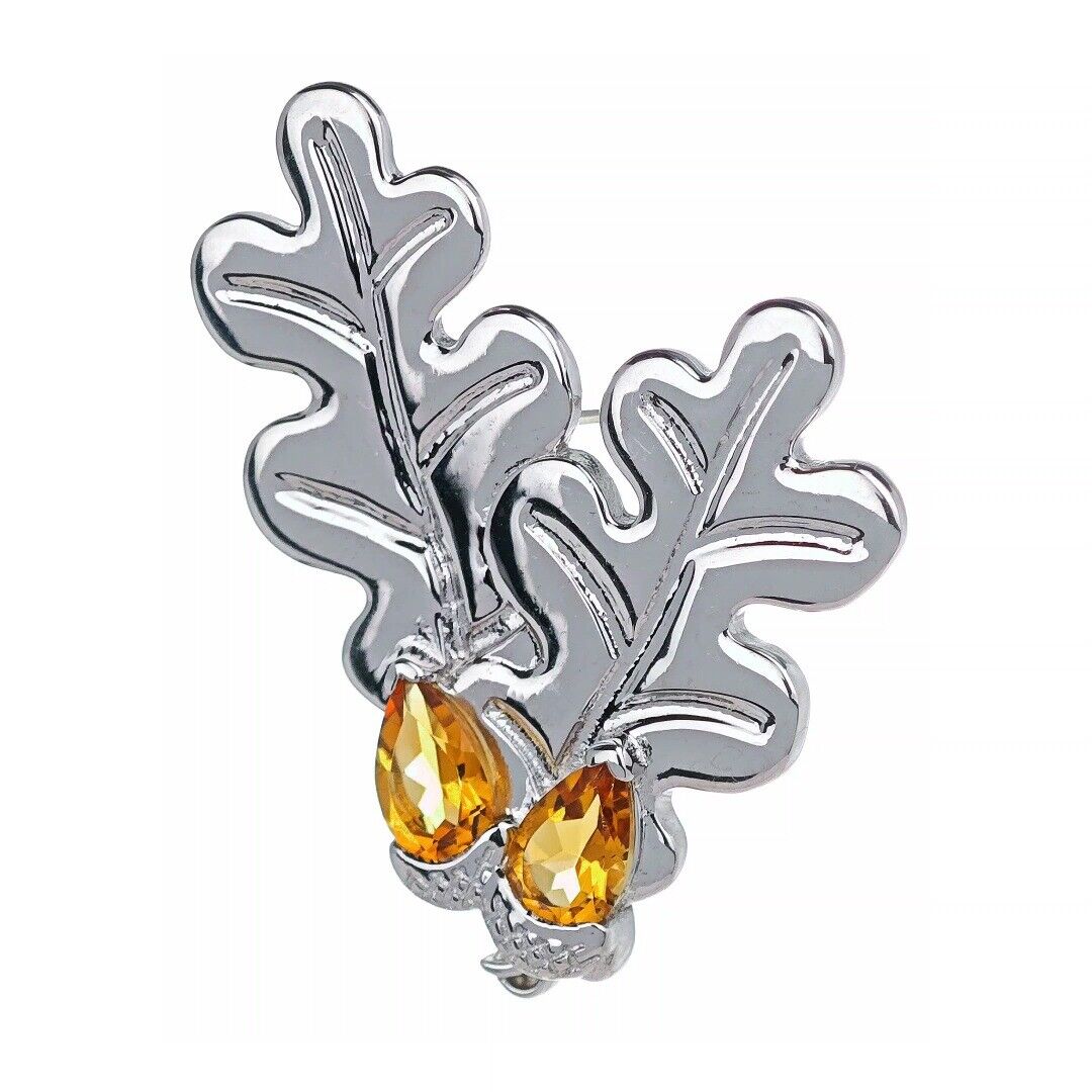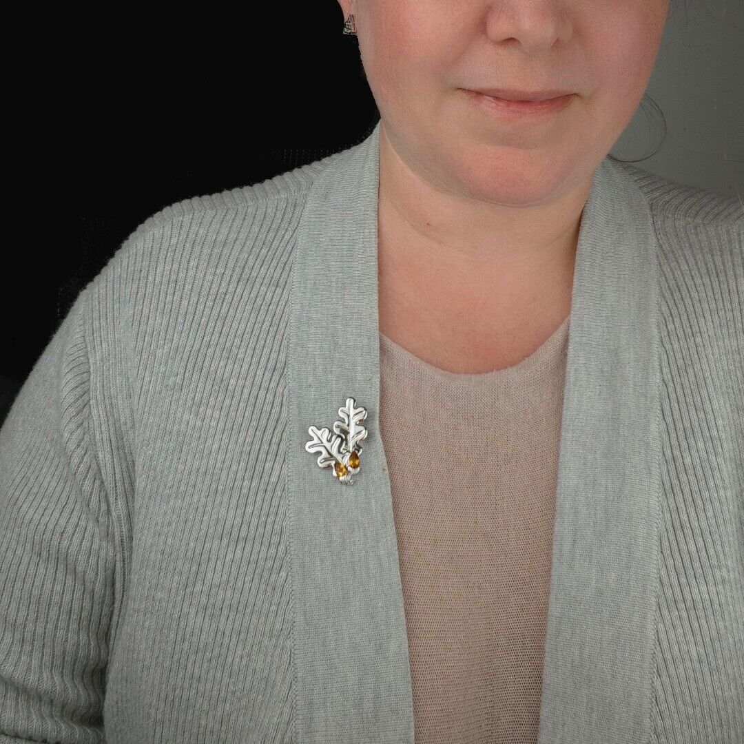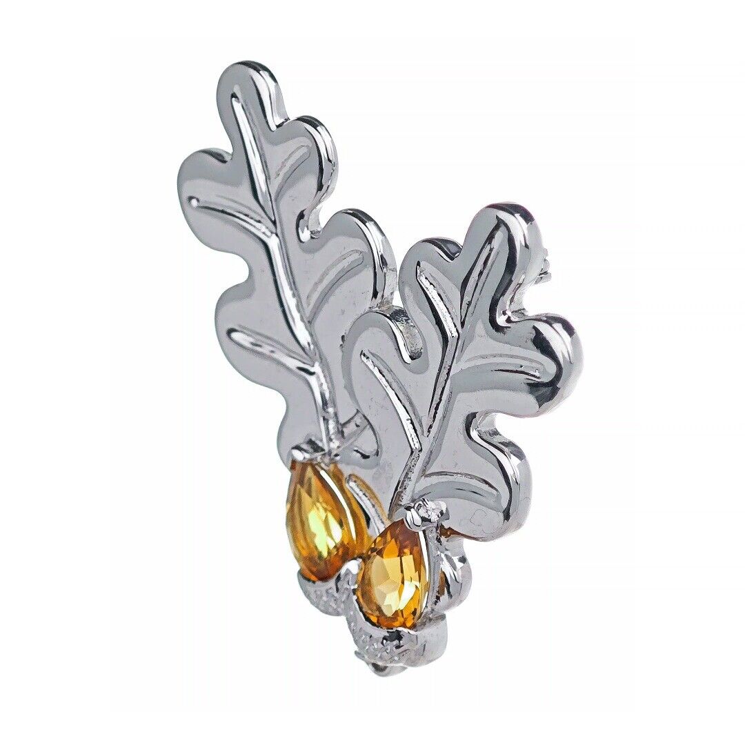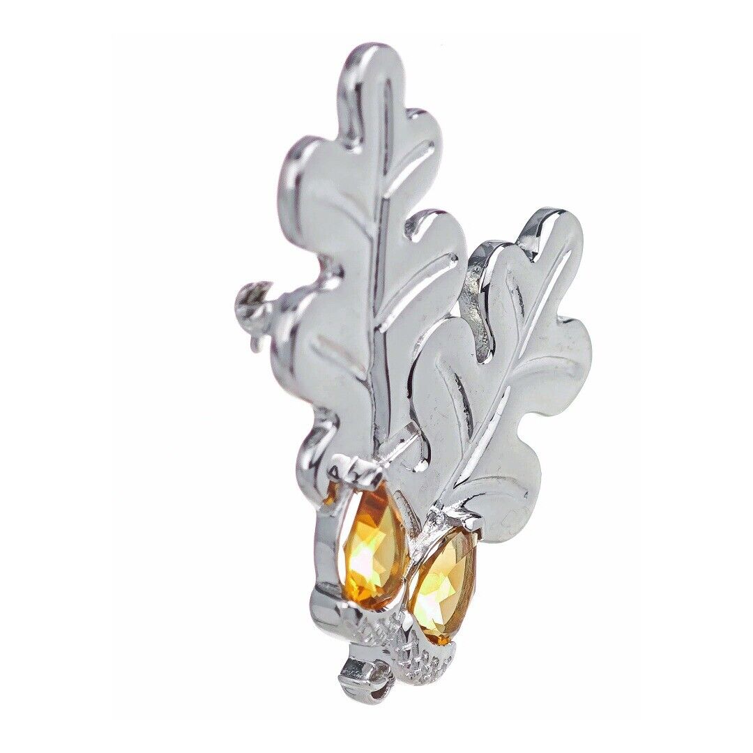 Two radiant Citrine pear gemstones, meticulously set to resemble acorns, nestle amongst the veined oak leaves. The vibrant natural African citrines, each measure 8x6mm, add a touch of warmth and symbolism to this enchanting piece.