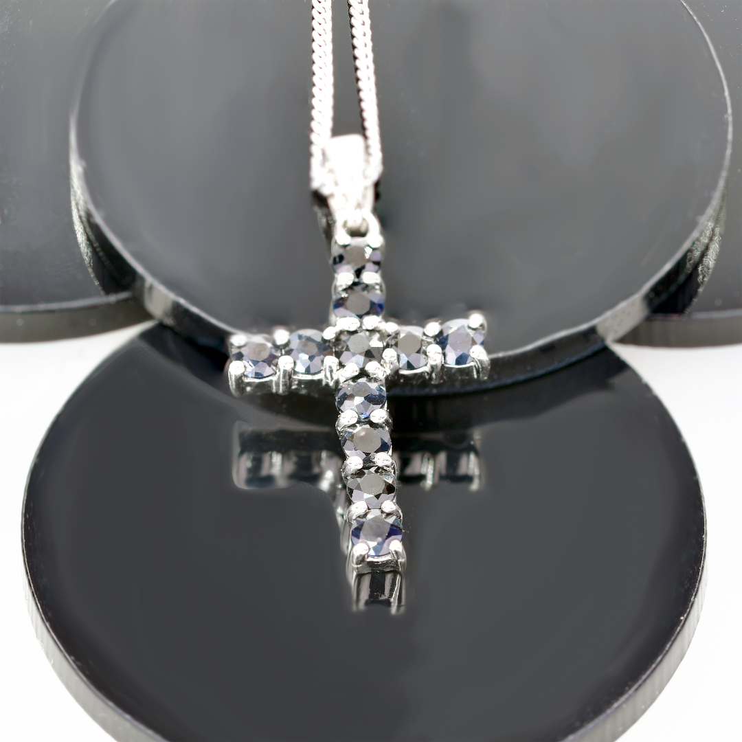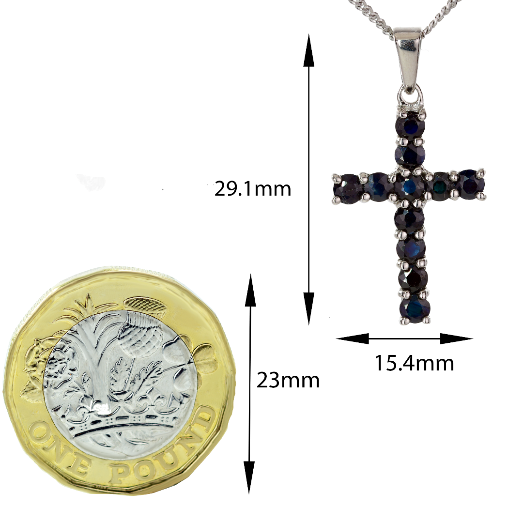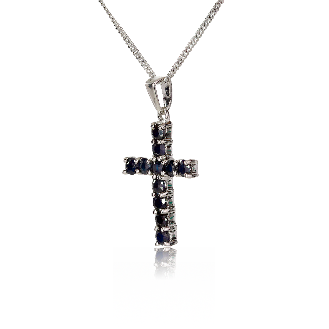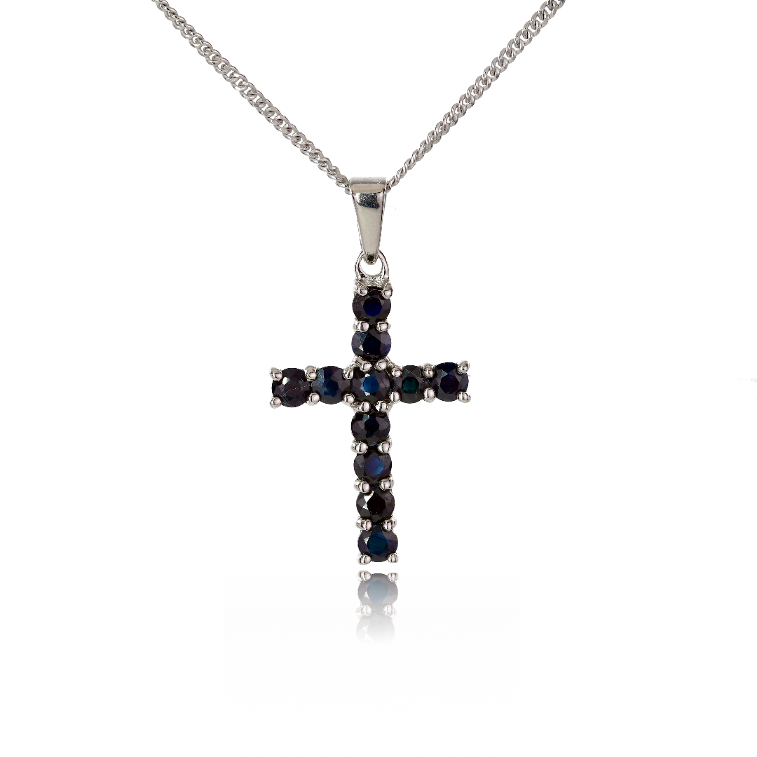 Elegant sterling silver cross pendant set with elegant inky blue sapphires.
