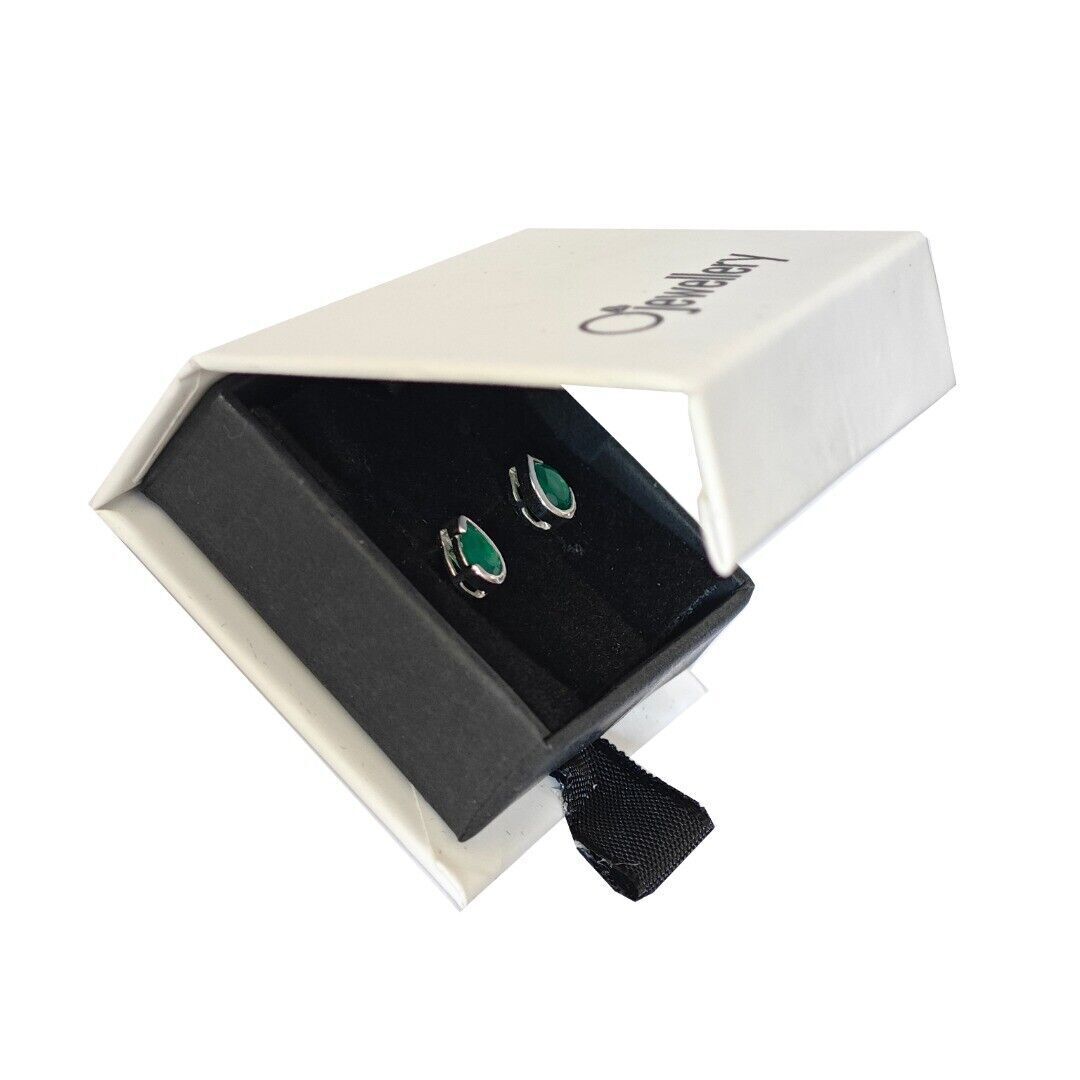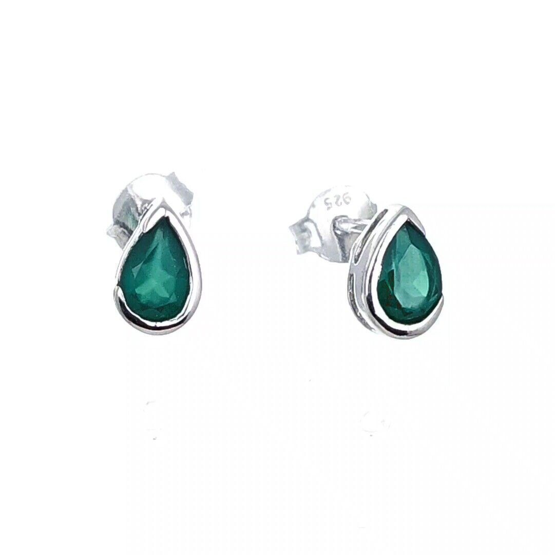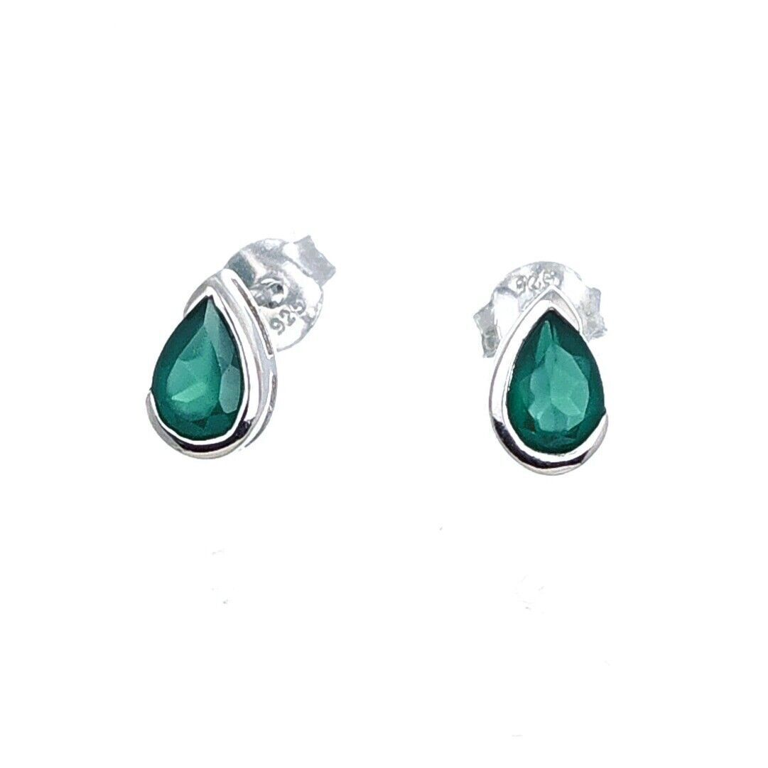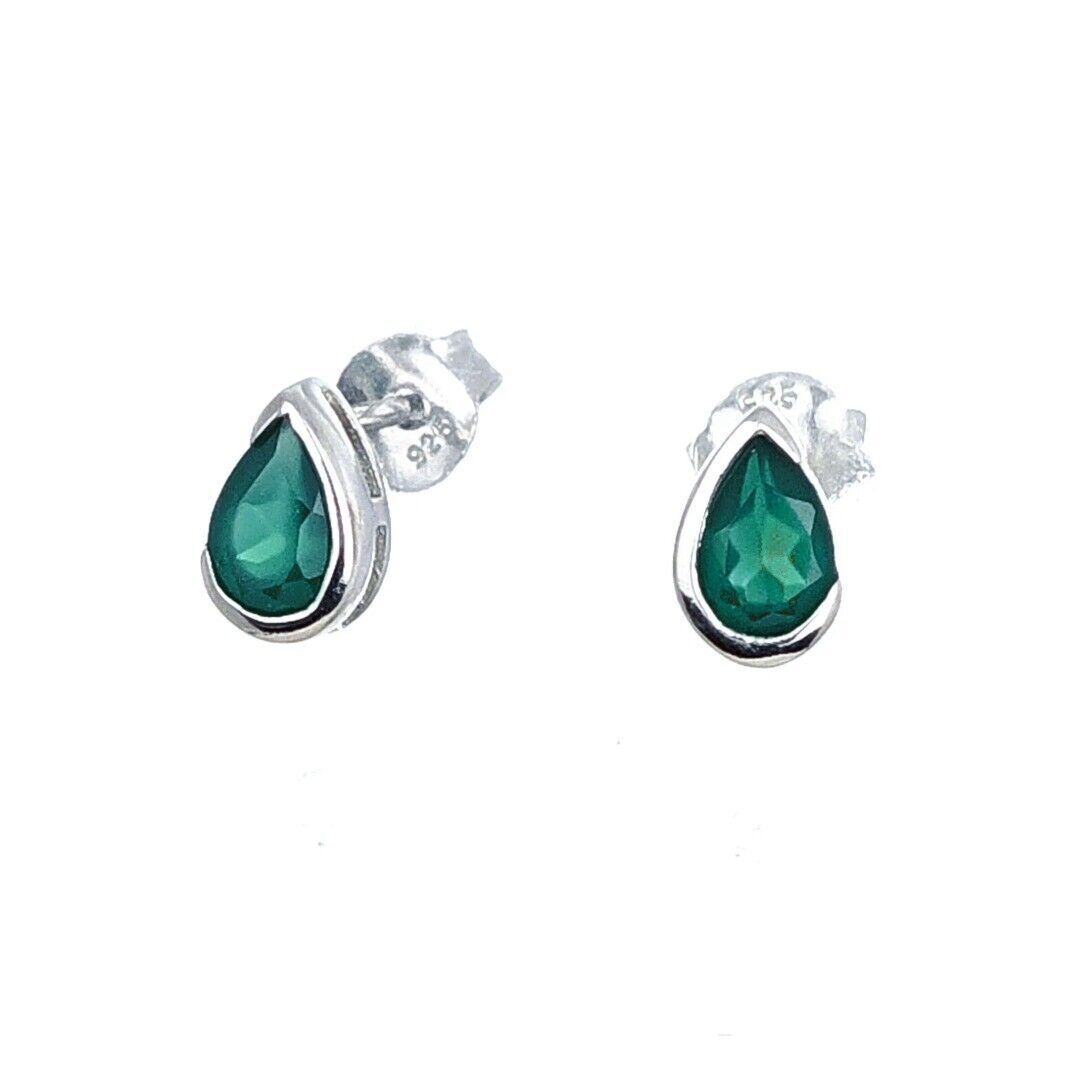 These elegant stud earrings feature pear-shaped natural green onyx stones from India. The stones measure 6x4 mm and are set in a raised rubover setting made of sterling silver to allow light to the back of the stone and show off its natural sparkle. The earrings are finished with a commercial grade rhodium plate to give a high quality shine finish.