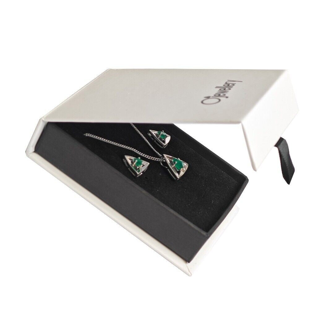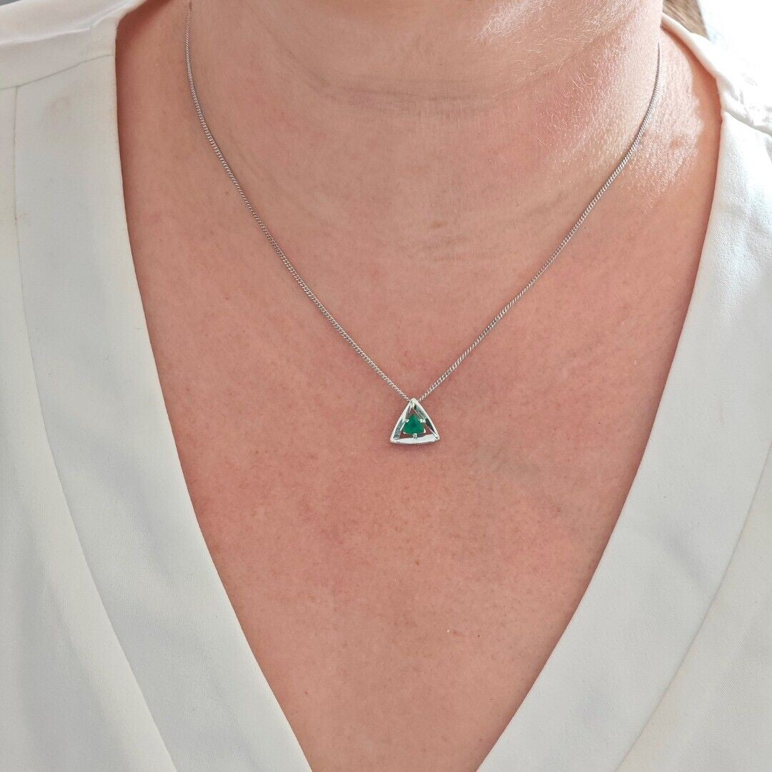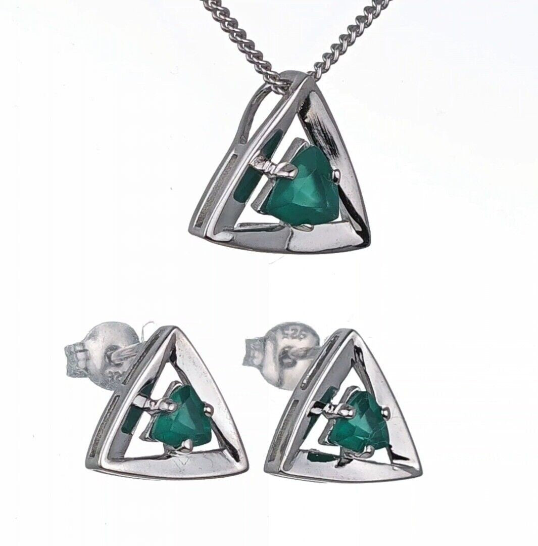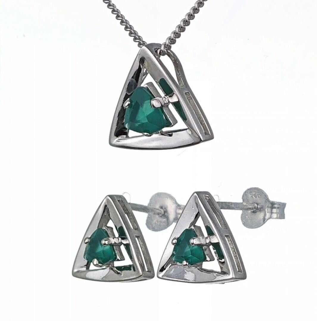 Trillion cut natural stones set in a triangle made of sterling silver. Each stud stone measures 4 x 4mm and the pendant stone is 5x5mm Onyx are associated with strength intelligence and discipline. They are the birthstone for May and the zodiac sign Taurus. This elagent set is suitable to wear for daytime or evening wear. Finished with a commercial grade rhodium plate to give a high quality shine finish. Supplied in an Ojewellery presentation box, within a ribbon handled gift bag, complete with product information authenticity card with space for a gift message and a jewellery cleaning cloth to keep your jewellery in ready to wear condition. Our jewellery packaging is from an FSC chain of custody audited supplier and our very short supply chains mean we are able to trace our natural gemstones back to country of origin. Specification: Fastening: Butterfly Earring Drop: 10.2mm Earring Width: 10.7mm Weight of pair:1.9g Chain Curb Link 18 inch with lobster clasp fastening Pendant Drop: 11.5mm Pendant Width: 12.6mm Weight: 3.5g Stones Natural Indian Green Onyx trillion cut 2qty 4 x 4mm, 1 qty 5 x 5mm